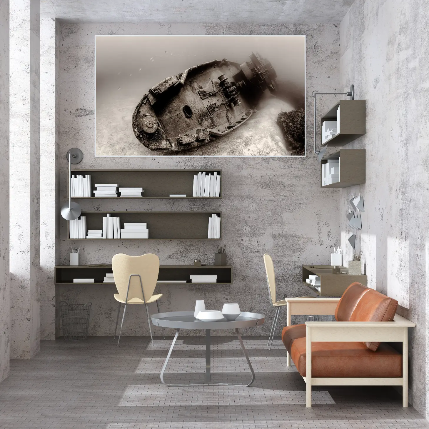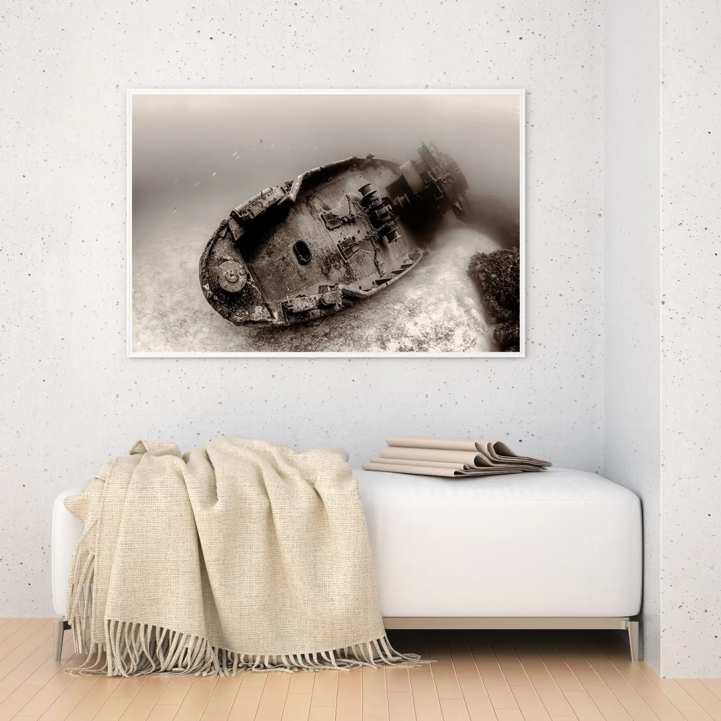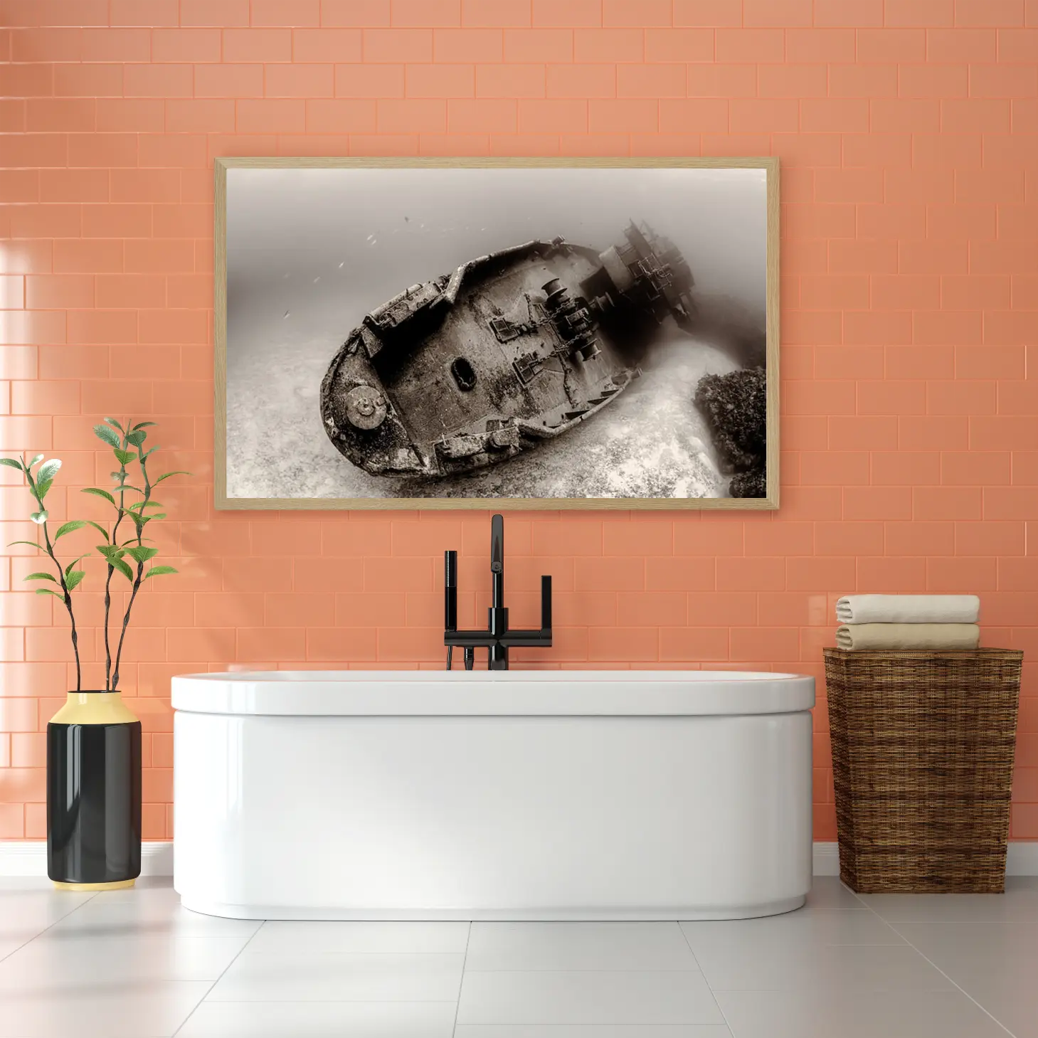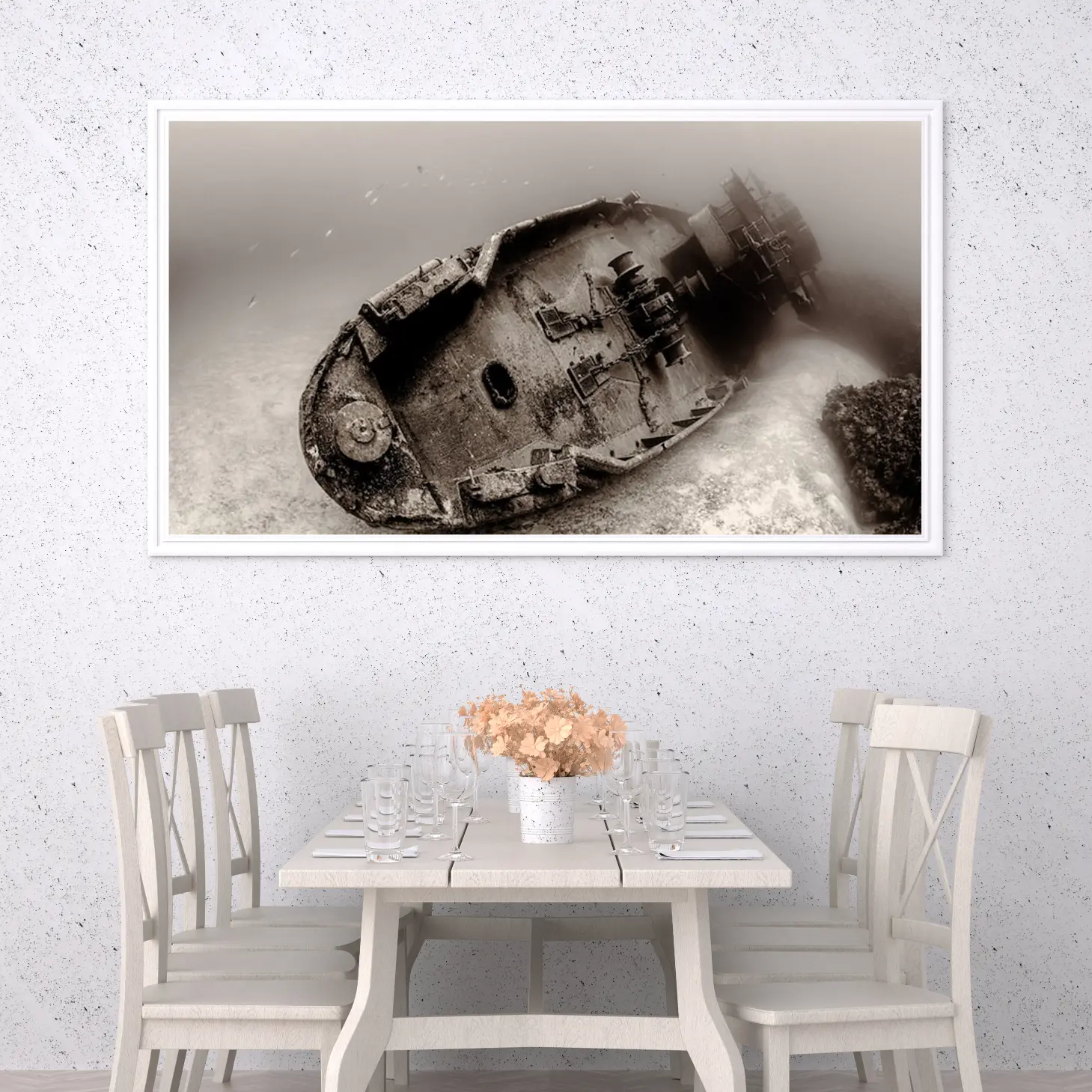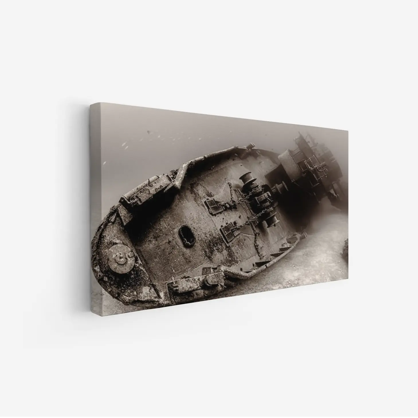 تتجلى في هذه اللوحة الفنية رؤية فريدة تأخذك إلى أعماق التاريخ، حيث يظهر مشهد غامض لسفينة غارقة تحت الماء. الألوان الداكنة والظلال العميقة تخلق إحساسًا بالعمق والغموض، مما يضفي على المكان أجواءً من التأمل والحنين. هذه القطعة الفنية ليست مجرد ديكور جداري، بل هي نافذة إلى عالم آخر، تعكس نمط حياة يعشق الفنون التي تحمل قصصًا وتاريخًا.