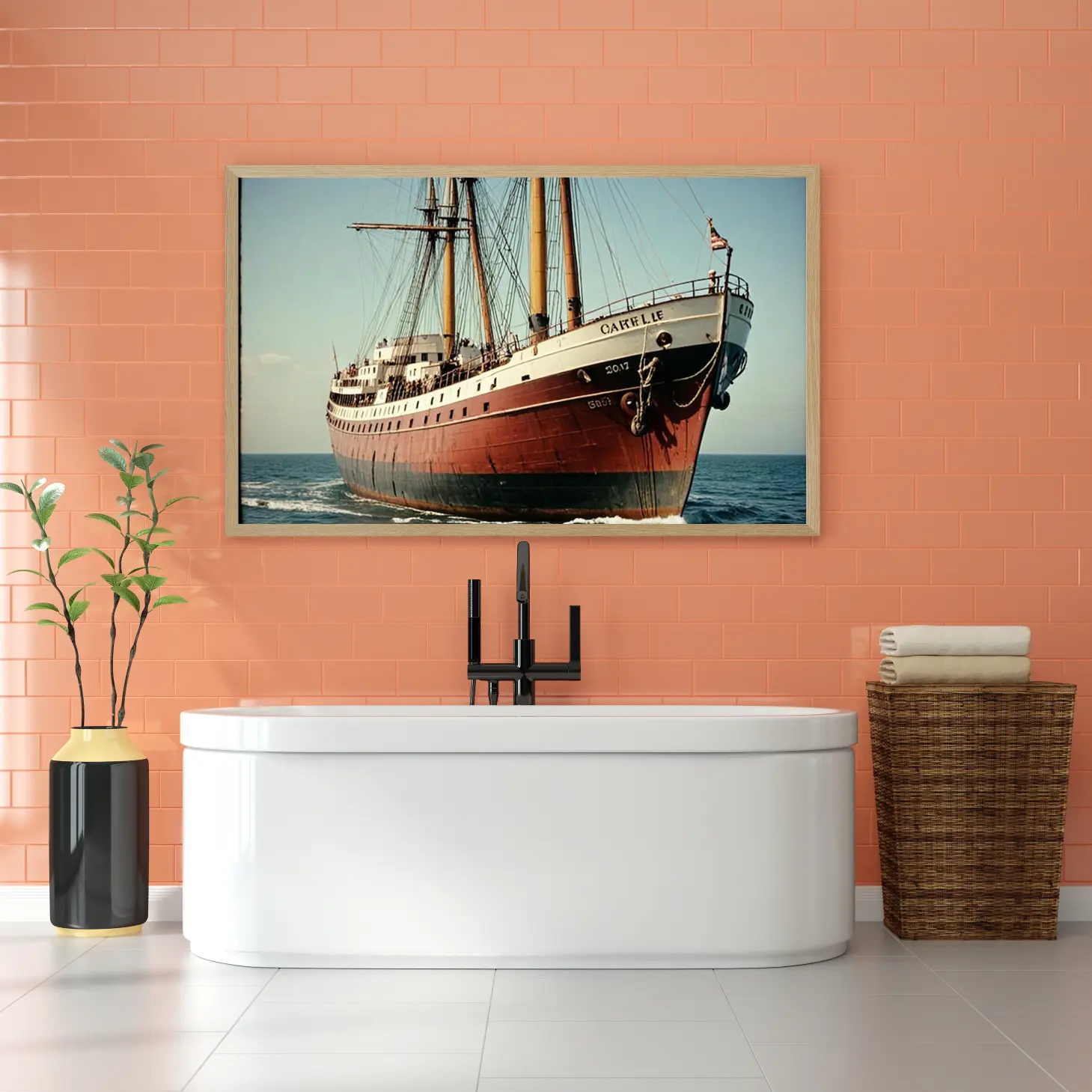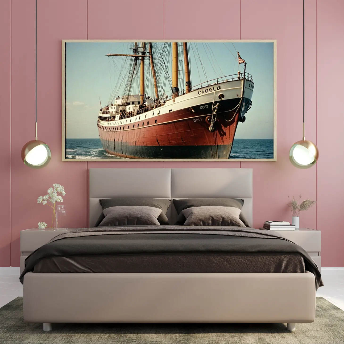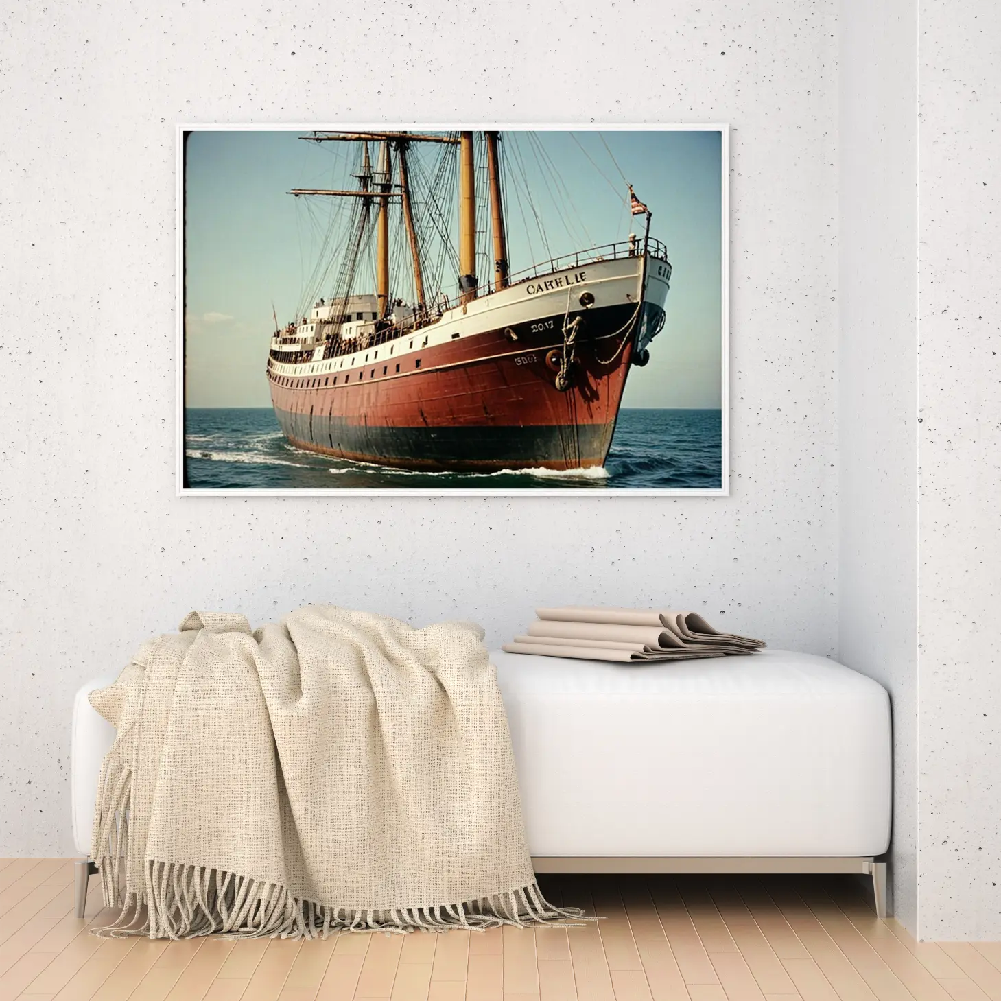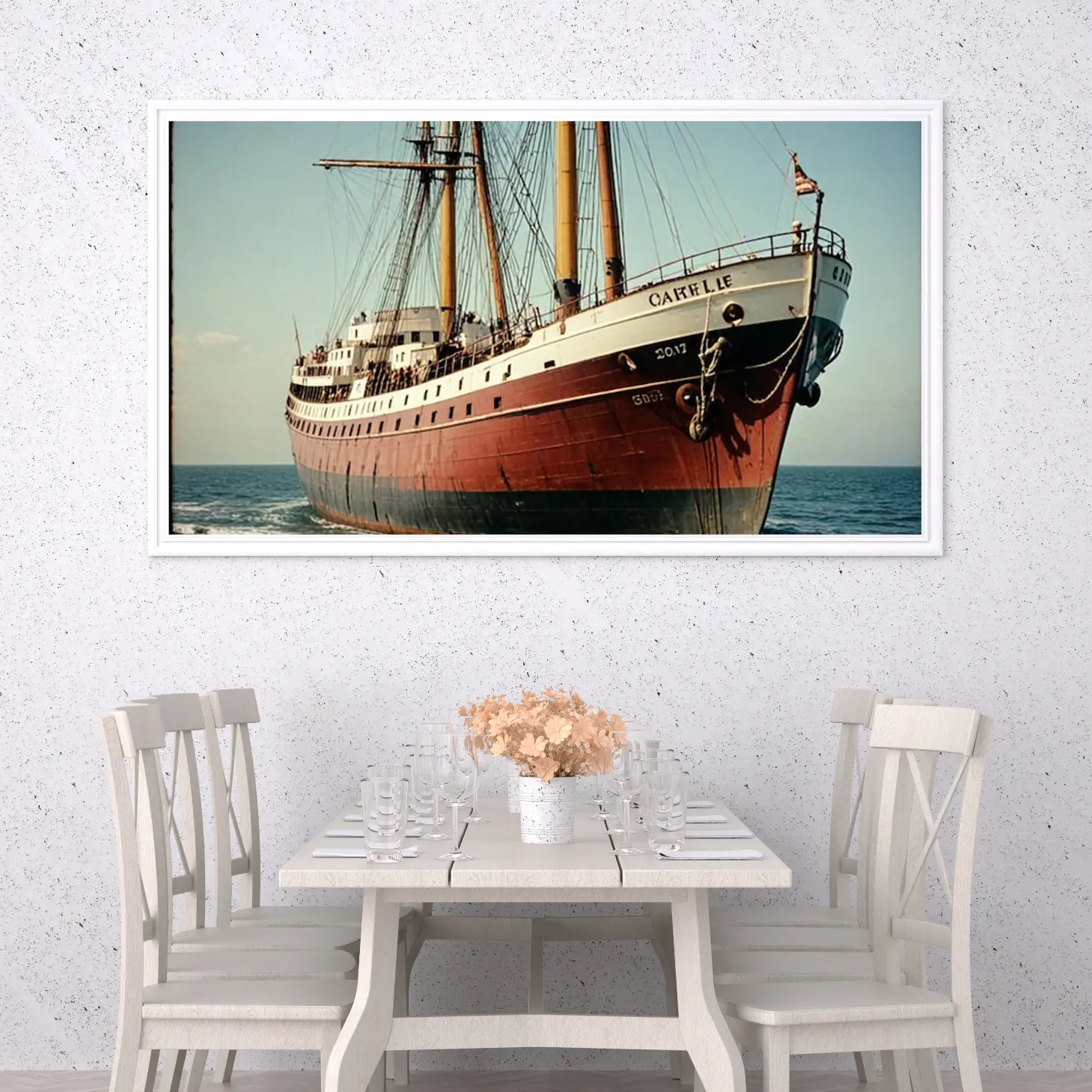 لوحة بحرية لسفينة تاريخية بألوان دافئة وجو هادئ، تعكس جمال البحر والسماء الزرقاء، لوحات طبيعة، لوحات كانفاس.