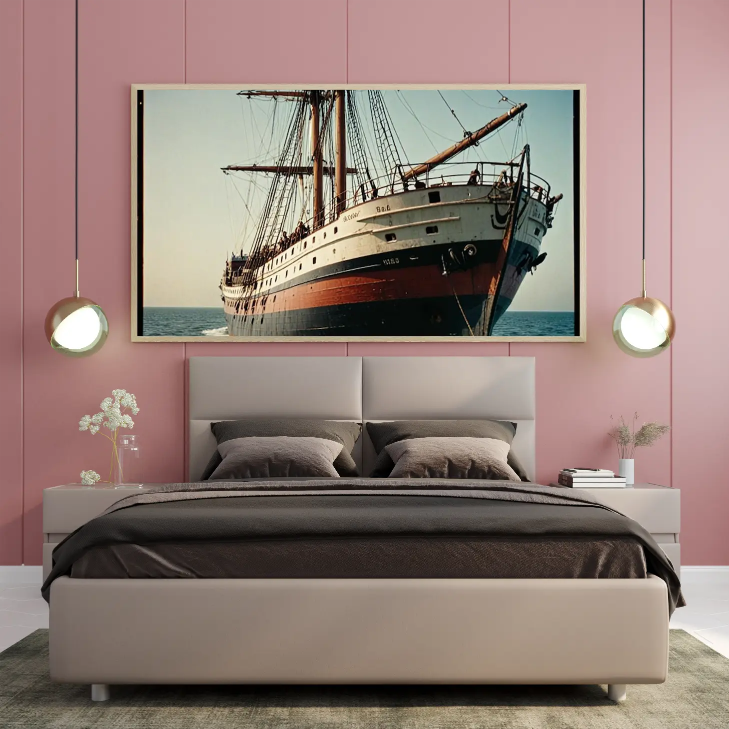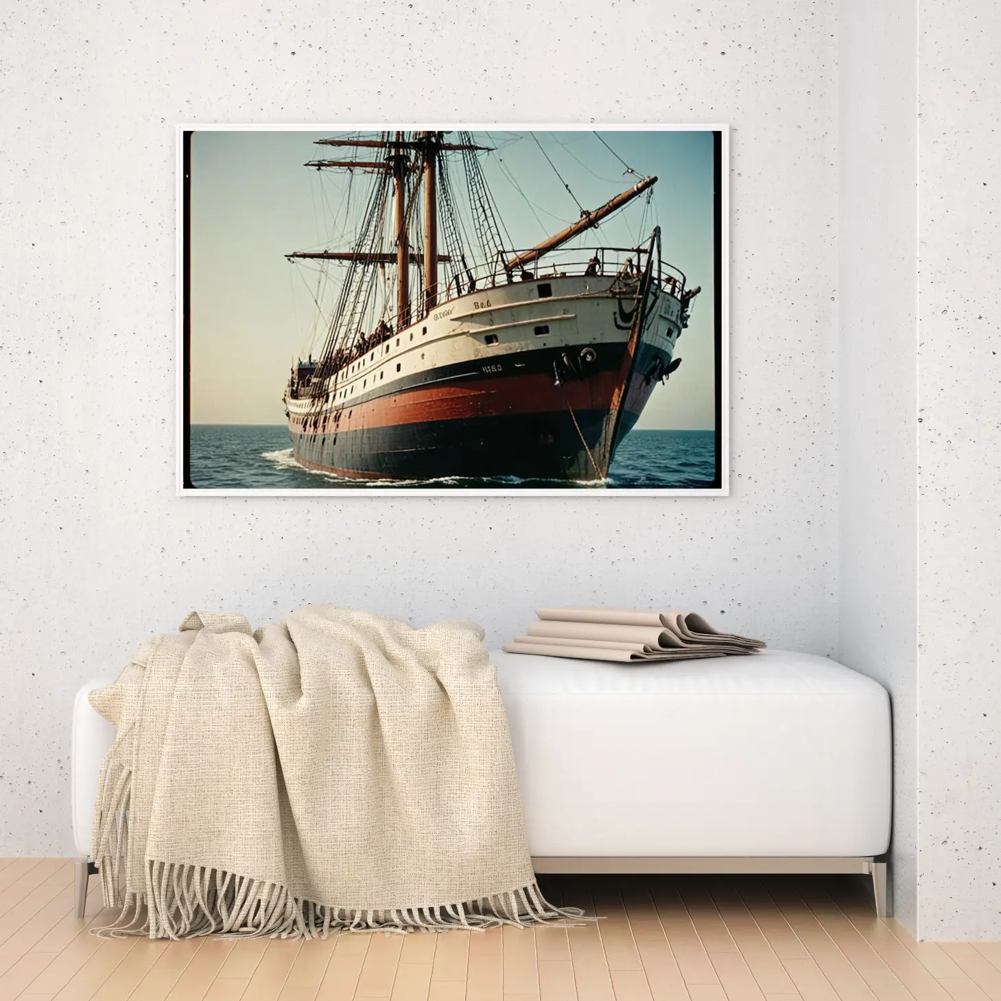لوحة بحرية لسفينة تاريخية بألوان دافئة وجو هادئ، تعكس روح المغامرة والبحرية، لوحات فنية مودرن، لوحات كانفاس.