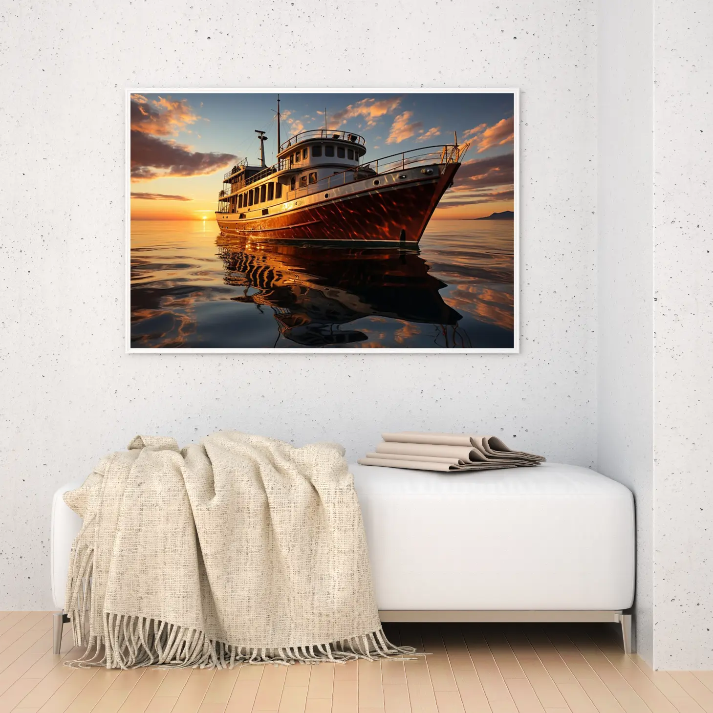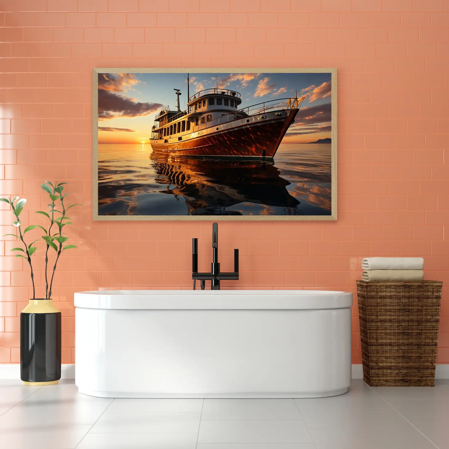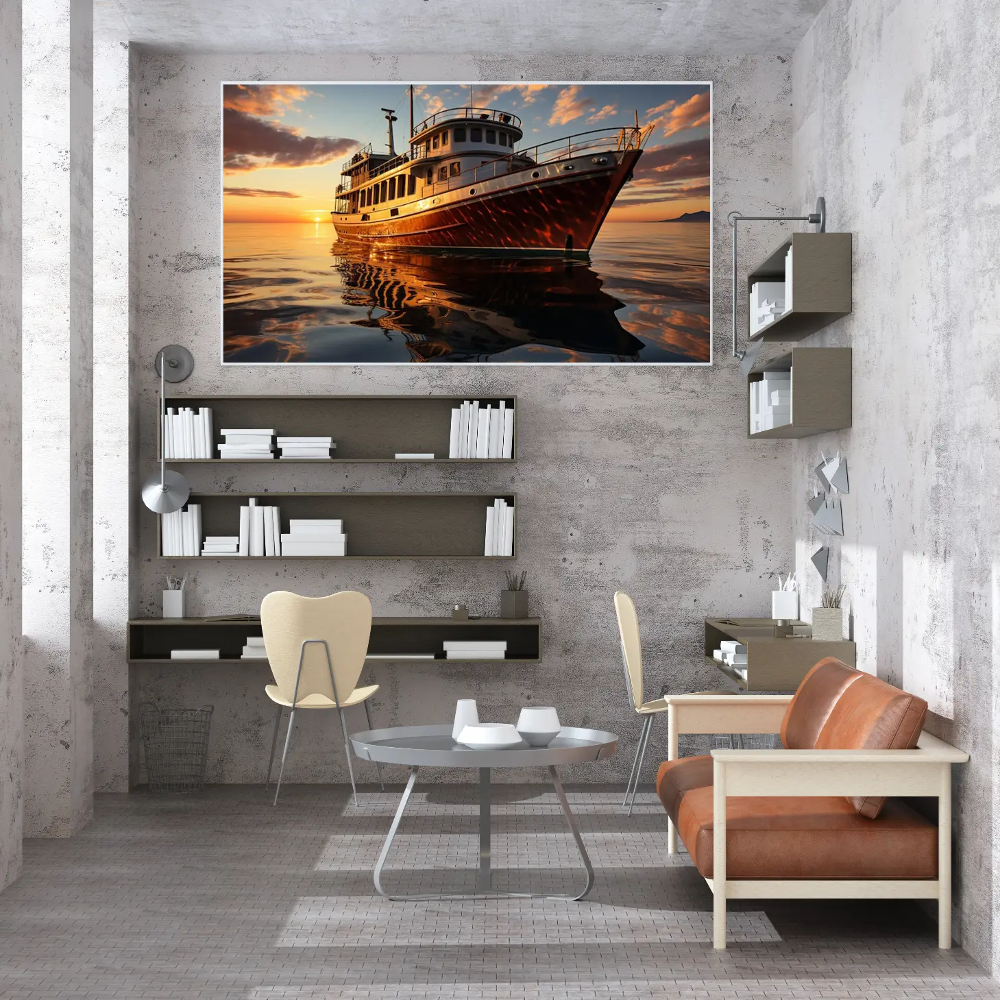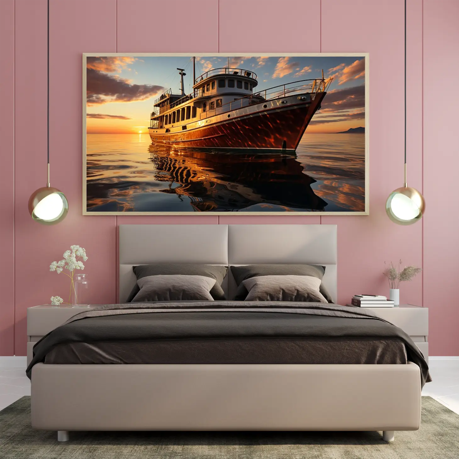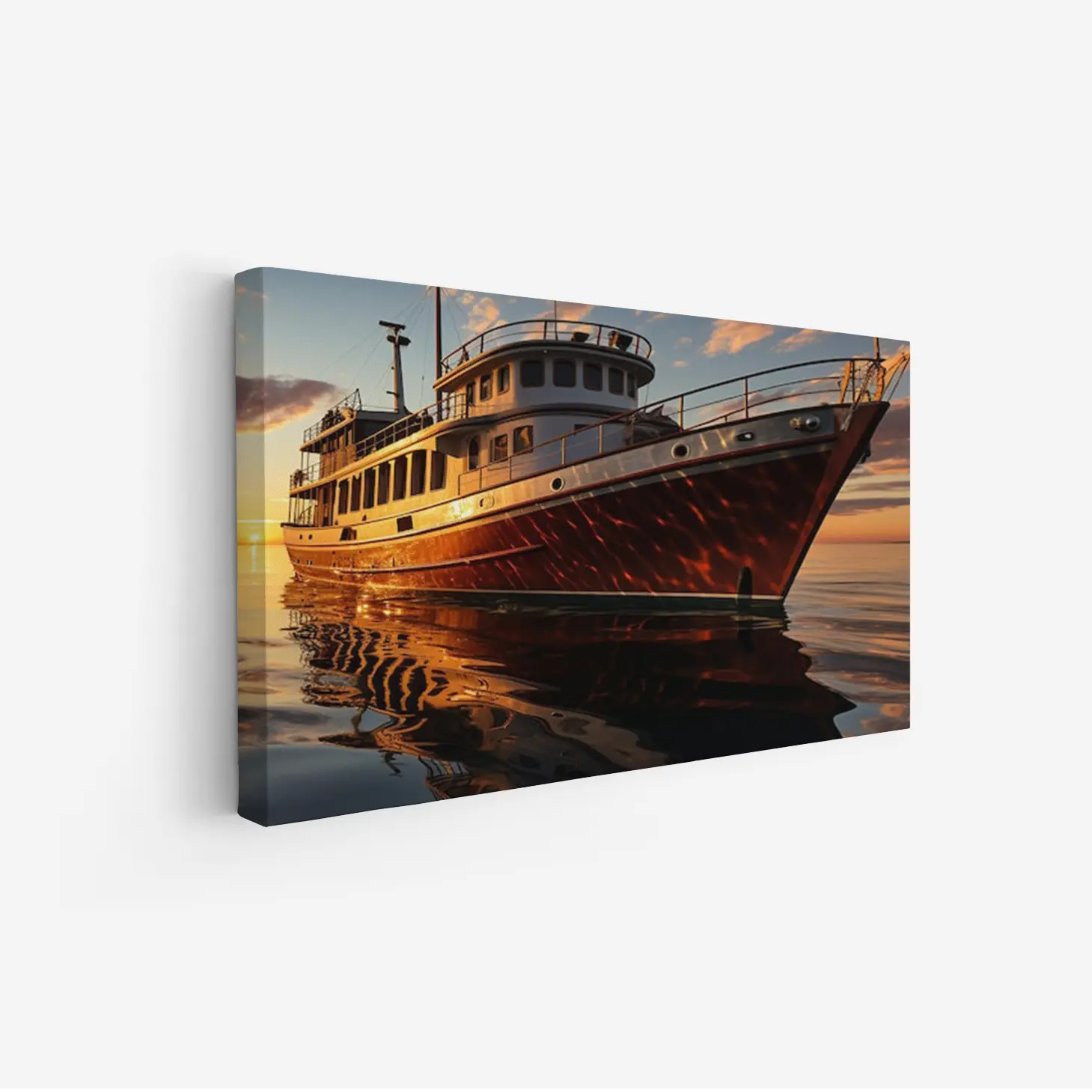 لوحة بحرية لسفينة خشبية تتلألأ تحت أشعة الشمس الغاربة، بألوان دافئة تعكس الهدوء، لوحات طبيعة، لوحات كانفاس.