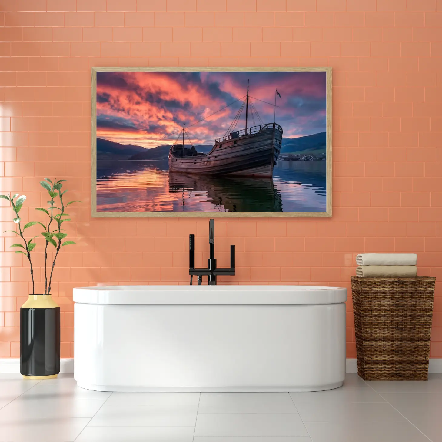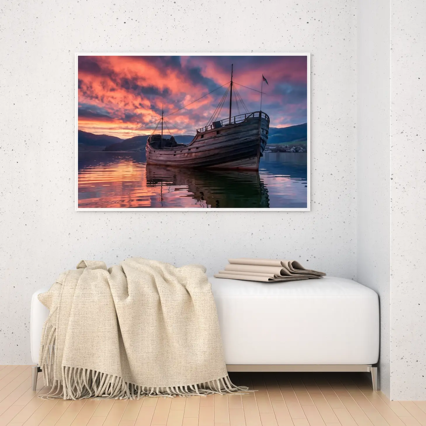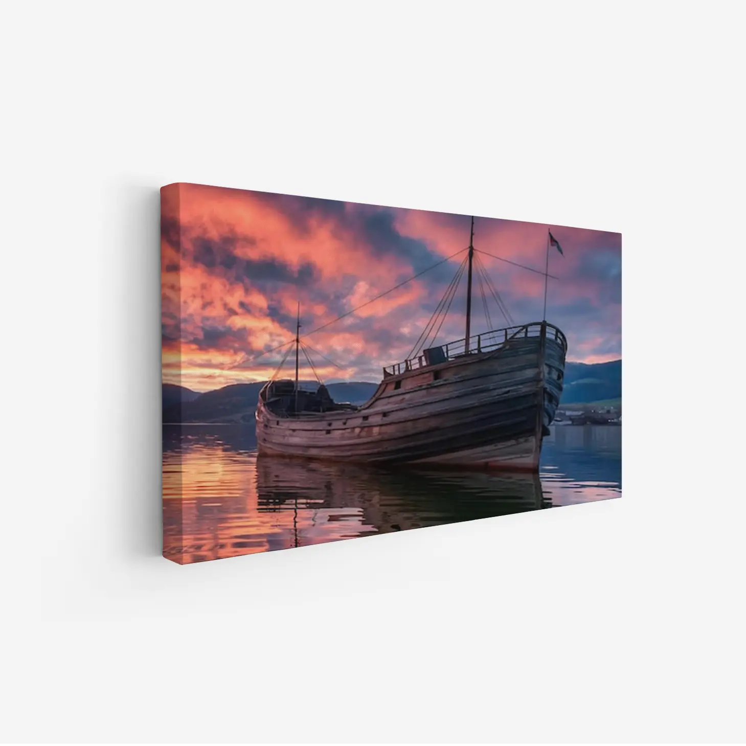 لوحة بحرية لسفينة خشبية تعكس ألوان الغروب الزاهية على سطح الماء الهادئ، لوحات طبيعة، لوحات كانفاس أنيقة