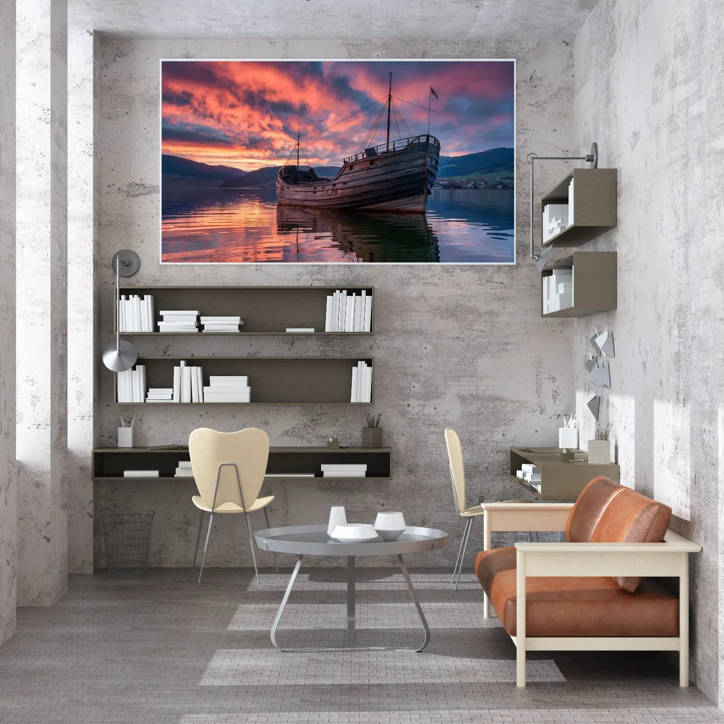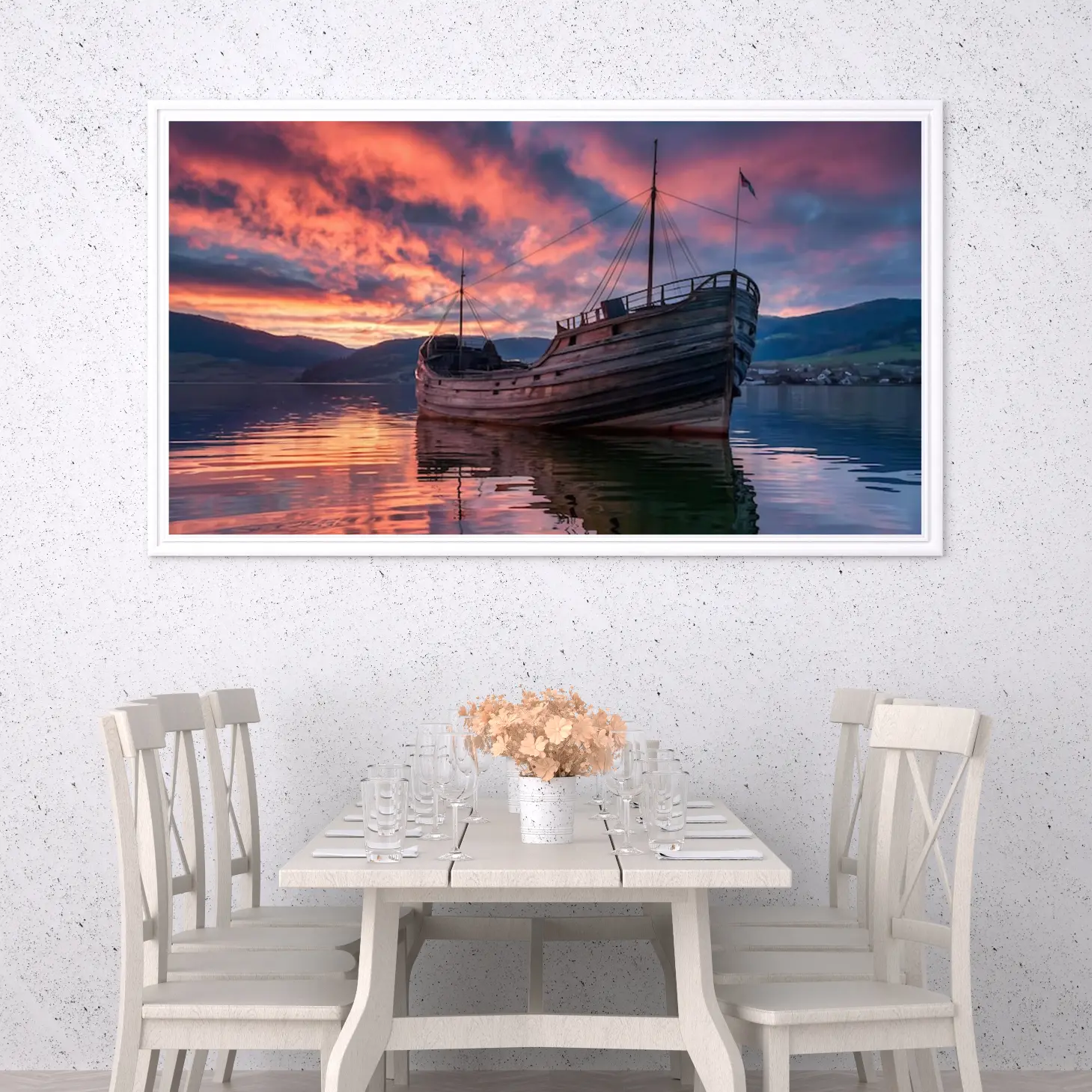 تتجلى في هذه اللوحة الفنية أجواء ساحرة تأخذك إلى عالم من الهدوء والجمال الطبيعي. يظهر فيها قارب خشبي قديم يرسو بهدوء على سطح مياه هادئة تعكس ألوان الغروب المذهلة، حيث تتداخل درجات البرتقالي والأرجواني مع ظلال الجبال في الخلفية. هذه الألوان الدافئة تخلق إحساسًا بالسكينة وتضفي لمسة من الرومانسية على أي مساحة، مما يجعلها خيارًا مثاليًا لإضفاء لمسة فنية على منزلك أو مكتبك.