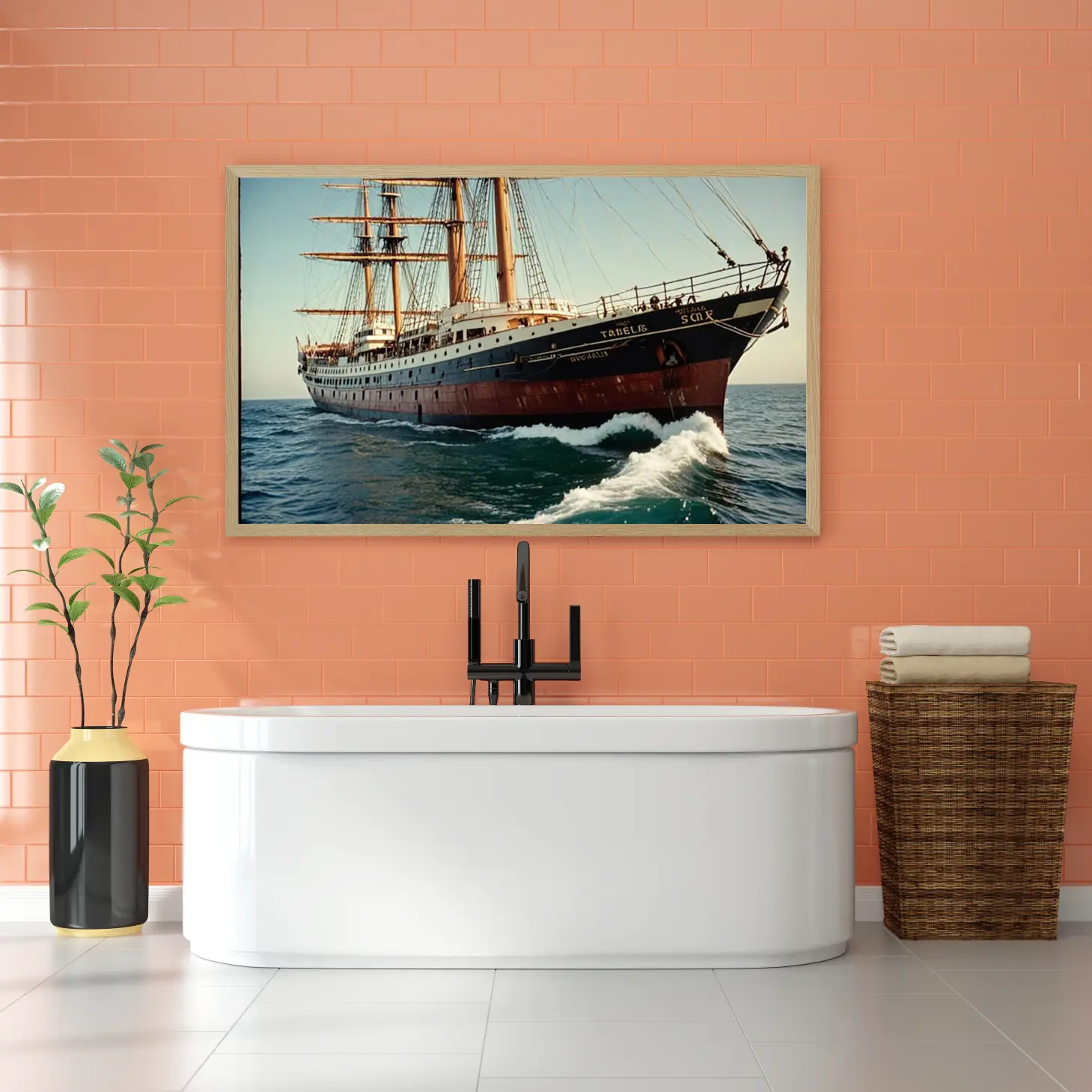 تتجلى في هذه اللوحة الفنية مشهد بحري ساحر يلتقط لحظة من الزمن، حيث يبحر سفينة تاريخية بأشرعتها المرفوعة، مما يضفي على المكان إحساسًا بالحرية والمغامرة. الألوان الدافئة والمائية تعكس جمال البحر، بينما تبرز تفاصيل السفينة المعمارية، مما يجعلها نقطة جذب بصرية تثير الإعجاب. هذه القطعة الفنية ليست مجرد ديكور جداري، بل هي استثمار جمالي يضيف لمسة من الأناقة والرقي إلى أي مساحة.