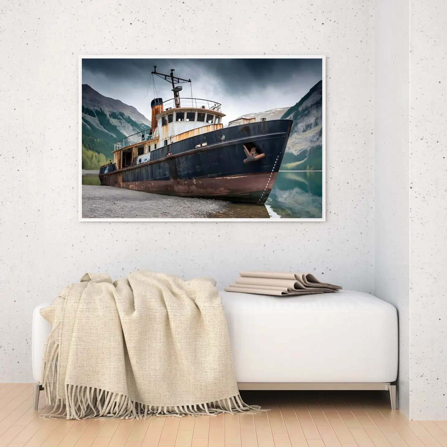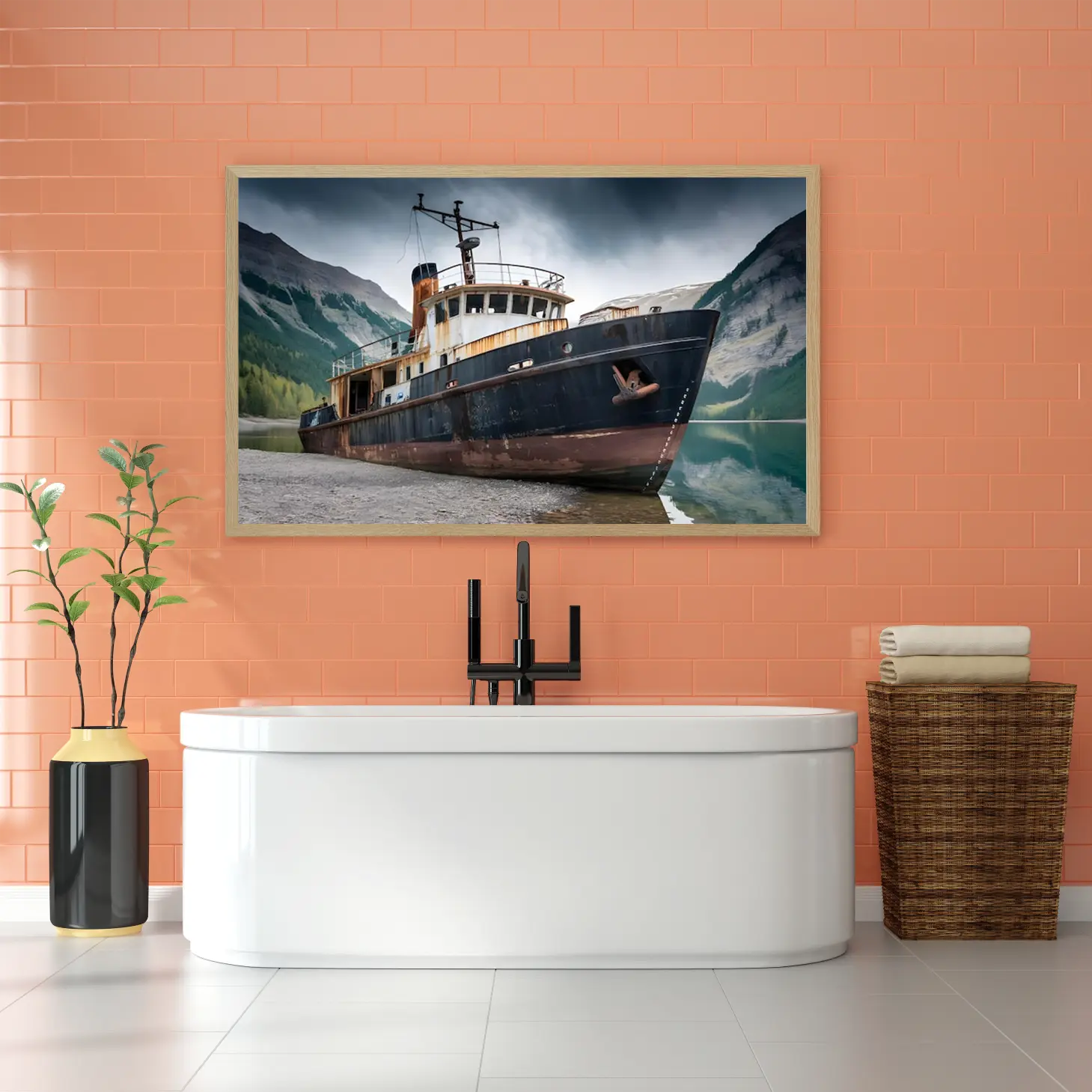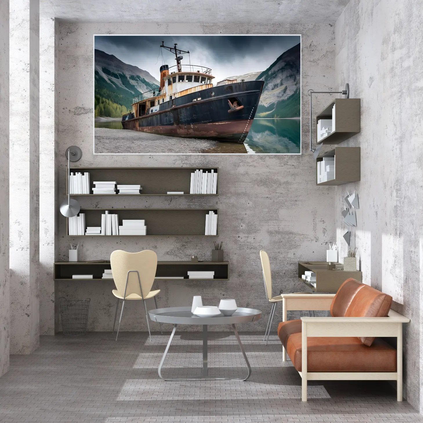 لوحة بحرية لسفينة قديمة تتأمل الجبال، ألوان داكنة ورمادية تعكس الغموض، لوحات طبيعة، لوحات كانفاس أنيقة