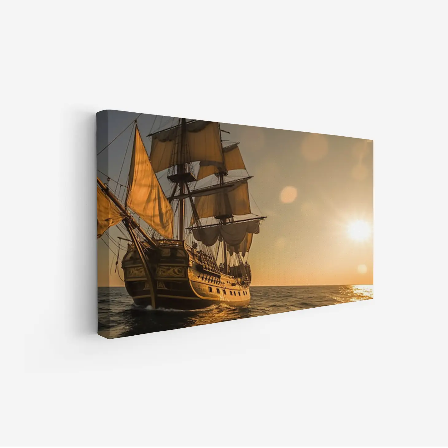 لوحة بحرية لسفينة قديمة تحت أشعة الشمس الذهبية، تعكس أجواء المغامرة والهدوء، لوحات مناظر طبيعية، لوحات كانفاس.