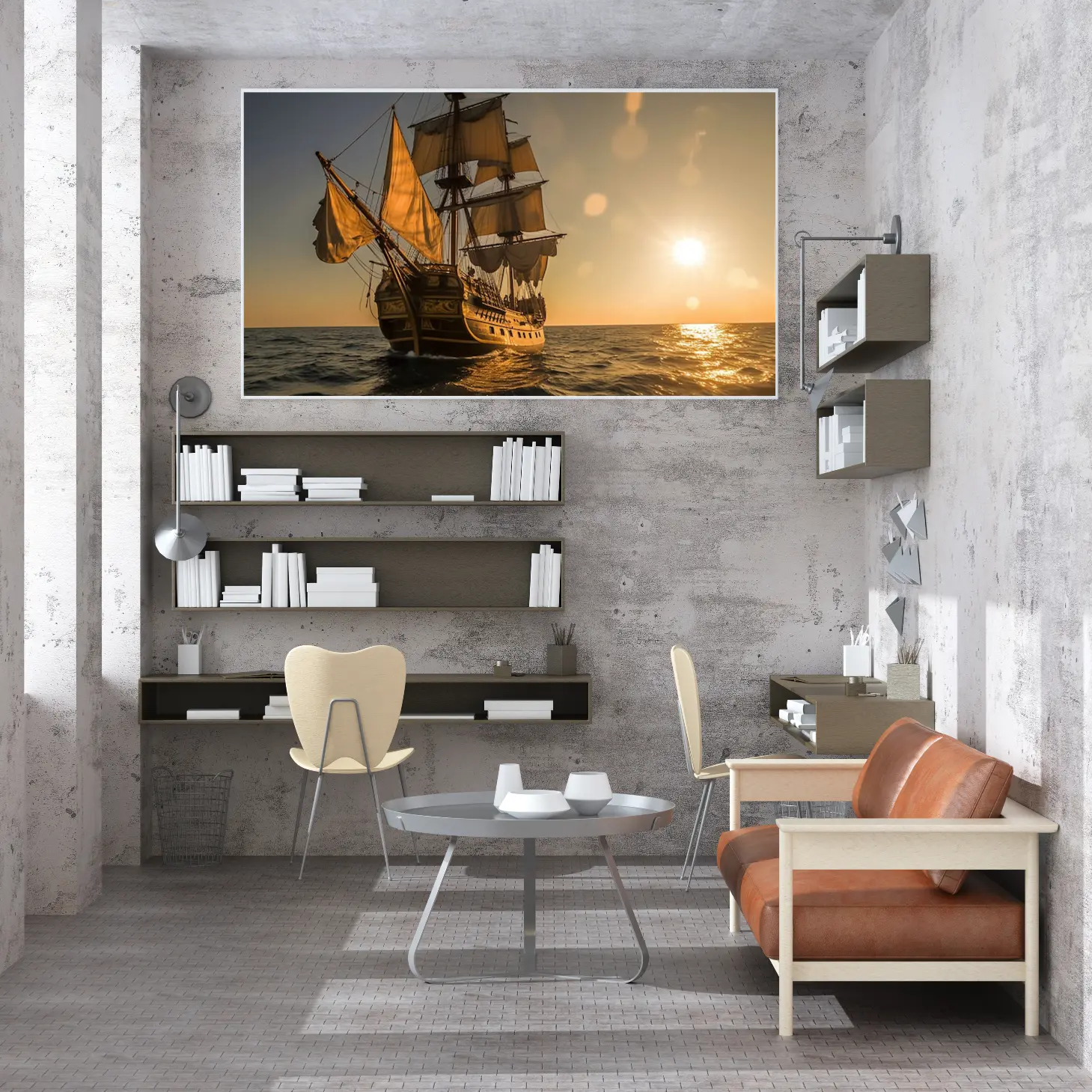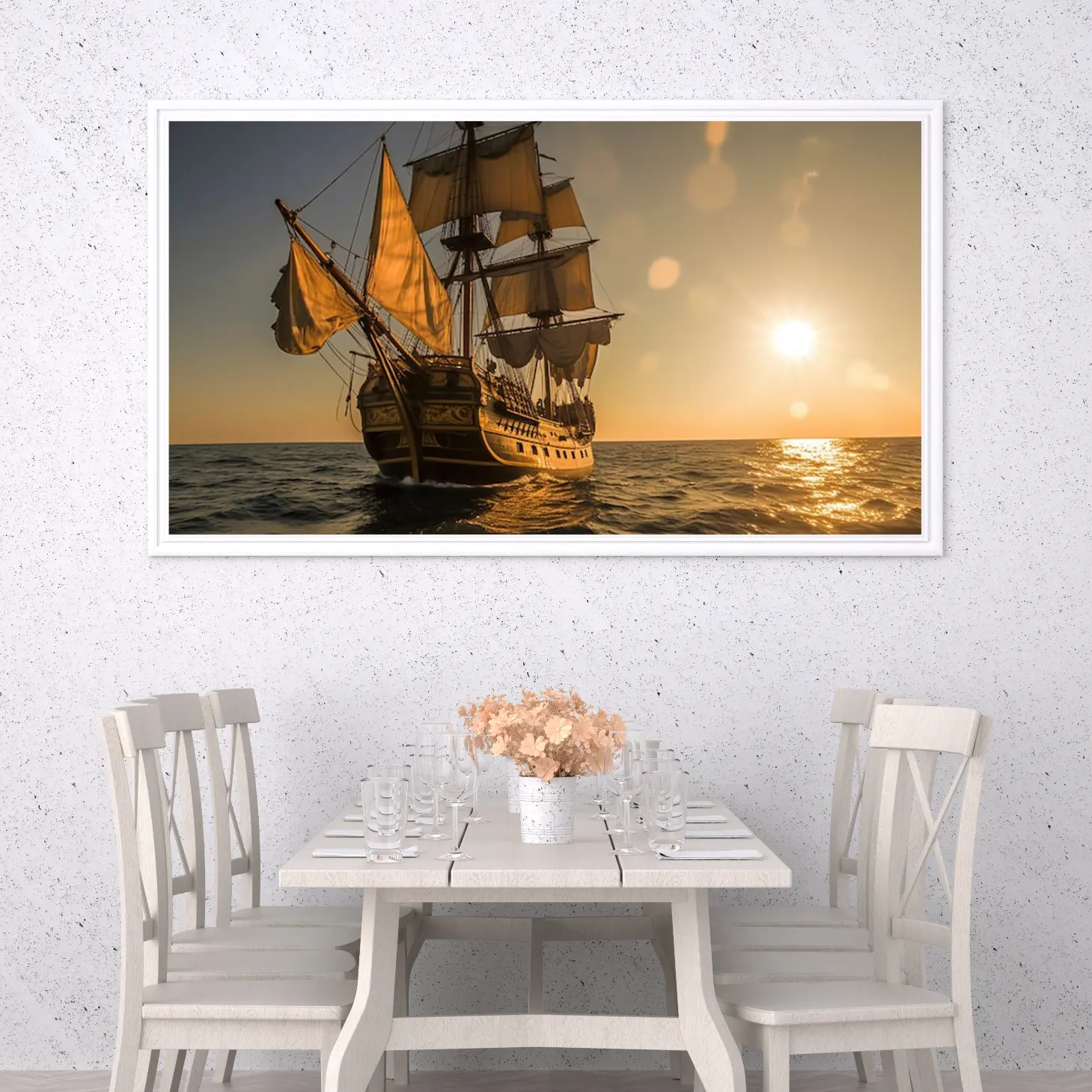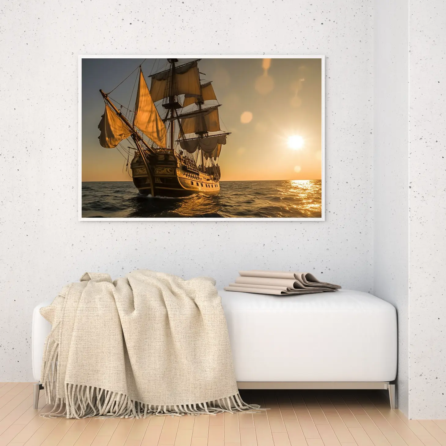 تتجلى في هذه اللوحة الفنية مشهد بحري ساحر، حيث يبحر مركب قديم تحت أشعة الشمس الذهبية، مما يضفي إحساسًا بالهدوء والسكينة. تتناغم الألوان الدافئة مع تفاصيل المركب، مما يخلق جوًا من الرومانسية والحنين إلى الماضي. إن هذه القطعة الفنية ليست مجرد ديكور جداري، بل هي استثمار جمالي يضيف لمسة من الأناقة إلى أي مساحة، مما يجعلها خيارًا مثاليًا لمن يسعى لتجديد أجواء منزله أو مكتبه.