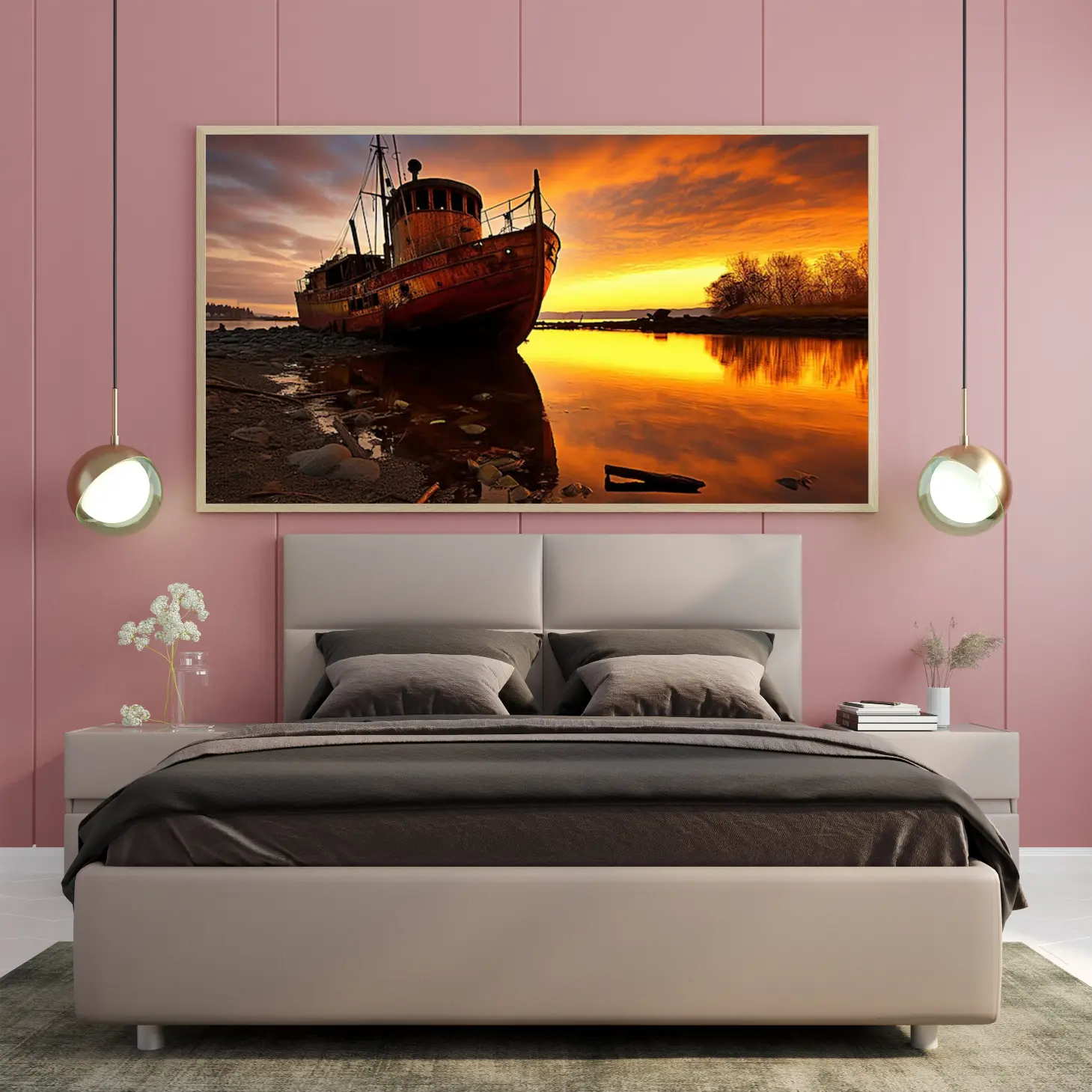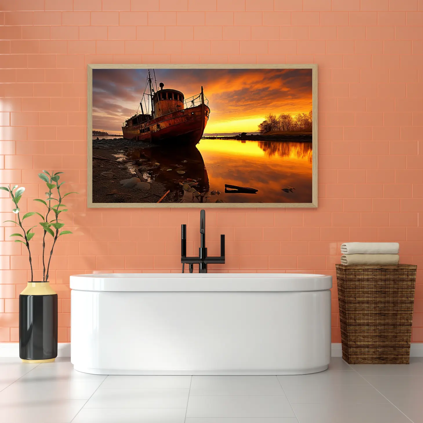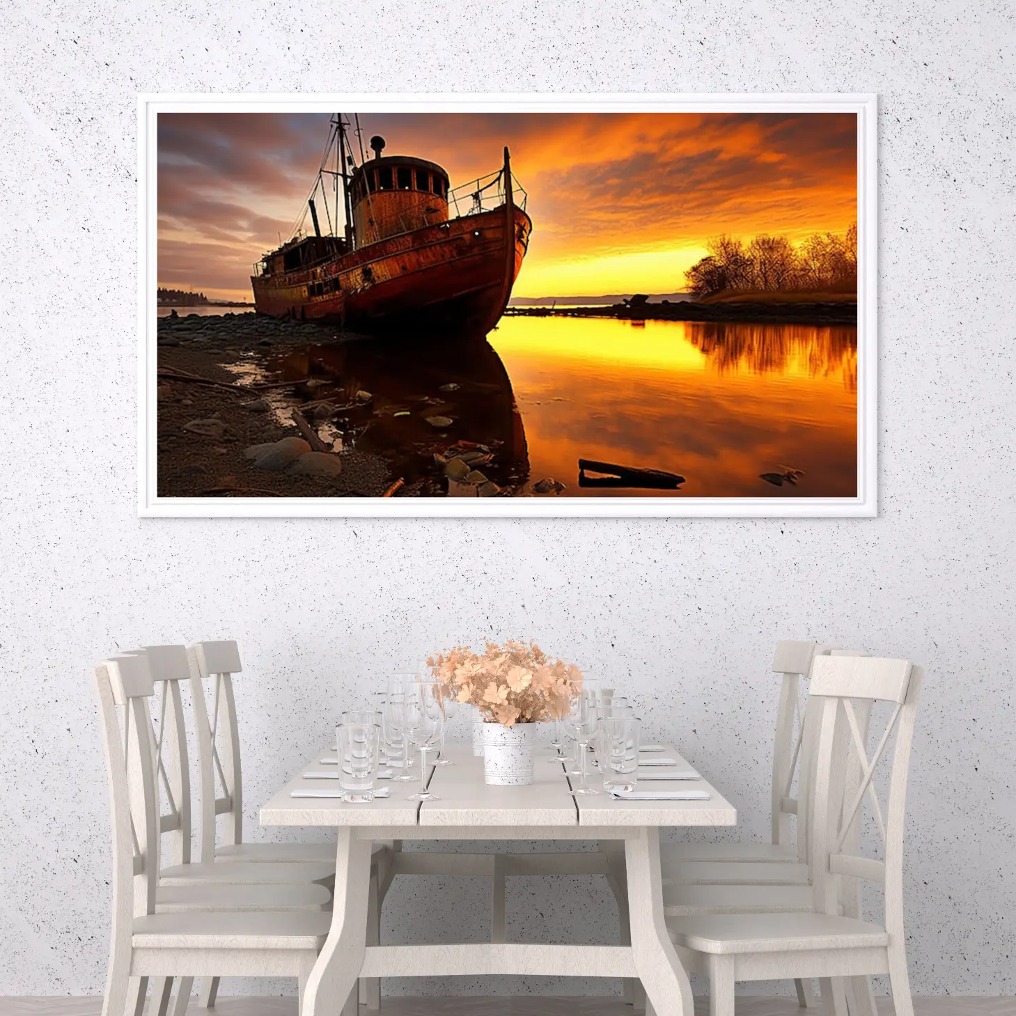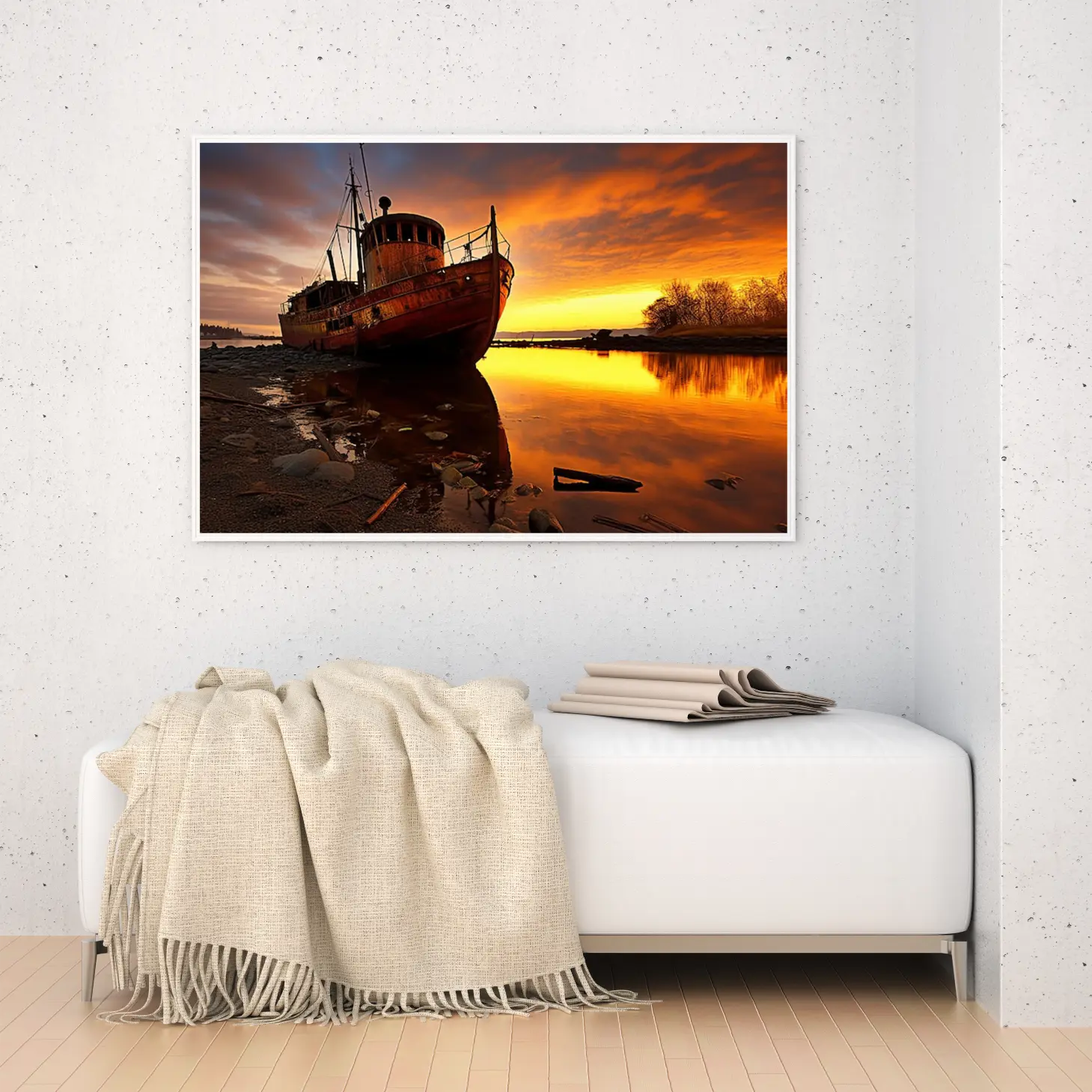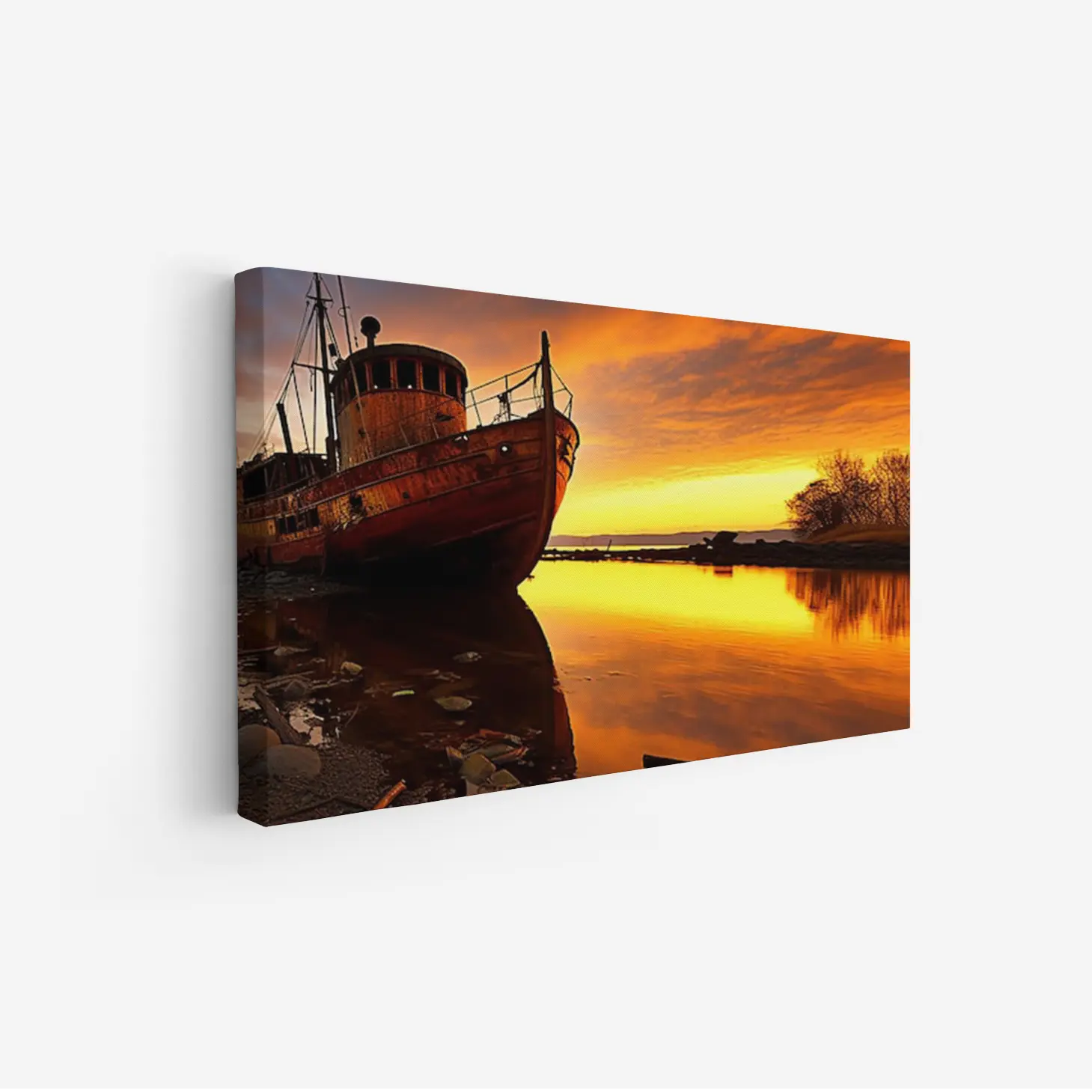 تجسد هذه اللوحة الفنية مشهداً ساحراً يأخذك إلى عالم من الهدوء والجمال الطبيعي. يظهر فيها قارب قديم يتأمل غروب الشمس، حيث تتداخل الألوان الدافئة من البرتقالي والأصفر مع انعكاسات المياه الهادئة، مما يخلق أجواءً من السكينة والتأمل. هذه القطعة الفنية ليست مجرد ديكور جداري، بل هي استثمار جمالي يضفي لمسة من الأناقة على أي مساحة، مما يجعلها خياراً مثالياً لمن يسعى لإضفاء روح جديدة على منزله أو مكتبه.