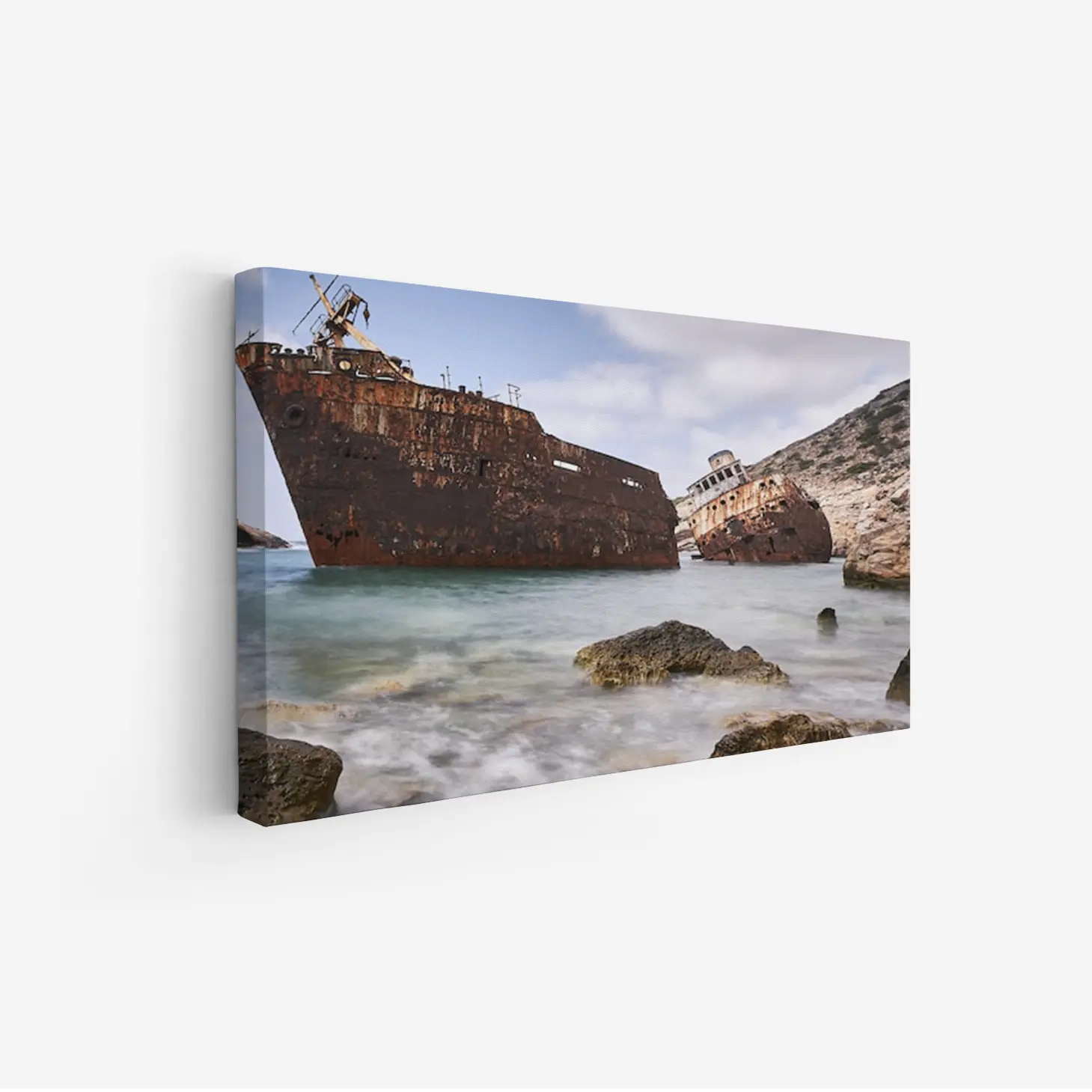 لوحة بحرية لسفينتين مهجورتين تتأرجحان بين الأمواج بلون صدئ، تعكس أجواء الغموض والحنين، لوحات طبيعة، لوحات كانفاس.