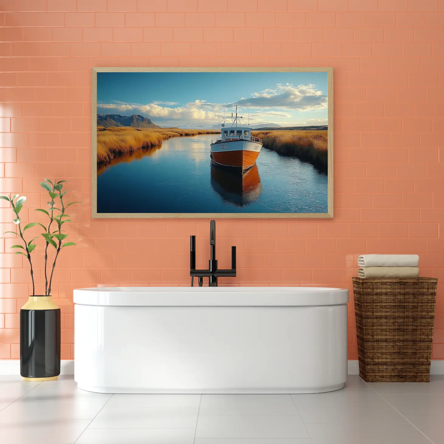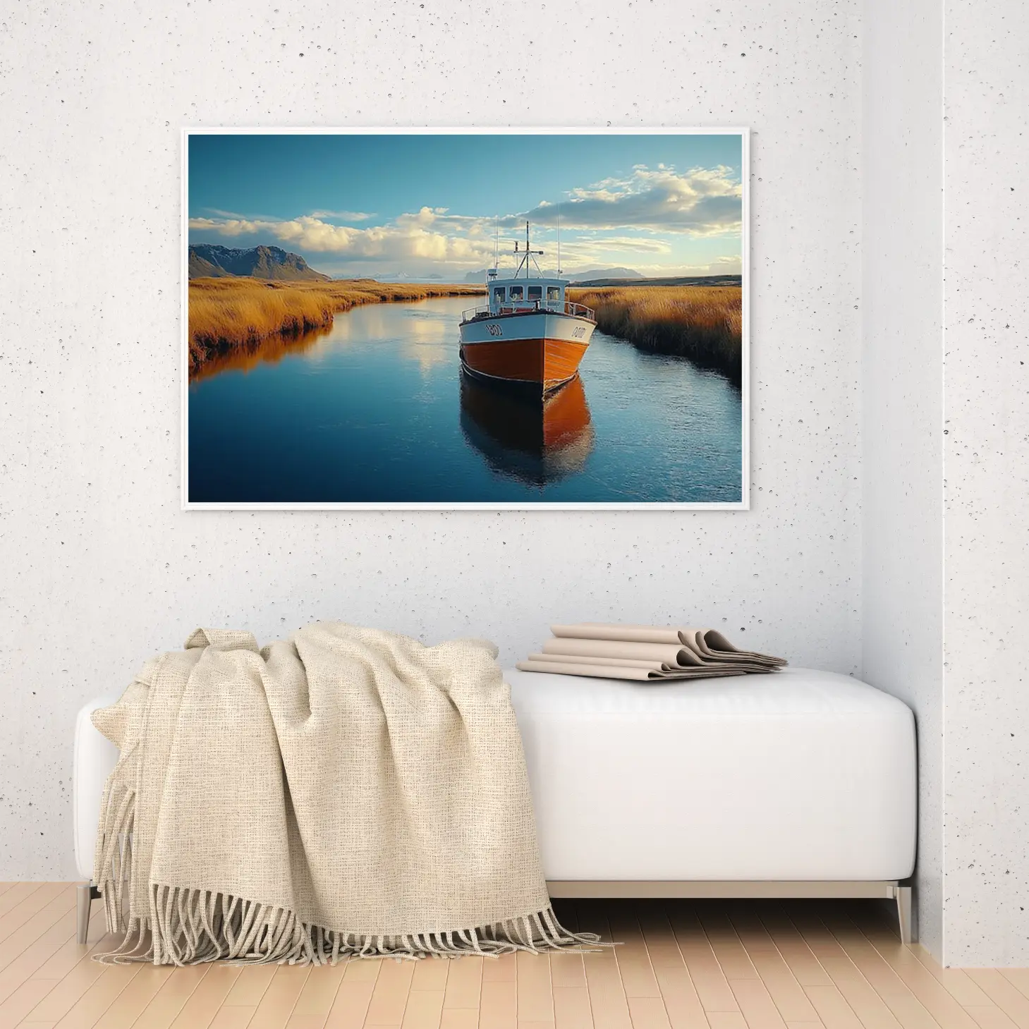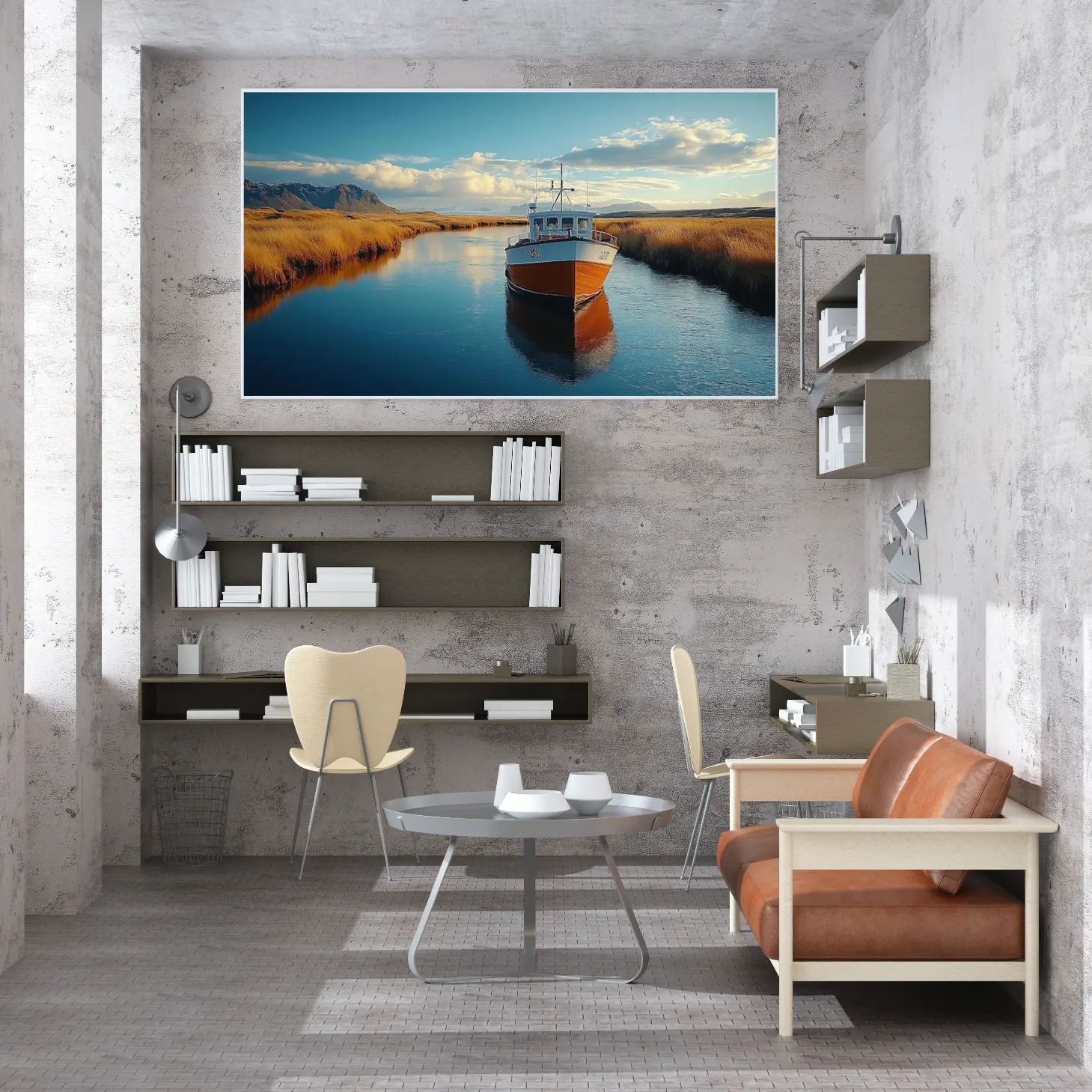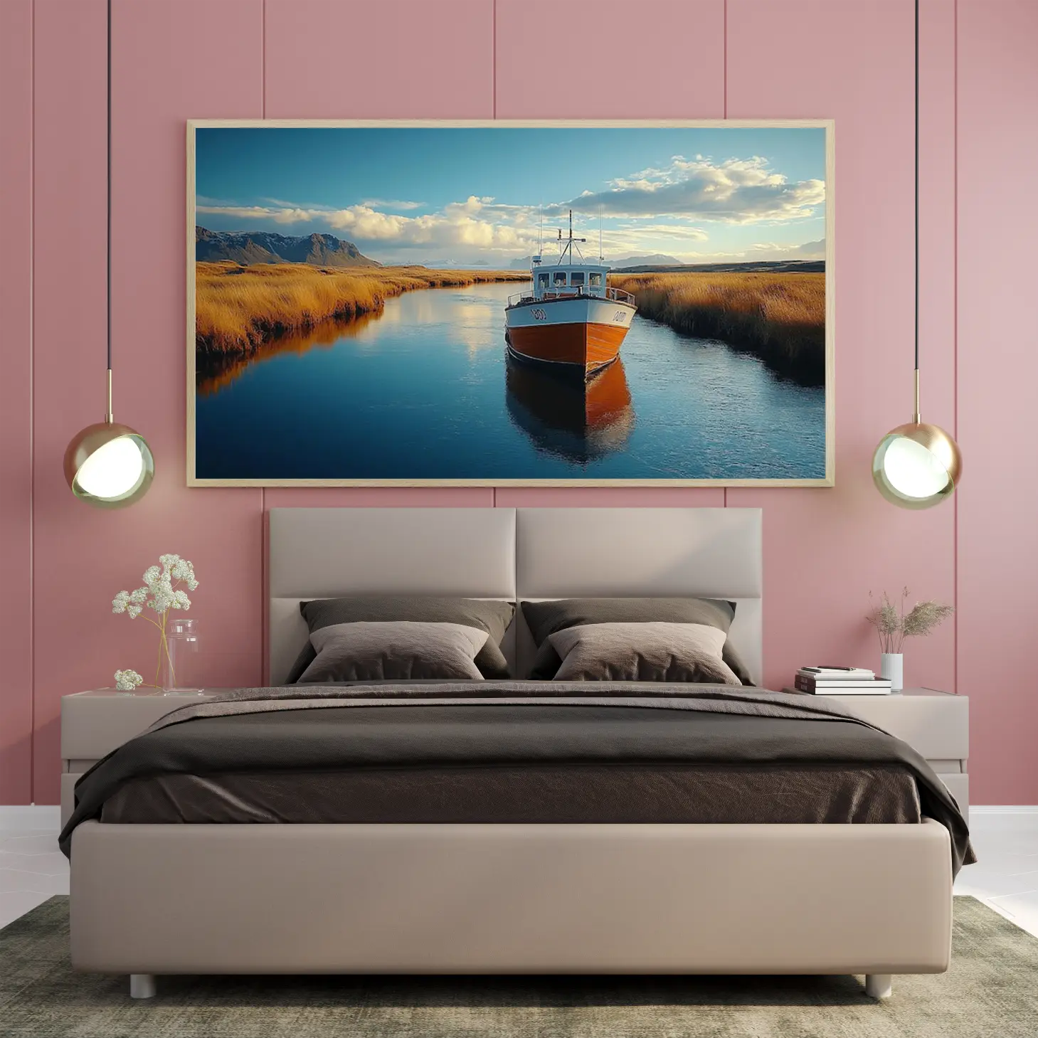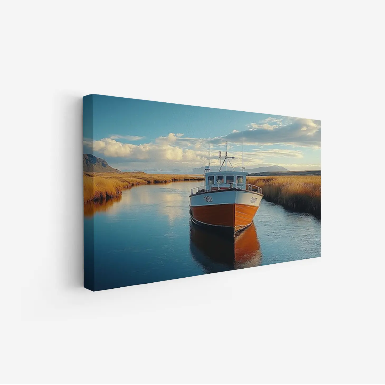 تجسد هذه اللوحة الفنية لحظة ساحرة من الطبيعة، حيث يبحر قارب صغير في مجرى مائي هادئ تحيط به الأعشاب الذهبية. تنعكس أشعة الشمس على سطح الماء، مما يضفي لمسة سحرية على المشهد ويخلق أجواءً من السكينة والهدوء. هذه القطعة الفنية ليست مجرد ديكور جداري، بل هي نافذة إلى عالم من الجمال الطبيعي، مما يجعلها خيارًا مثاليًا لإضفاء لمسة من الأناقة على أي مساحة.