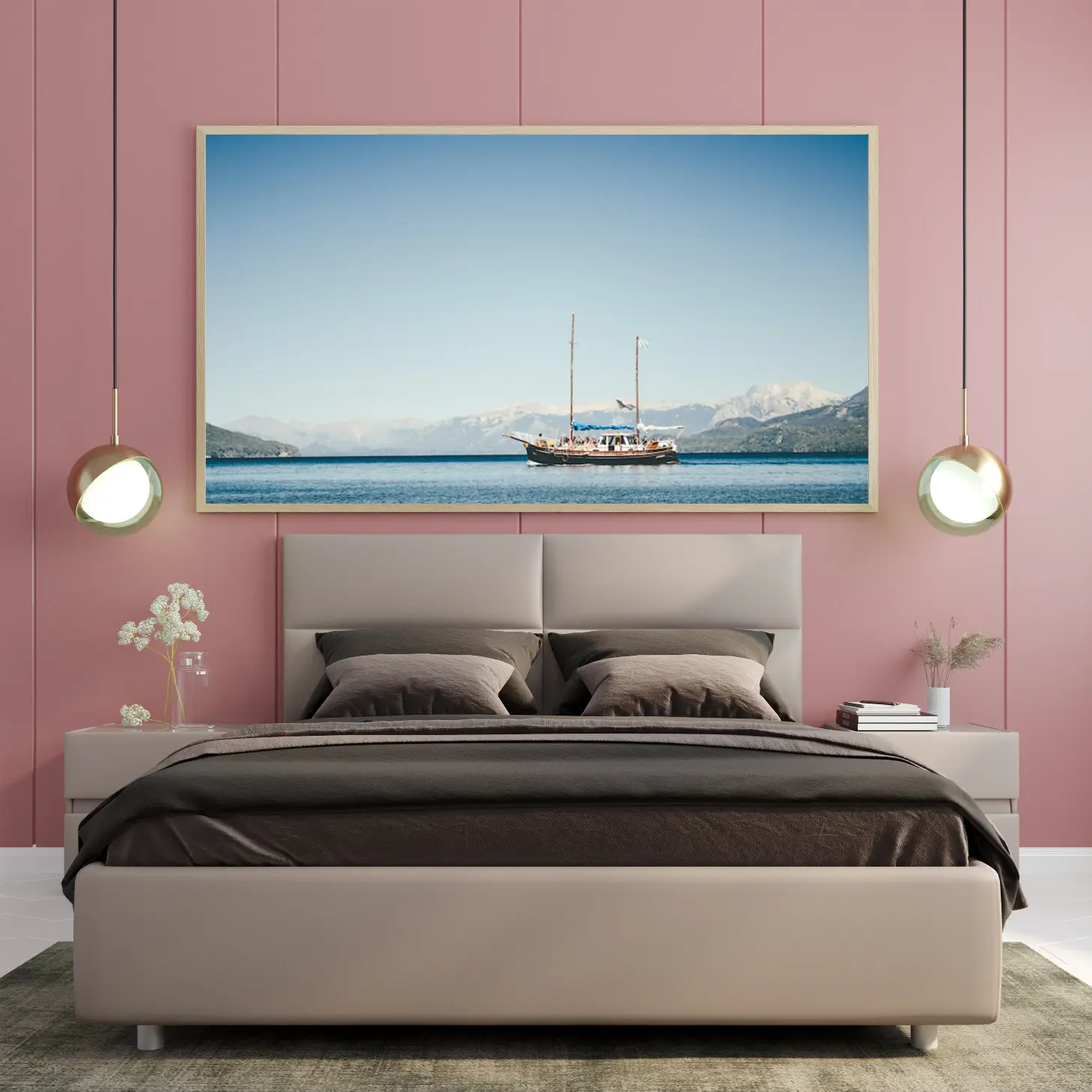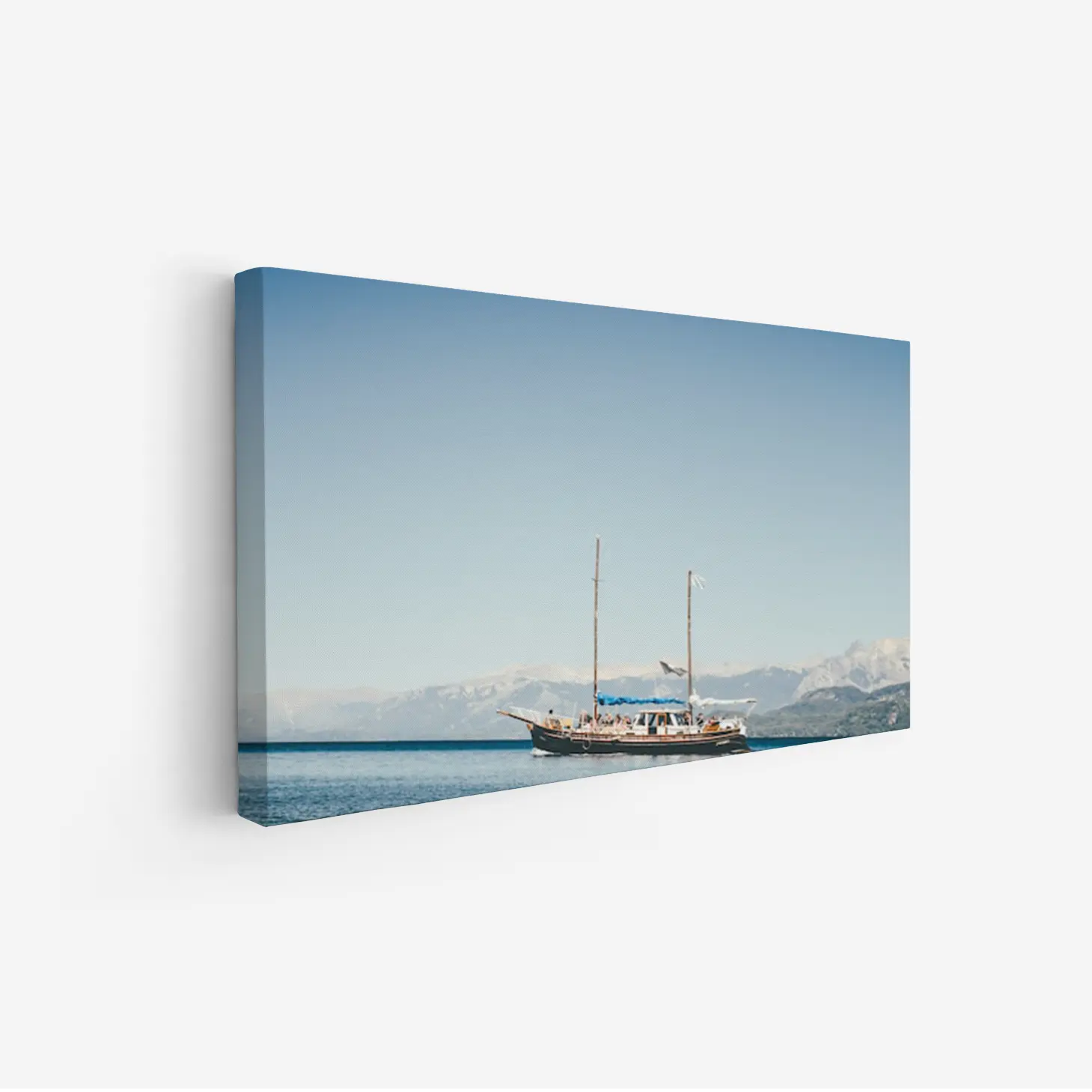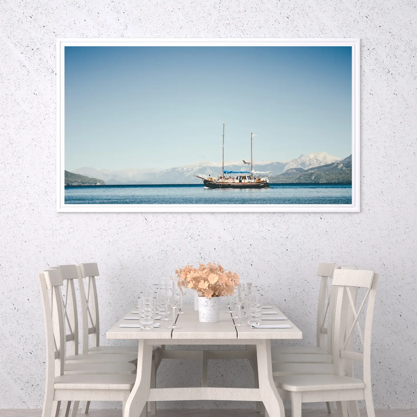 تجسد هذه اللوحة الفنية مشهدًا بحريًا ساحرًا، حيث يلتقي زرقة السماء مع صفاء المياه، مما يخلق أجواءً من الهدوء والسكينة. يظهر القارب التقليدي بألوانه الدافئة، وهو يبحر برشاقة، مما يضفي لمسة من الحياة على المشهد. هذا العمل الفني يساهم في تحويل أي مساحة إلى ملاذ هادئ، يعكس نمط حياة مفعم بالاسترخاء والجمال الطبيعي.