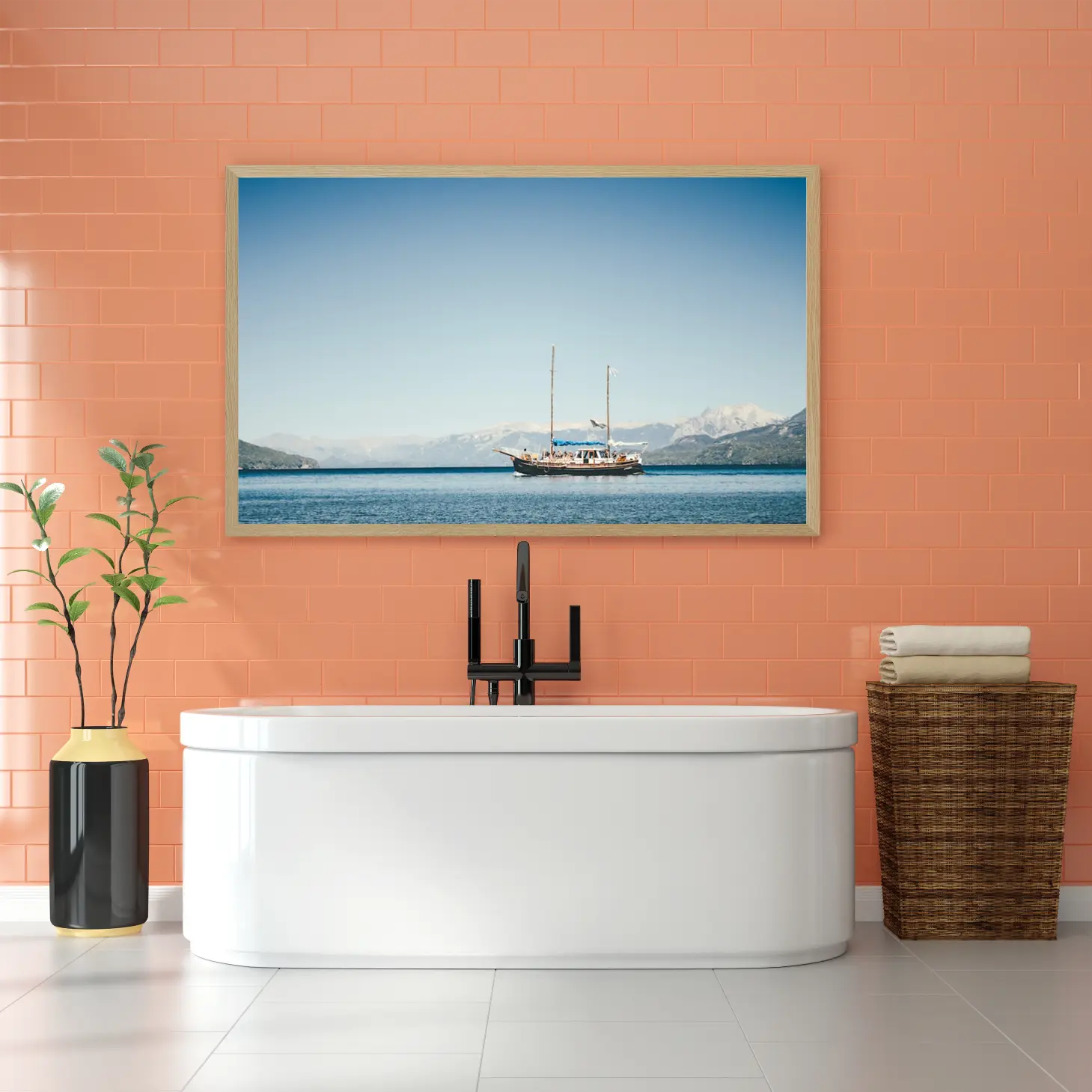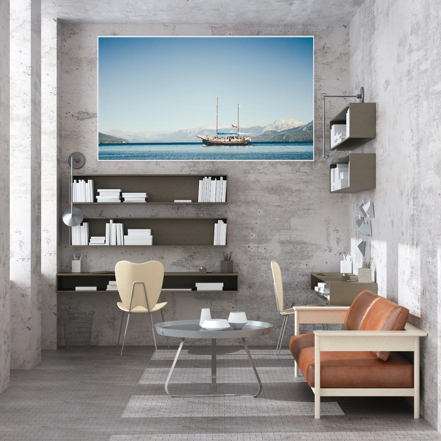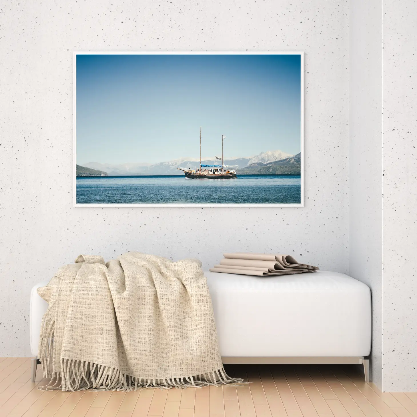 تجسد هذه اللوحة الفنية مشهدًا بحريًا ساحرًا، حيث يلتقي زرقة السماء مع صفاء المياه، مما يخلق أجواءً من الهدوء والسكينة. يظهر القارب التقليدي بألوانه الدافئة، وهو يبحر برشاقة، مما يضفي لمسة من الحياة على المشهد. هذا العمل الفني يساهم في تحويل أي مساحة إلى ملاذ هادئ، يعكس نمط حياة مفعم بالاسترخاء والجمال الطبيعي.