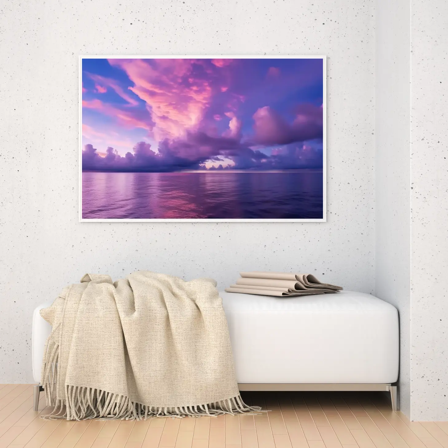 تتجلى في هذه اللوحة الفنية ألوان السماء المتداخلة مع انعكاسات المياه، مما يخلق مشهداً ساحراً يبعث على الهدوء والسكينة. الألوان الوردية والبنفسجية تتناغم بشكل رائع، مما يضفي على المكان أجواءً من الرومانسية والجمال الطبيعي. هذه القطعة ليست مجرد ديكور جداري، بل هي تجربة بصرية تأخذك إلى عالم من الصفاء، مما يجعلها مثالية لإضفاء لمسة من الأناقة على أي مساحة.