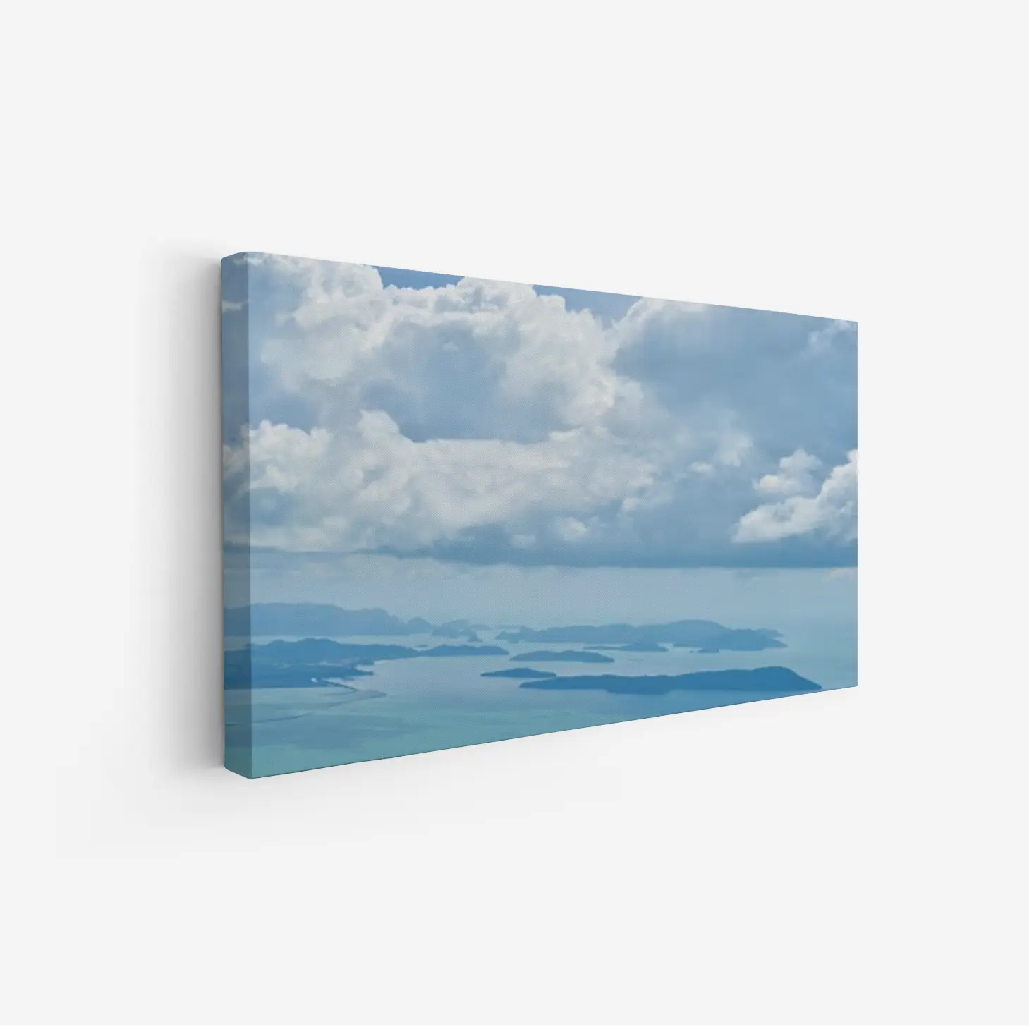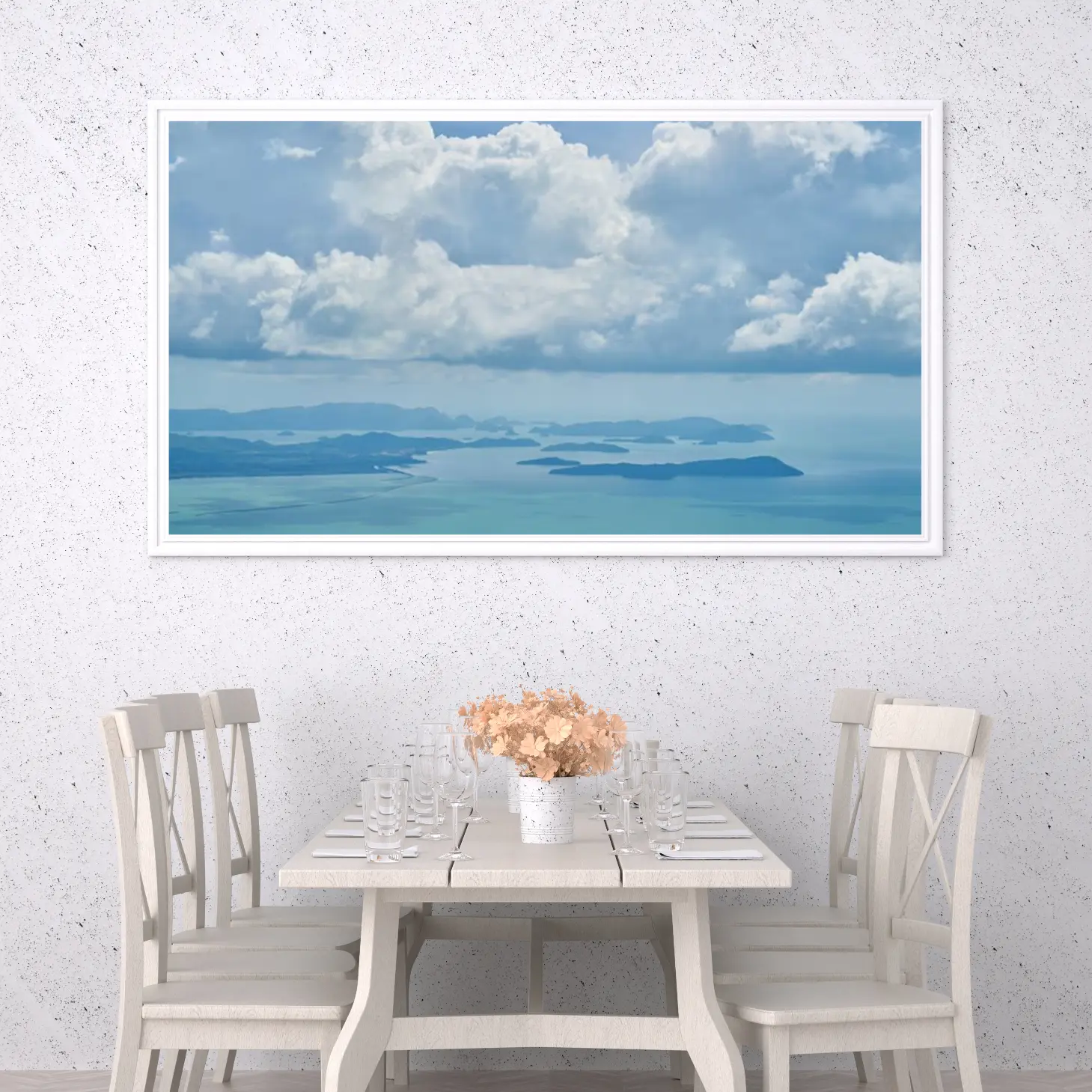 تتجلى في هذه اللوحة جماليات الطبيعة الخلابة، حيث تندمج السماء الزرقاء مع السحب البيضاء المتناثرة، مما يخلق إحساسًا بالهدوء والسكينة. تعكس الألوان الهادئة والمشرقة أجواءً من الانتعاش، مما يجعلها خيارًا مثاليًا لتزيين أي مساحة. إن وجود هذه القطعة الفنية في منزلك أو مكتبك سيضفي لمسة من الرقي والأناقة، ويعزز من نمط الحياة العصري الذي تسعى إليه.