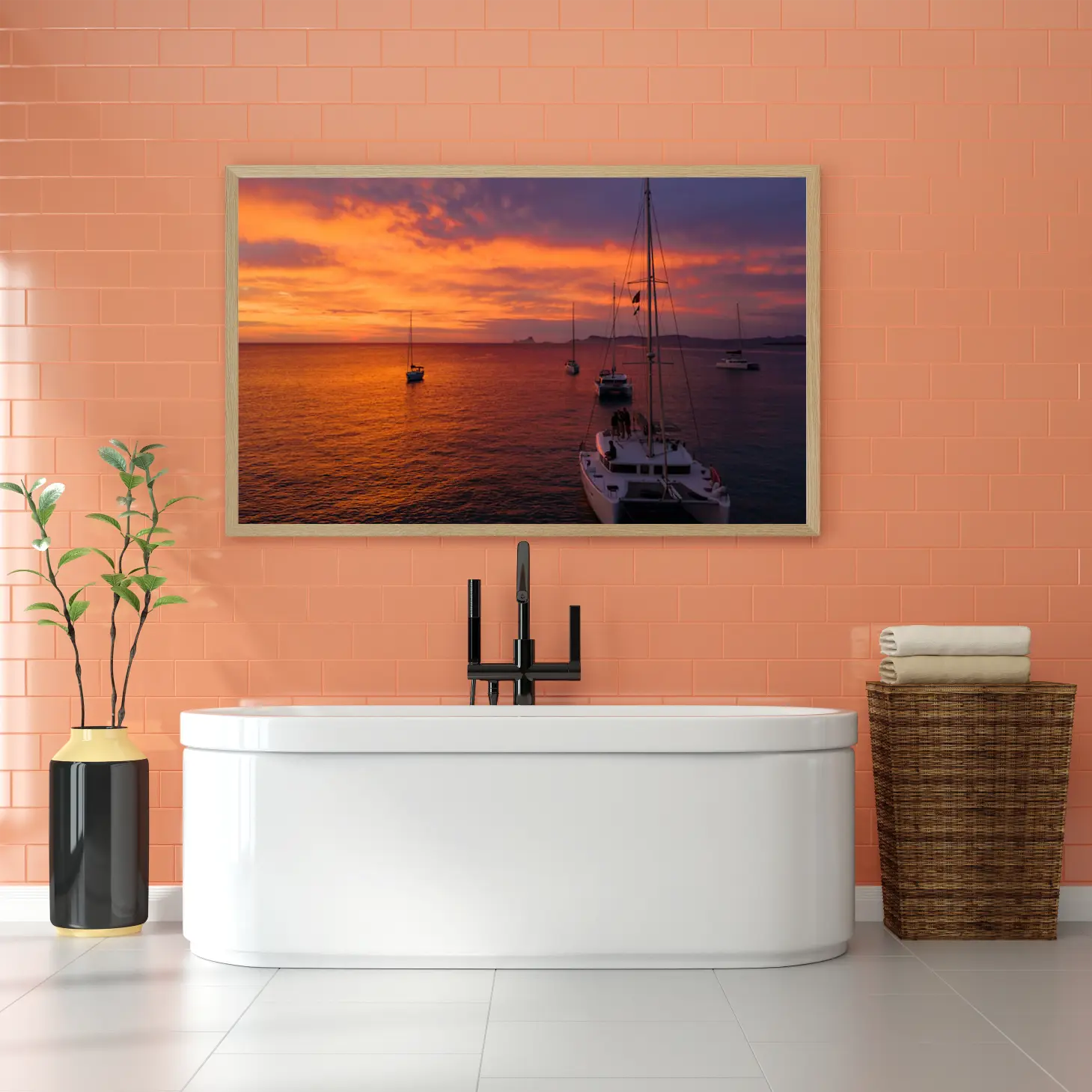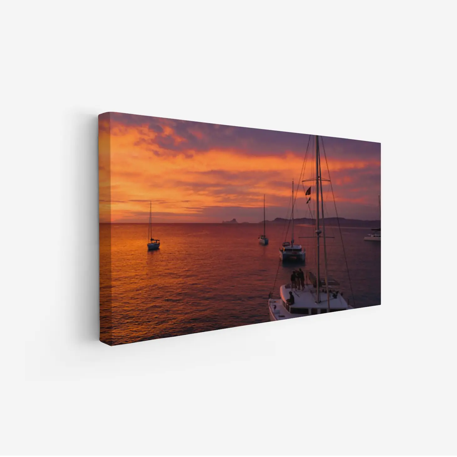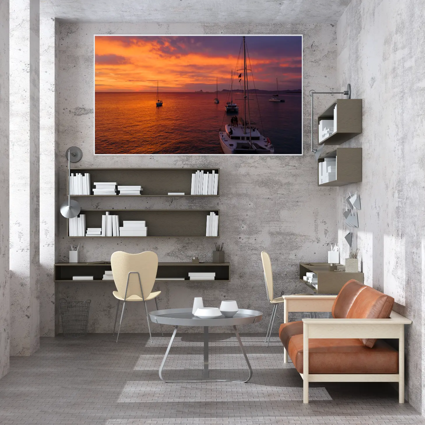 لوحة بحر بألوان غروب الشمس الدافئة مع قوارب تبحر في مياه هادئة، لوحات جمادات ومعالم، لوحات كانفاس.