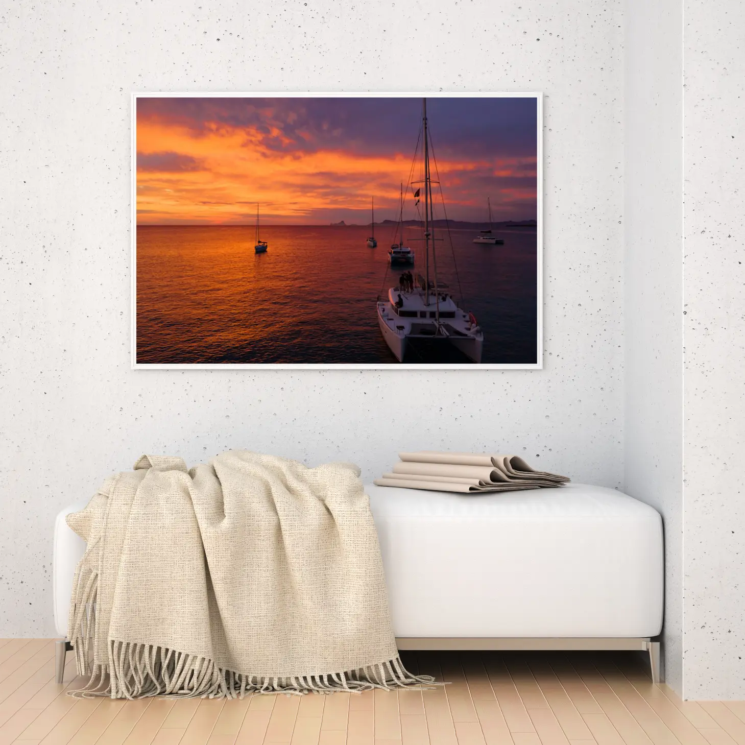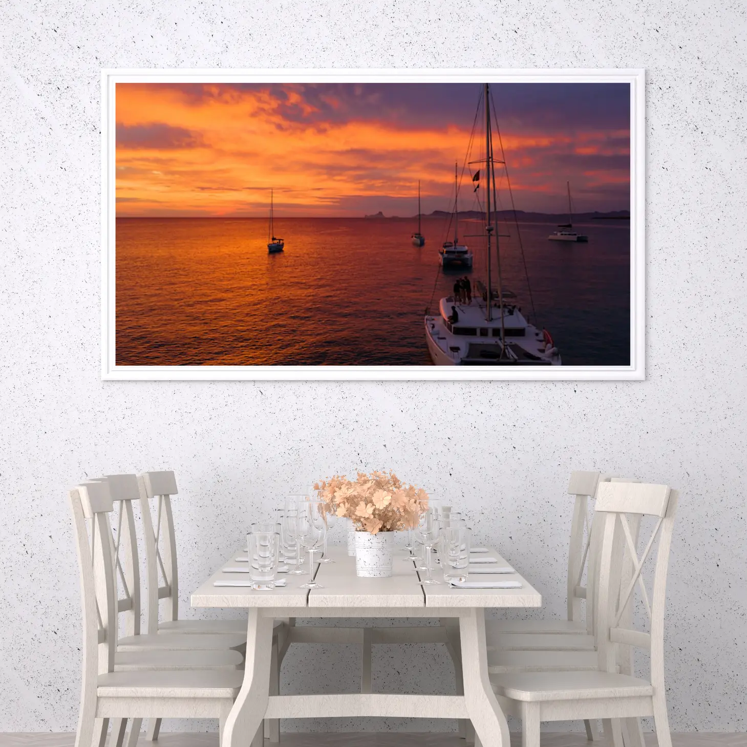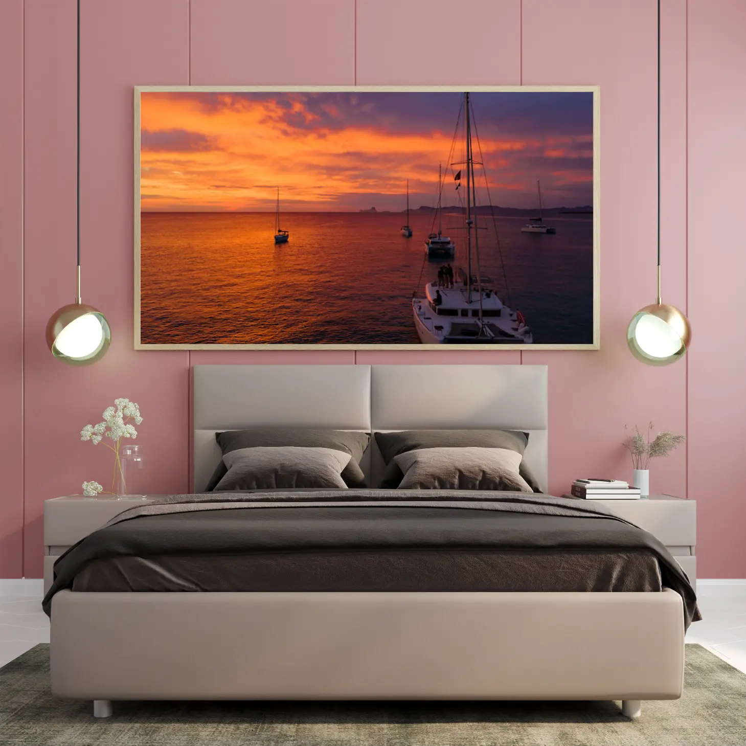 لوحة بحر بألوان غروب الشمس الدافئة مع قوارب تبحر في مياه هادئة، لوحات جمادات ومعالم، لوحات كانفاس.