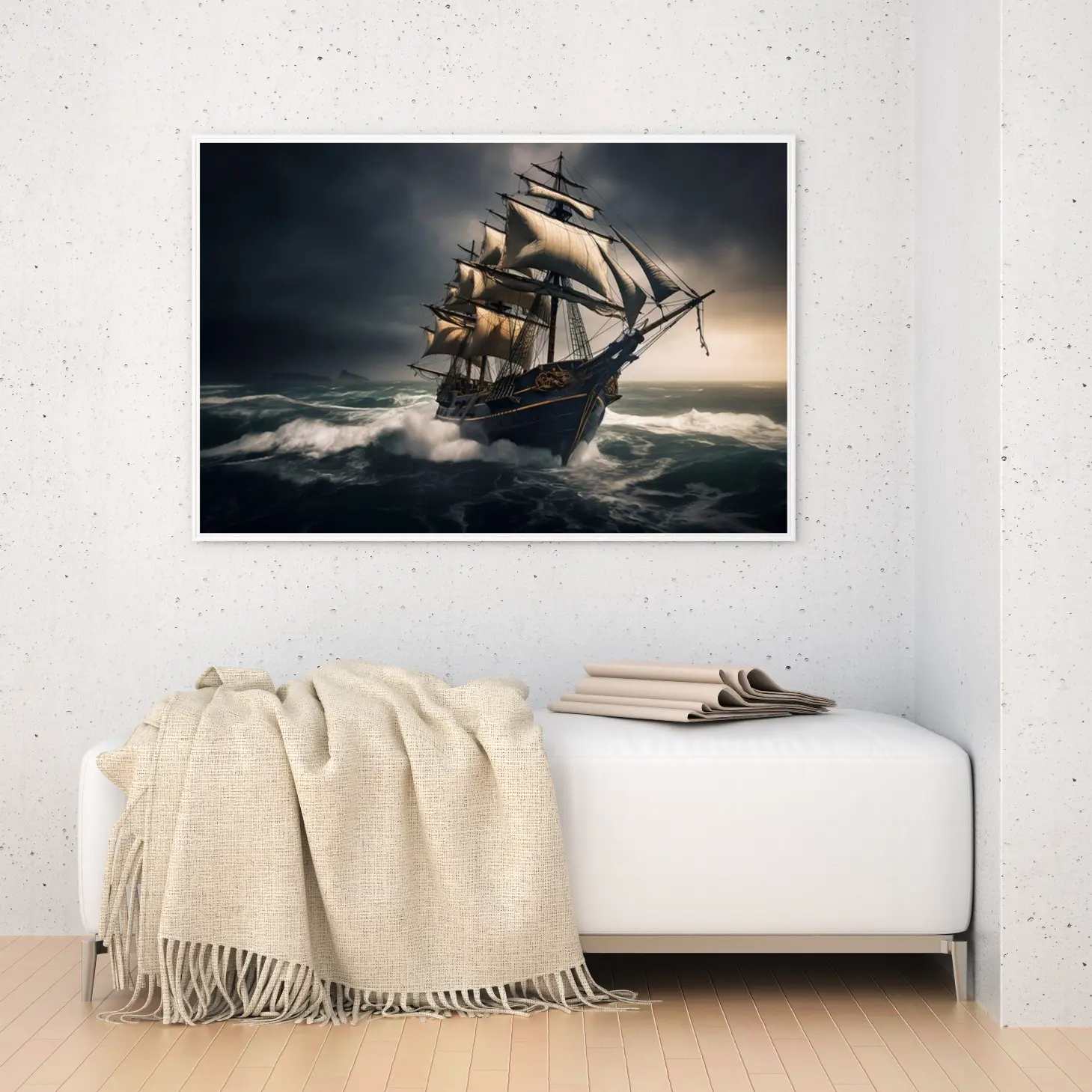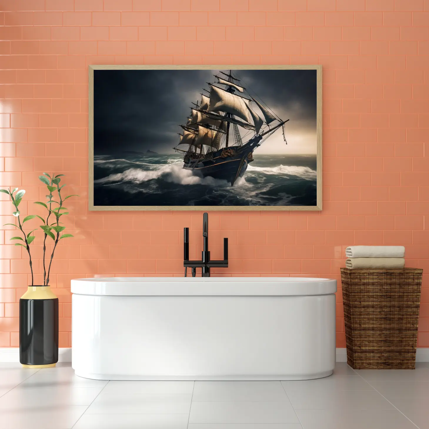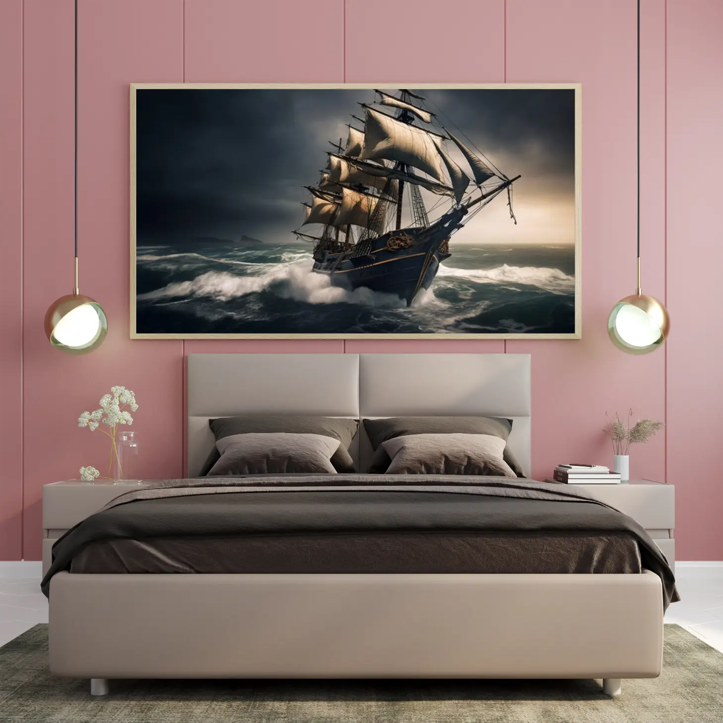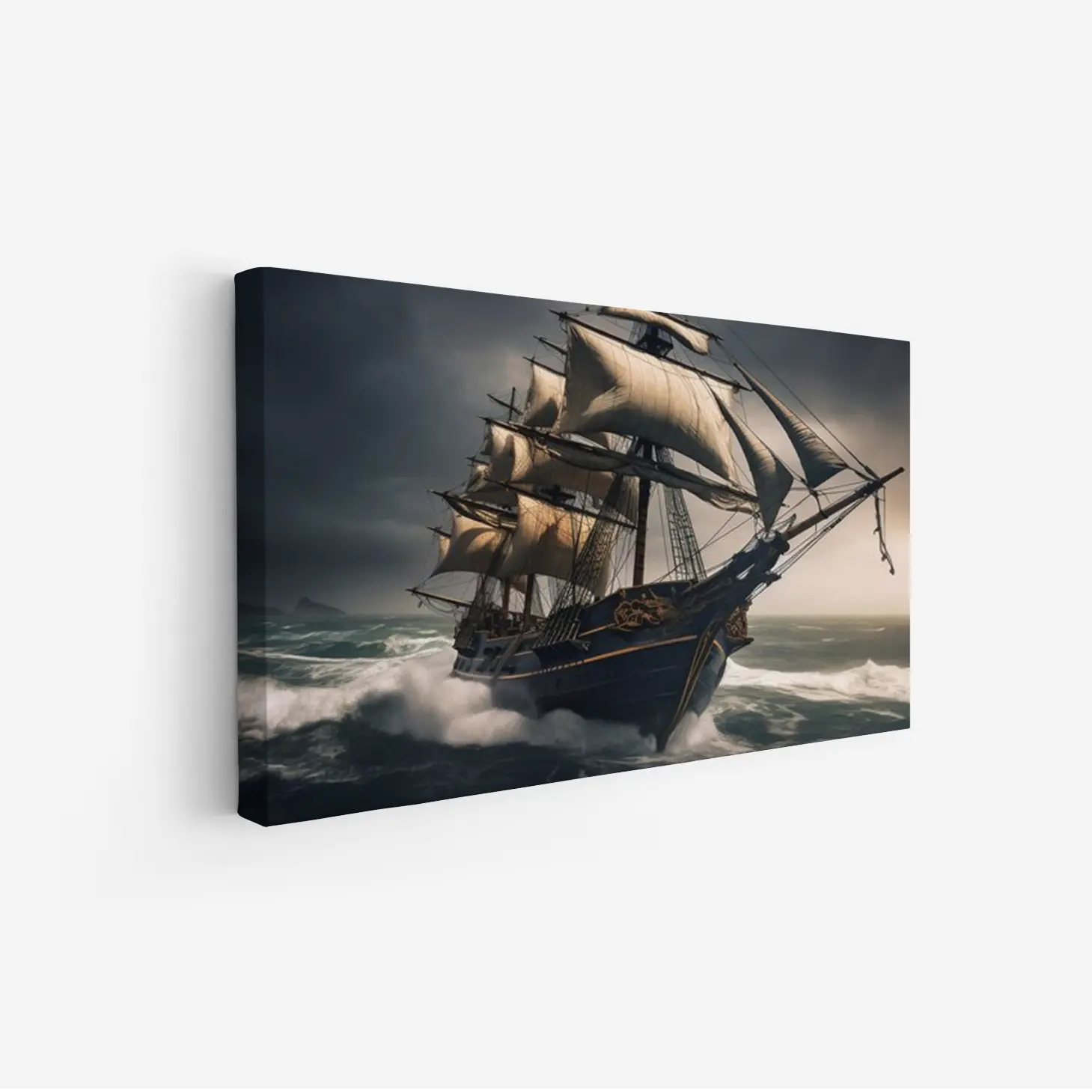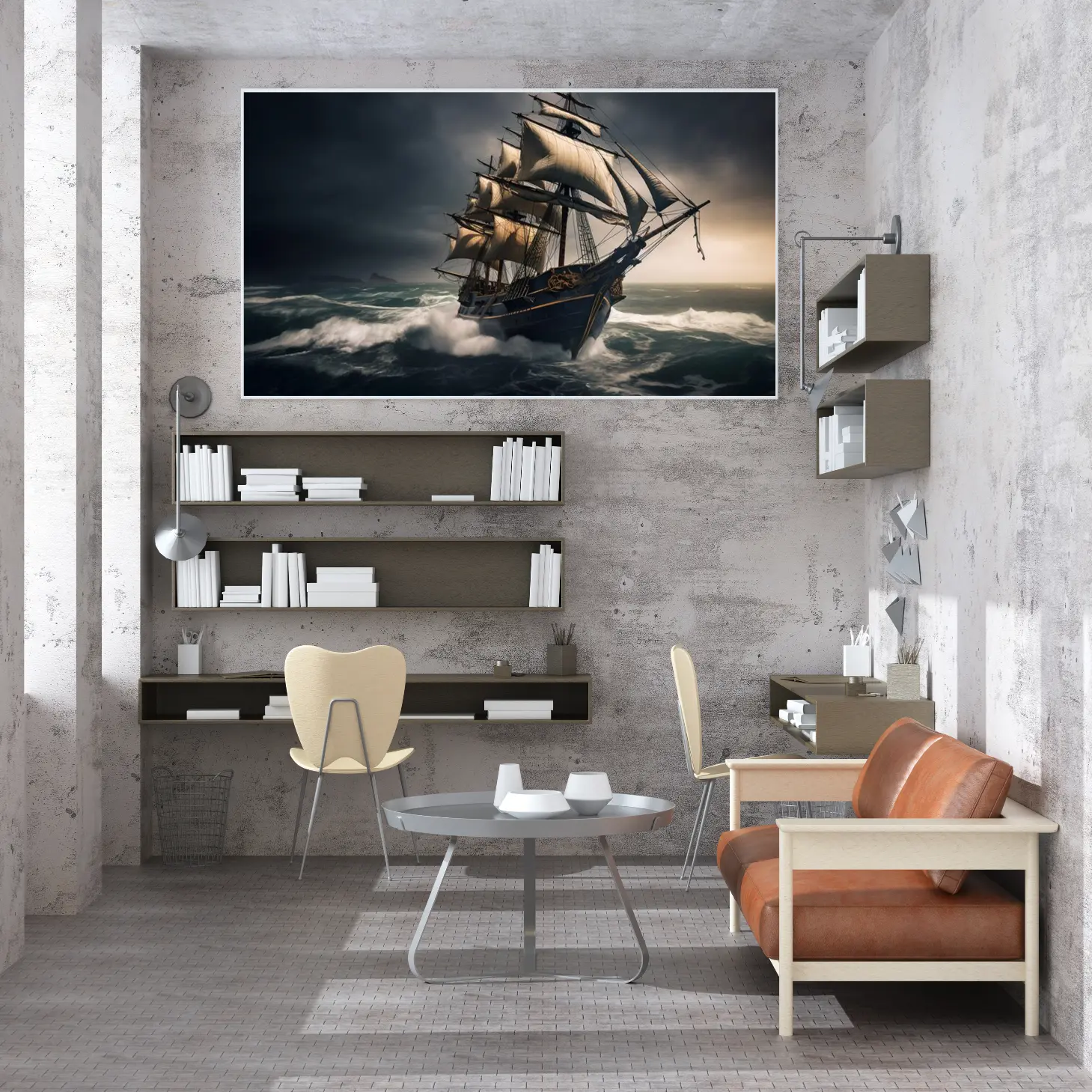 تجسد هذه اللوحة الفنية مشهداً مهيباً يلتقط روح المغامرة والحرية، حيث تبحر سفينة عريقة وسط أمواج عاتية تحت سماء غائمة. تعكس الألوان الداكنة والظلال العميقة إحساساً بالدراما، مما يضفي على المكان جواً من الإثارة والتشويق. إن هذه القطعة الفنية ليست مجرد ديكور جداري، بل هي نافذة إلى عالم من القصص البحرية والأساطير، مما يجعلها إضافة مثالية لأي مساحة تعكس نمط حياة مفعم بالحيوية.