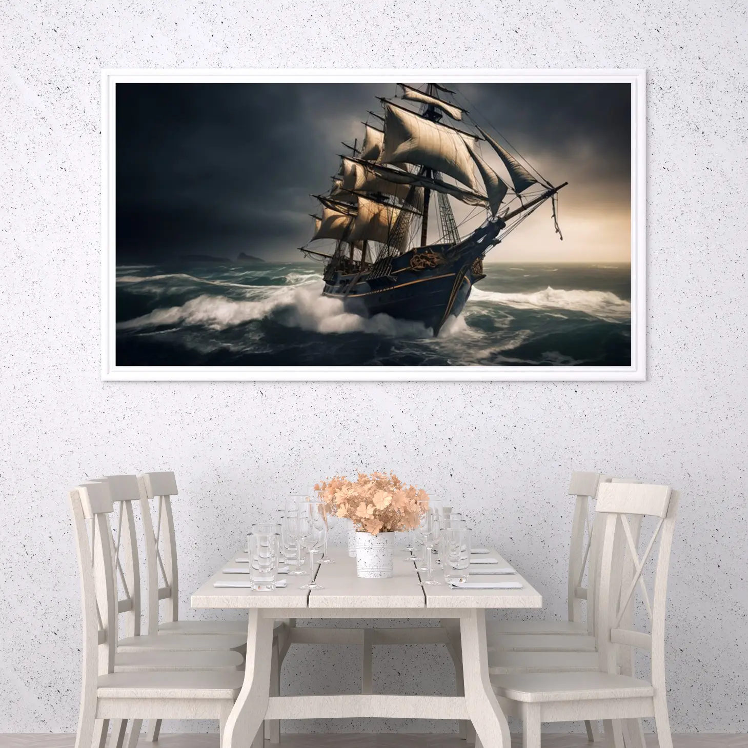 استمتع بجمال هذه اللوحة الفاخرة التي تجسد لحظة مثيرة من مغامرات البحر، حيث يبحر السفينة الشامخة وسط الأمواج المتلاطمة. تتوفر بأحجام متعددة وإطارات أنيقة، مما يجعلها خيارًا مثاليًا لإضفاء لمسة من الأناقة على أي مساحة، أو كهدية تعبّر عن الذوق الرفيع في المناسبات الخاصة.