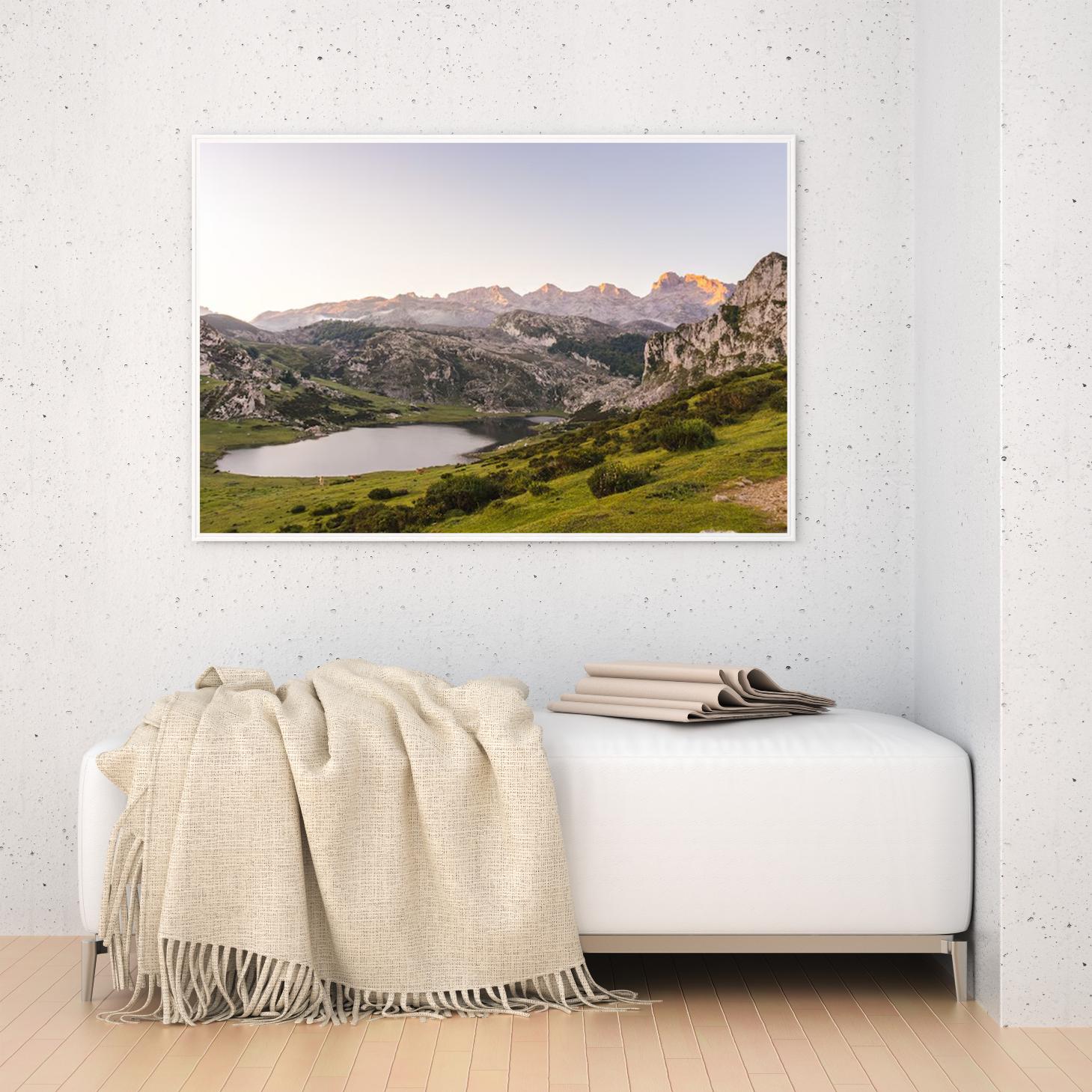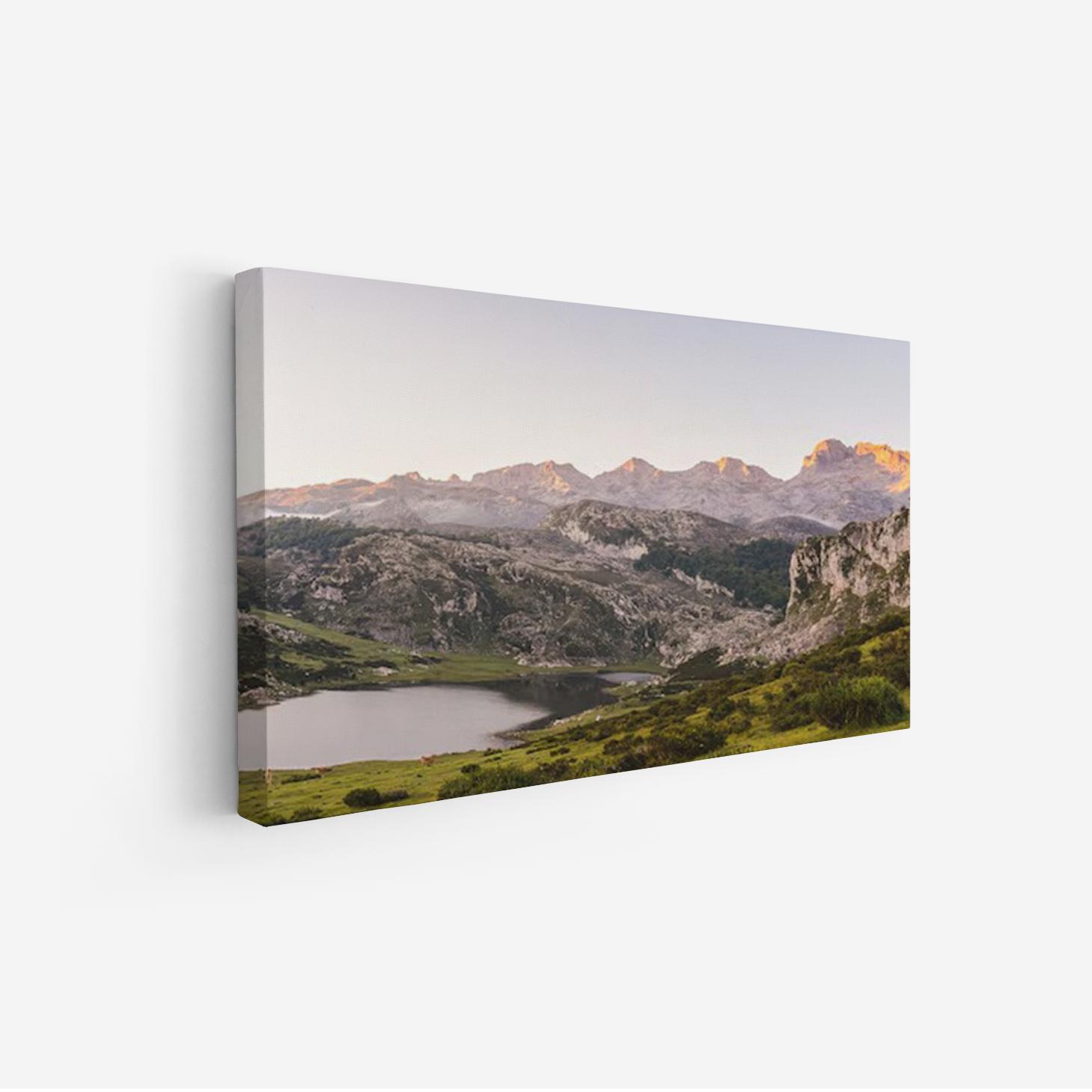 لوحة جبال – بحيرة هادئة – ألوان دافئة – مشمس – لوحات طبيعة – لوحات كانفاس