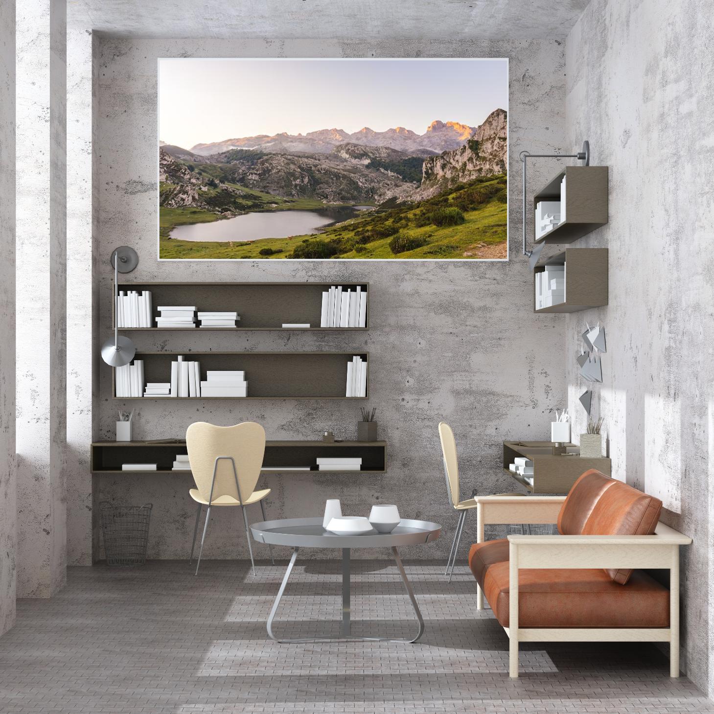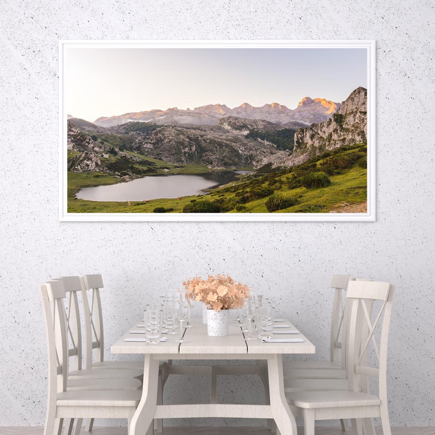 تتجلى في هذه اللوحة جماليات الطبيعة الخلابة، حيث تتناغم الألوان الدافئة مع المناظر الجبلية الشاهقة، مما يخلق إحساسًا بالهدوء والسكينة. تعكس الأضواء المتلألئة على سطح البحيرة صفاء الأجواء، بينما تضفي الجبال المحيطة شعورًا بالعظمة والاتساع. إن هذه القطعة الفنية ليست مجرد إضافة جمالية، بل هي استثمار في الأجواء التي تعيشها، حيث تساهم في تحويل أي مساحة إلى ملاذ من الراحة والسكينة.