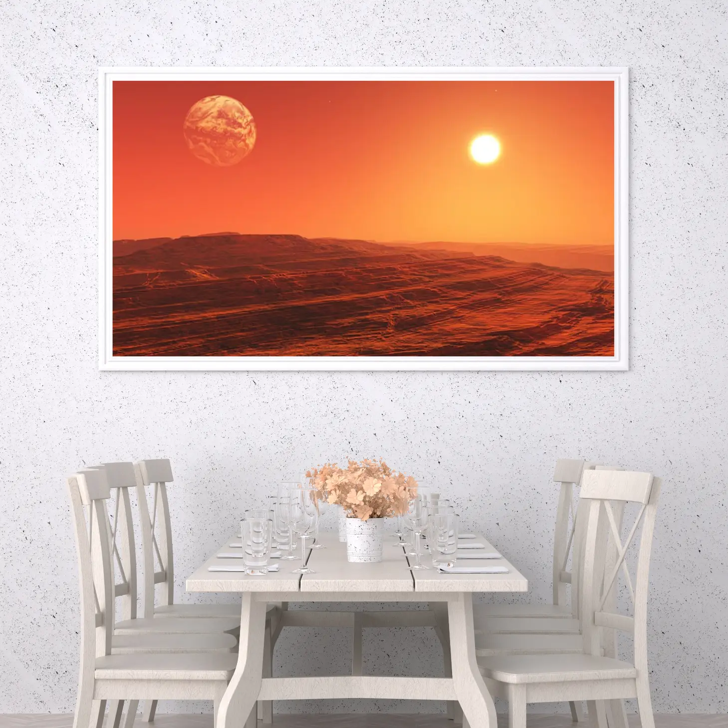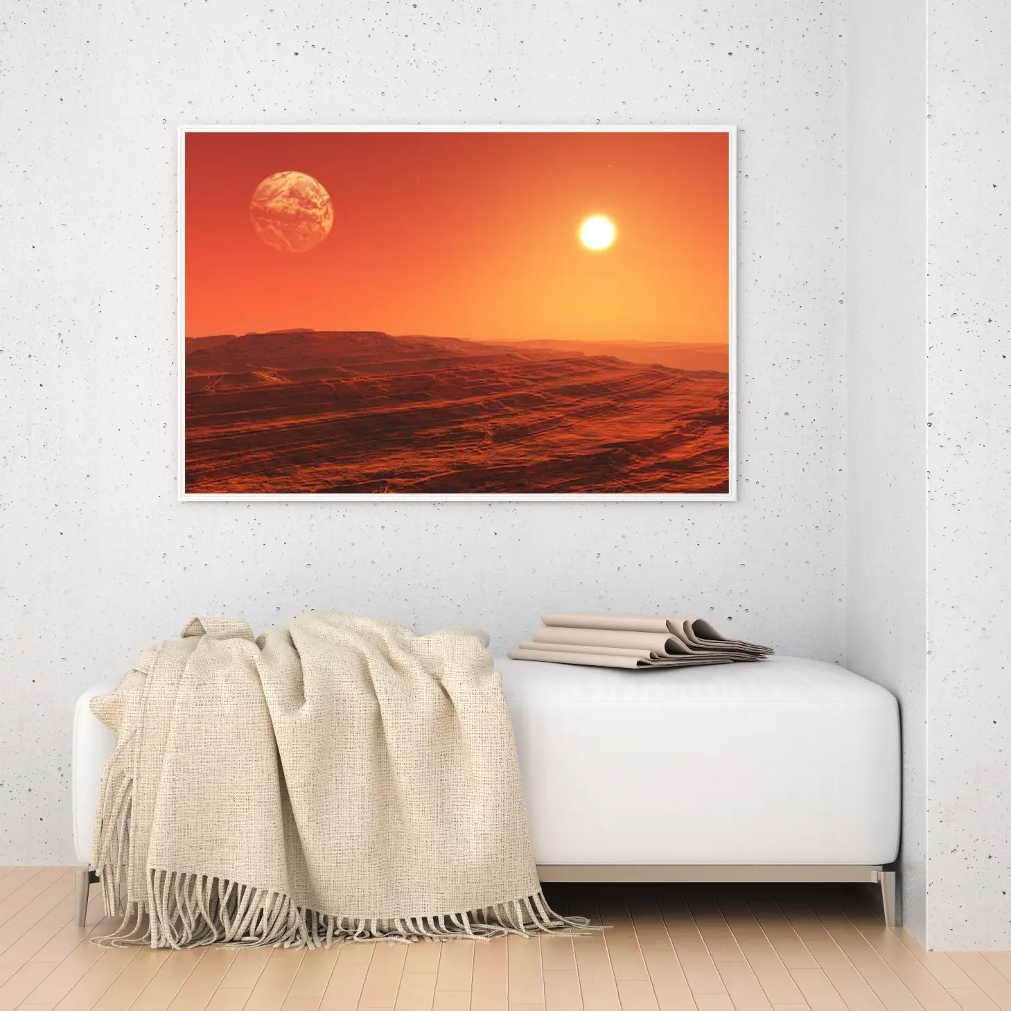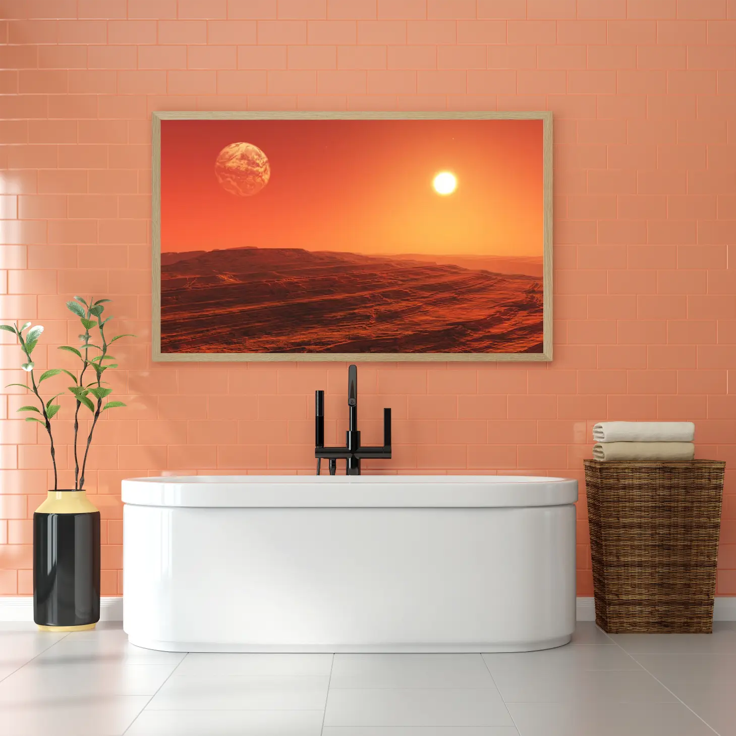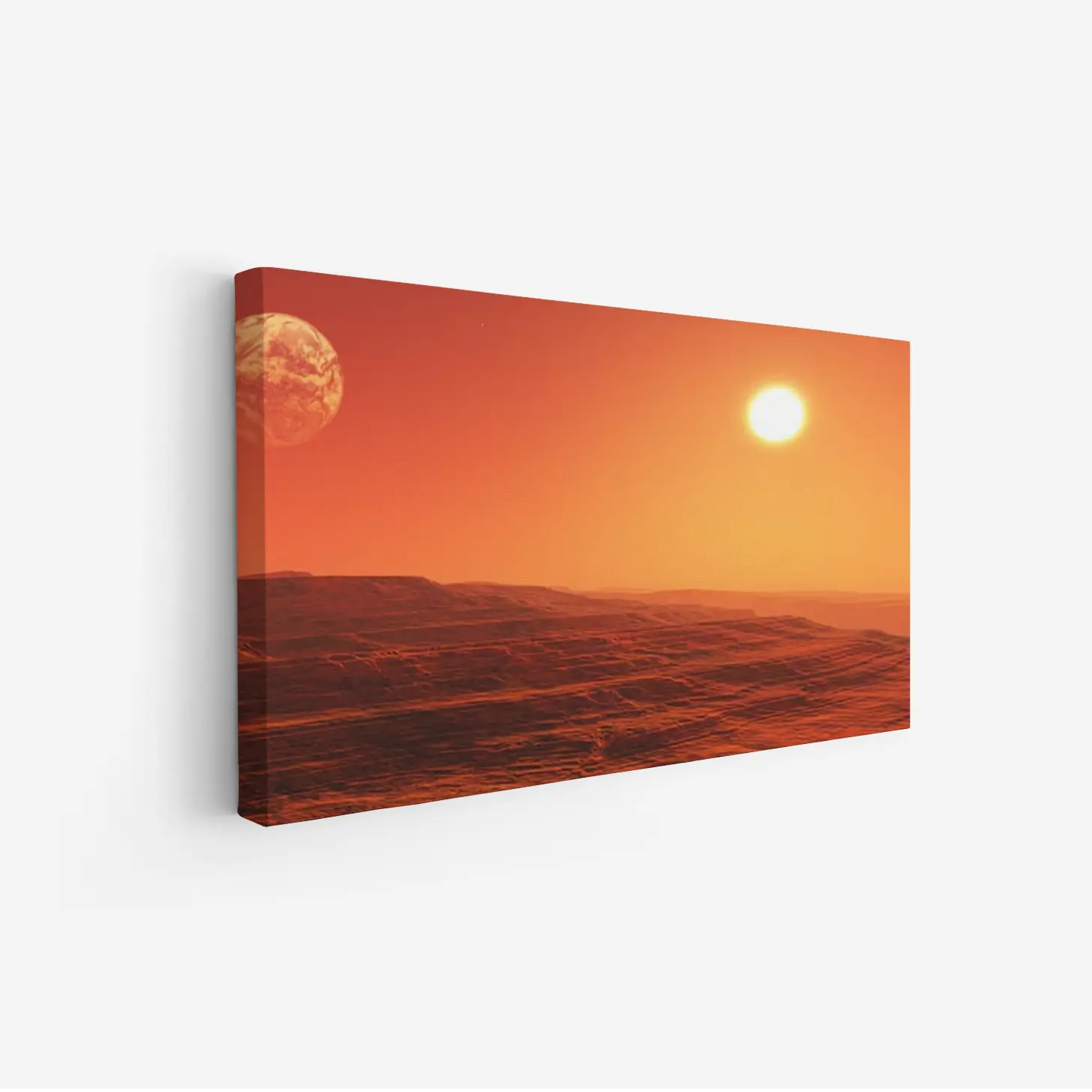 لوحة جبال برتقالية تحت شمس ساطعة مع كوكب في الأفق، مناظر طبيعية، لوحات فنية عصرية، لوحات جدارية للمنزل.