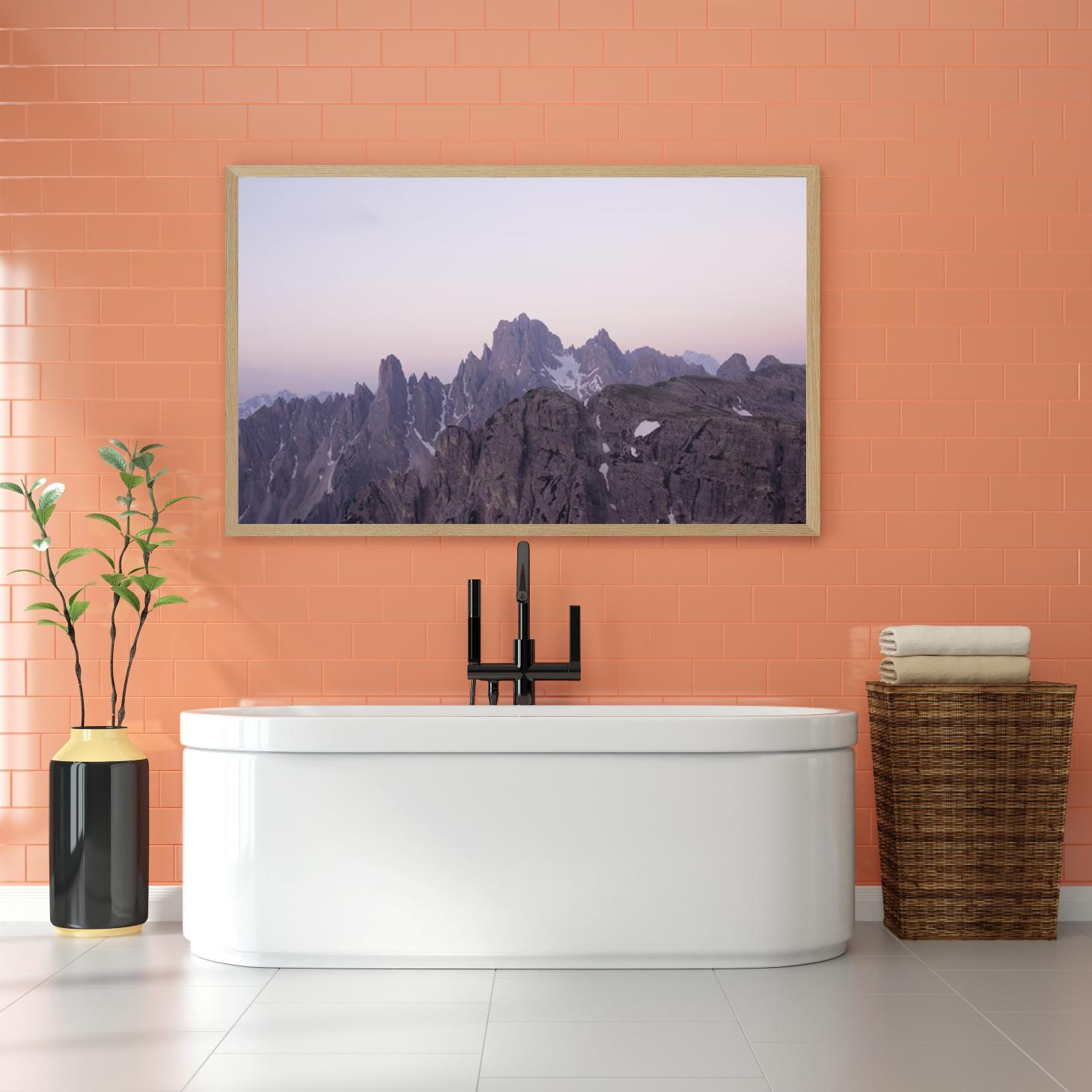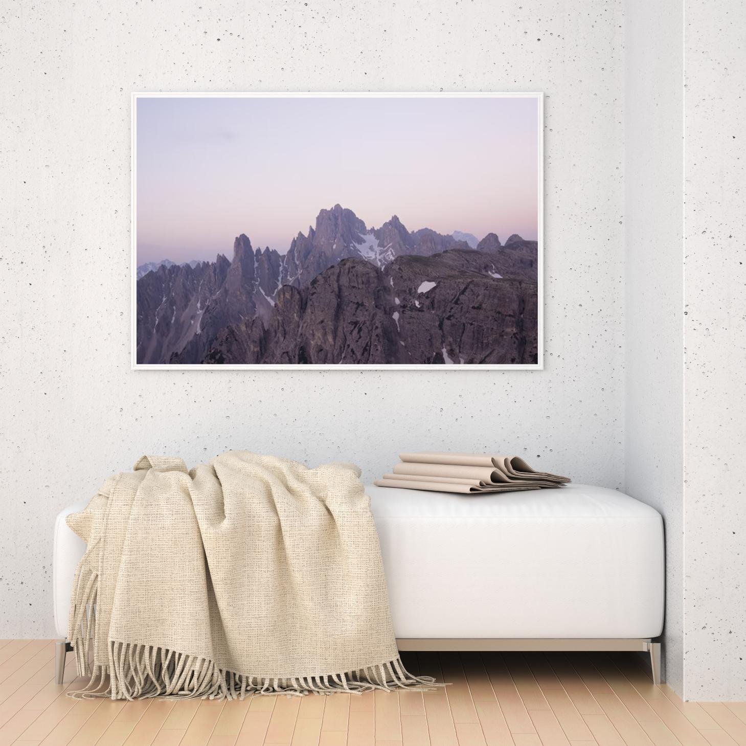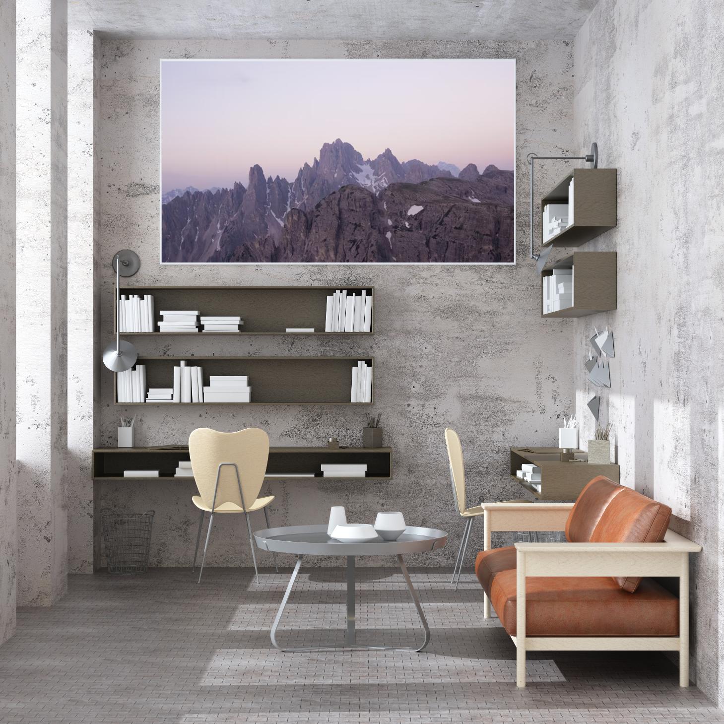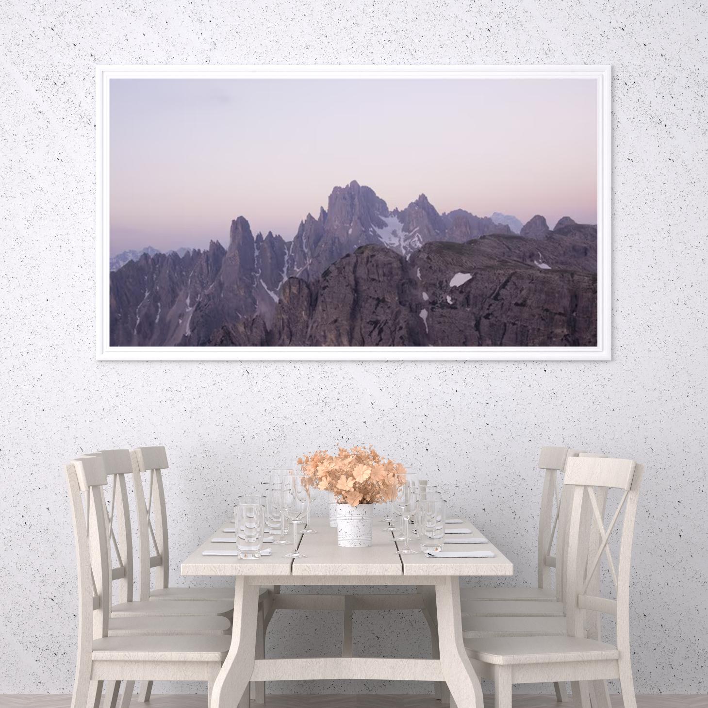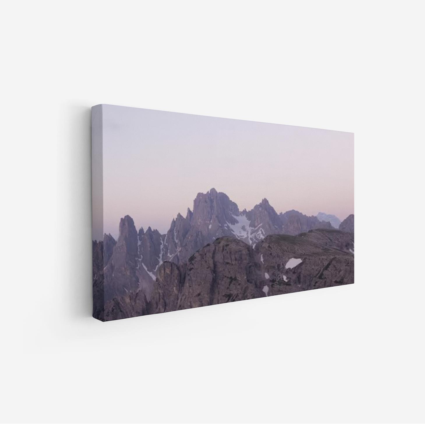 تتجلى في هذه اللوحة جماليات الطبيعة الخلابة، حيث تتناغم الألوان الهادئة مع تضاريس الجبال الشاهقة، مما يضفي إحساسًا بالسكينة والهدوء على أي مساحة تُعرض فيها. تعكس الألوان الوردية والرمادية في الأفق لحظات الغروب الساحرة، مما يجعلها قطعة فنية تضفي لمسة من السحر والرقي على ديكور منزلي عصري. إن هذه اللوحة ليست مجرد عنصر زينة، بل هي استثمار جمالي يثري الأجواء ويعكس أسلوب حياة متوازن.