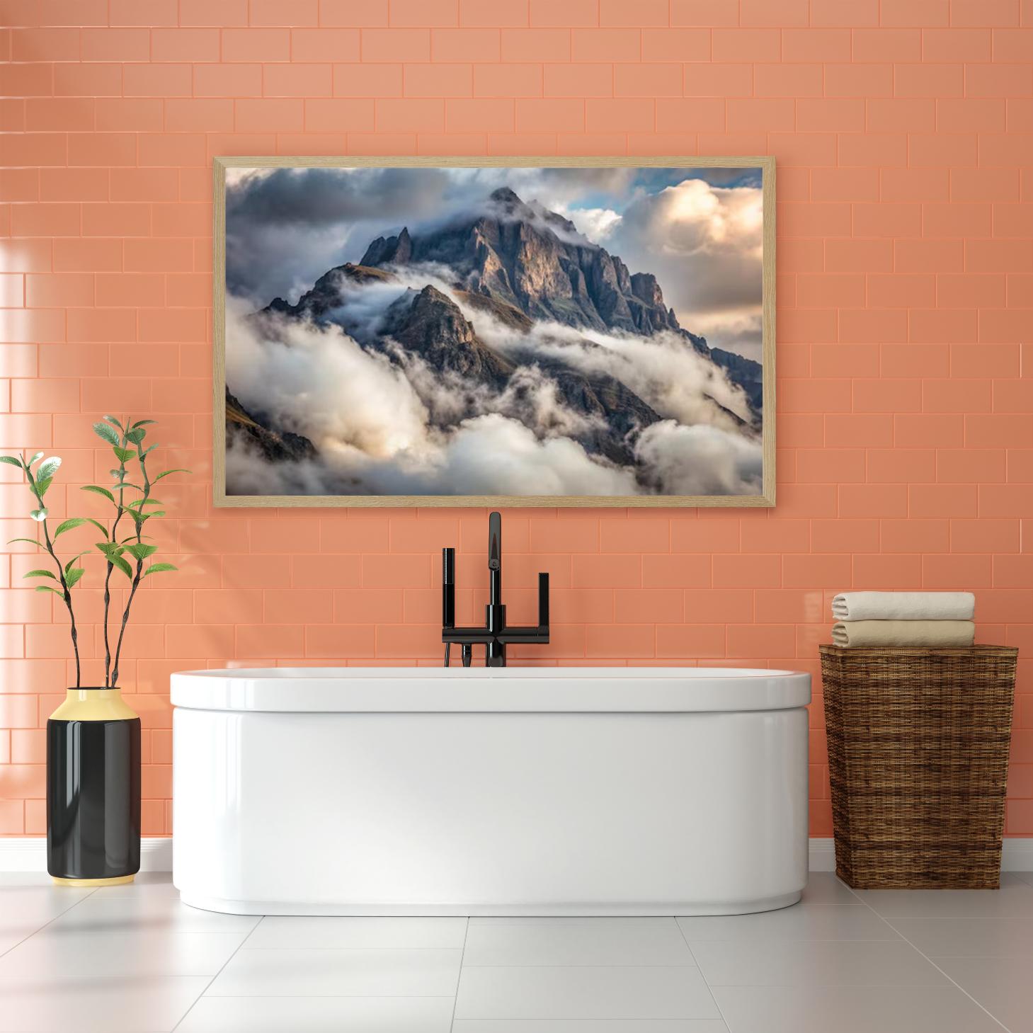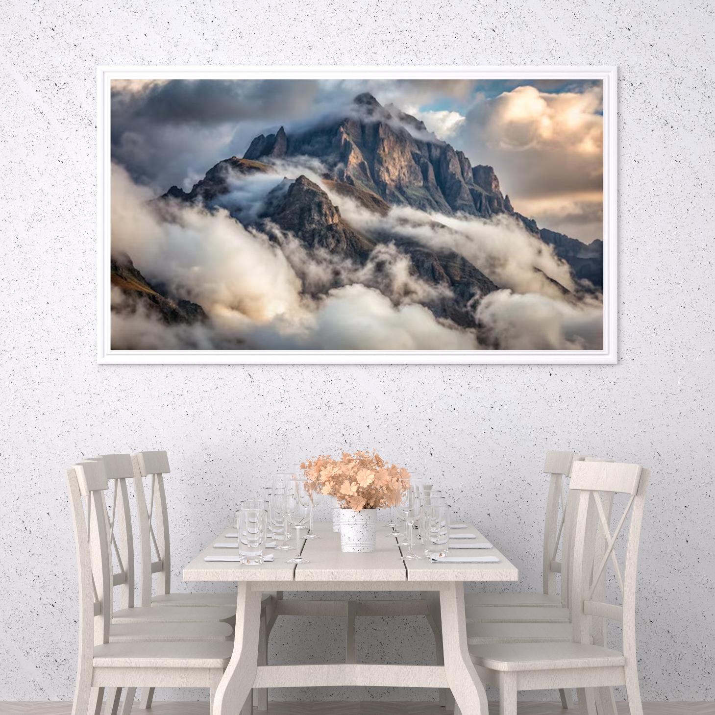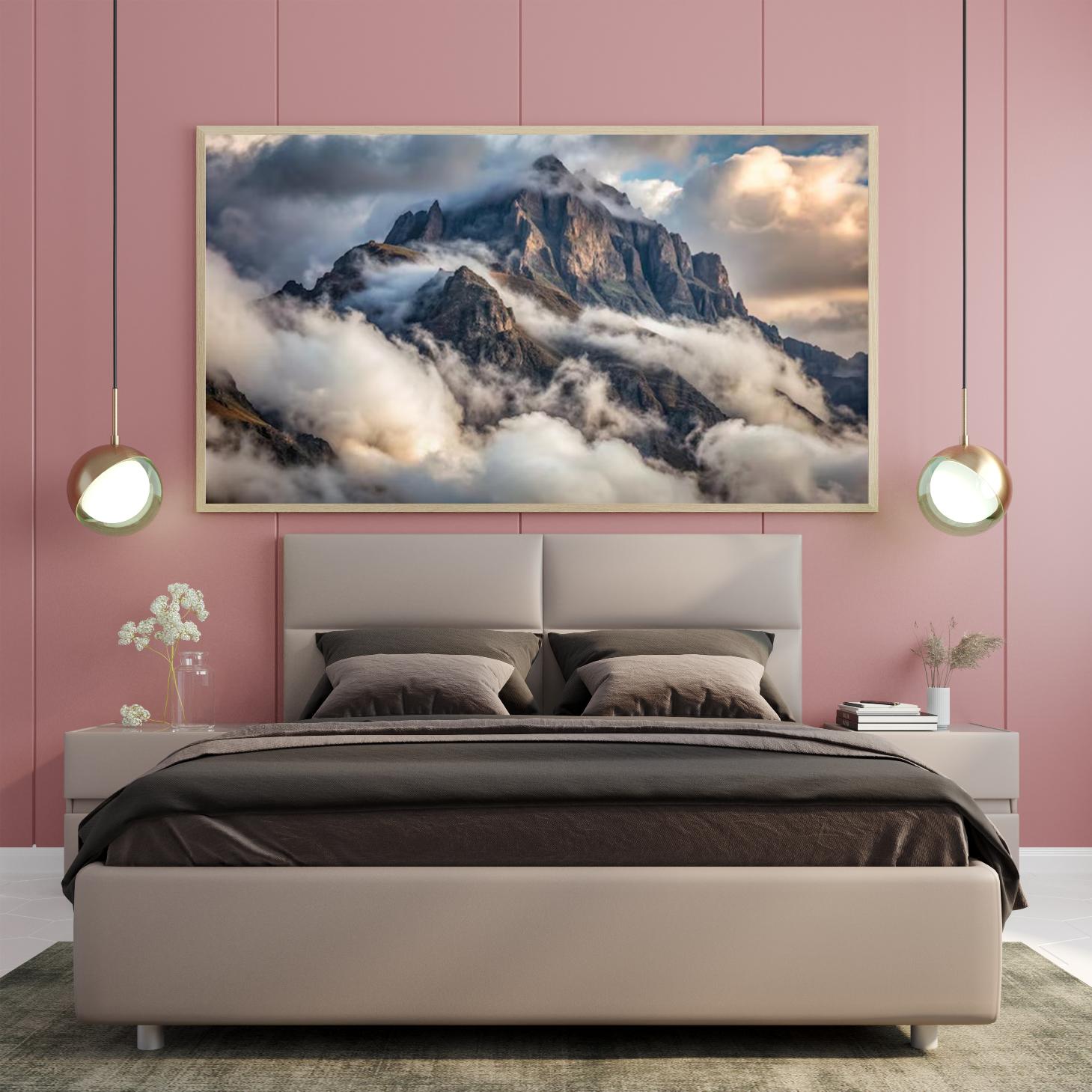 تتجلى في هذه اللوحة جماليات الطبيعة الخلابة، حيث تتعانق الجبال الشاهقة مع السحب البيضاء الناعمة، مما يخلق مشهداً ساحراً يبعث على الهدوء والاسترخاء. تعكس الألوان الدافئة والباردة تبايناً رائعاً، مما يضفي على المكان أجواءً من السكينة والسكوت. هذه القطعة الفنية ليست مجرد عنصر ديكور، بل هي استثمار جمالي يضيف لمسة من الأناقة والرقي إلى أي مساحة.