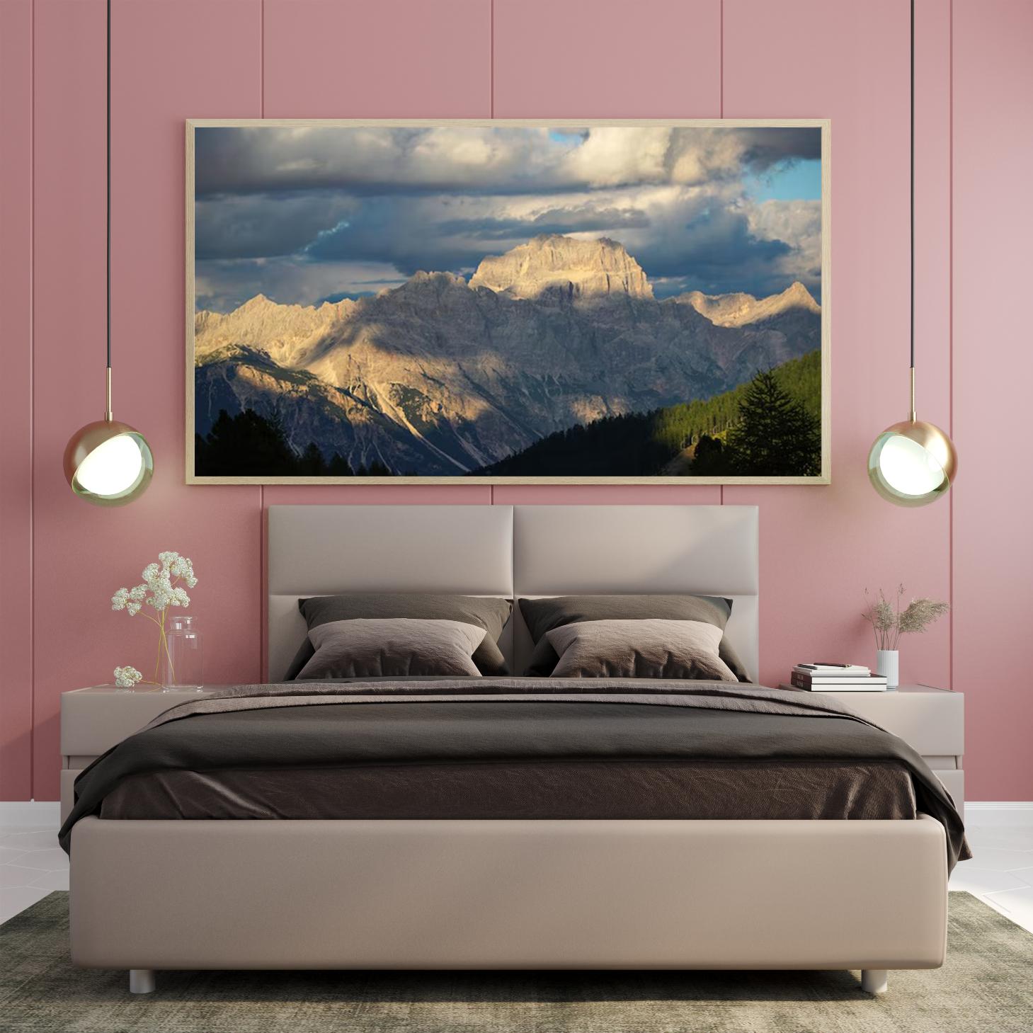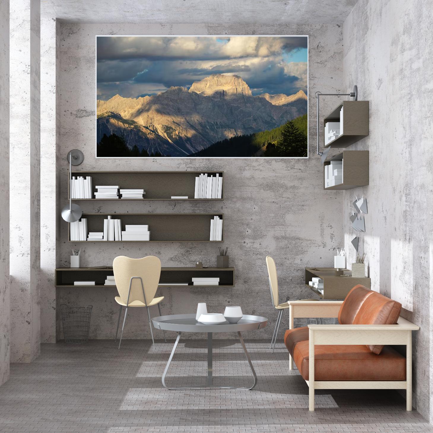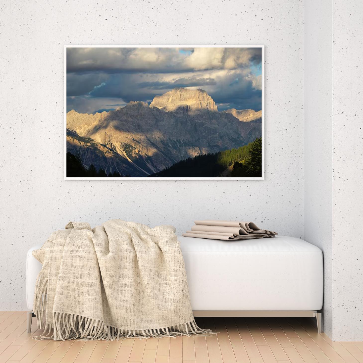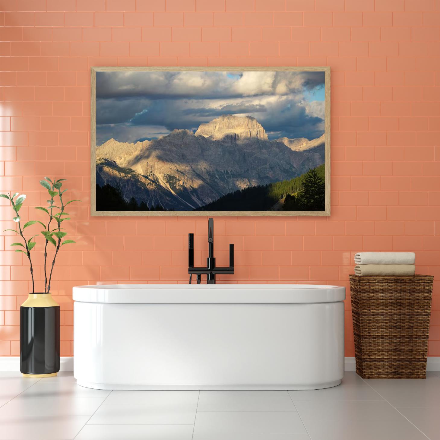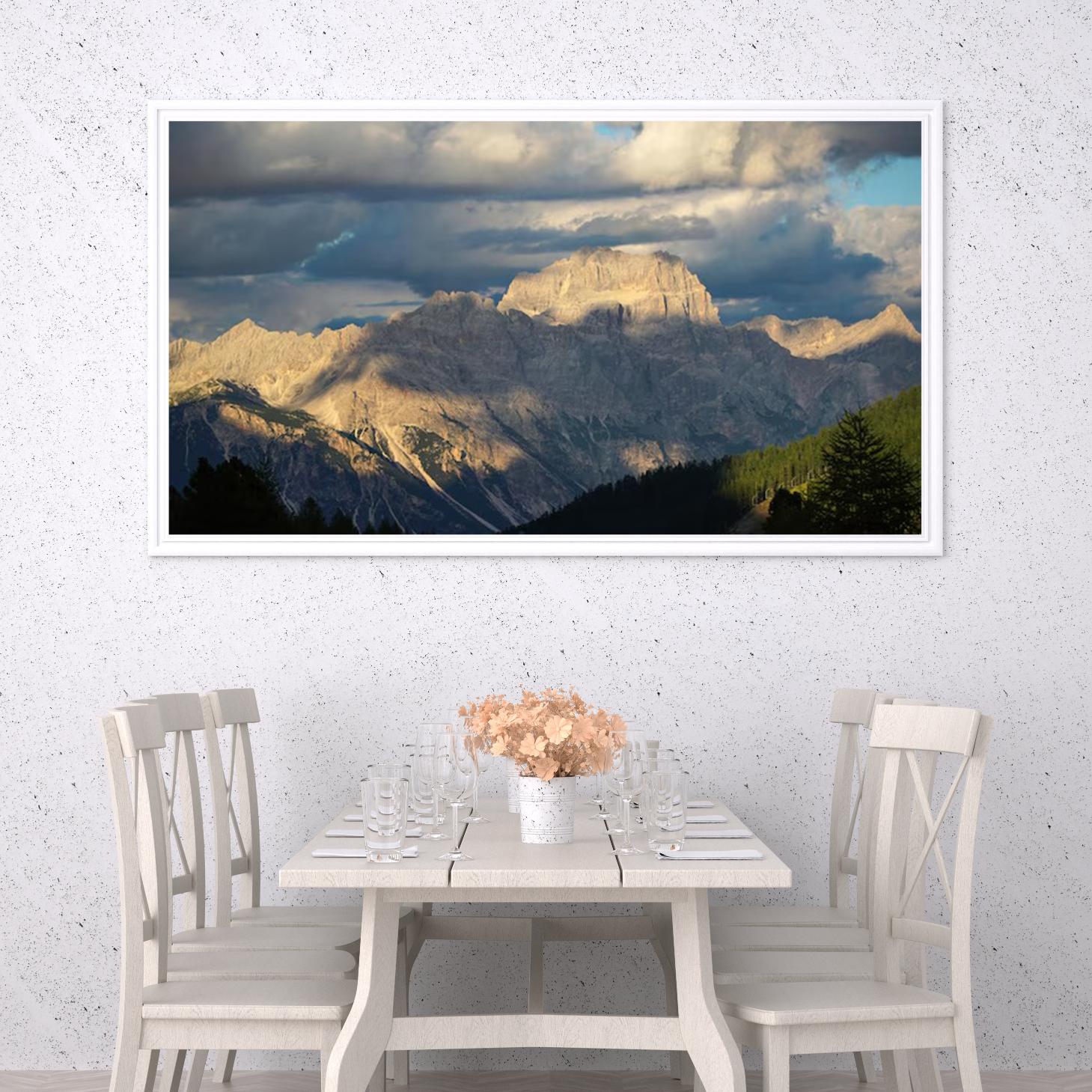 تجسد هذه اللوحة الجدارية مشهدًا طبيعيًا خلابًا يبرز عظمة الجبال تحت سماء ملبدة بالغيوم، حيث تتناغم الألوان الدافئة مع الظلال العميقة لتخلق إحساسًا بالهدوء والسكينة. إن هذا العمل الفني يضفي لمسة من الفخامة على أي مساحة، مما يجعله خيارًا مثاليًا لمن يسعى لإضفاء جو من الرقي والتميز على منزله أو مكتبه. إن التأمل في تفاصيل هذا المشهد يبعث على الاسترخاء ويعزز من جودة الحياة اليومية.