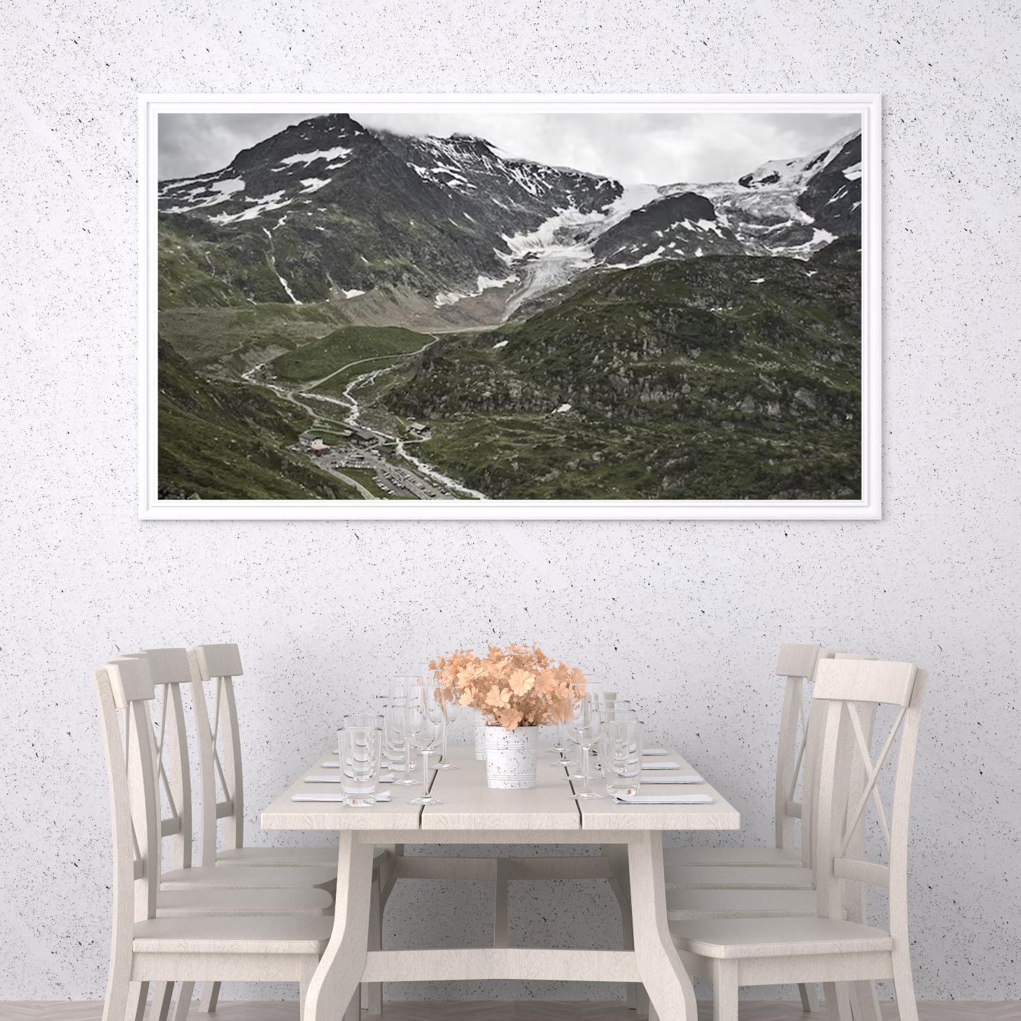 تجسد هذه اللوحة جمال الطبيعة الخلابة، حيث تتناغم الجبال الشاهقة مع السحب الرمادية، مما يخلق أجواءً من السكون والهدوء. تعكس المناظر الطبيعية المهيبة إحساسًا بالتحرر والانطلاق، مما يجعلها خيارًا مثاليًا لإضفاء لمسة من الرقي على أي مساحة. إن تأثير هذه القطعة الفنية على الأجواء المحيطة لا يقتصر فقط على الجمال البصري، بل يمتد ليشمل تعزيز نمط الحياة الهادئ والمريح.