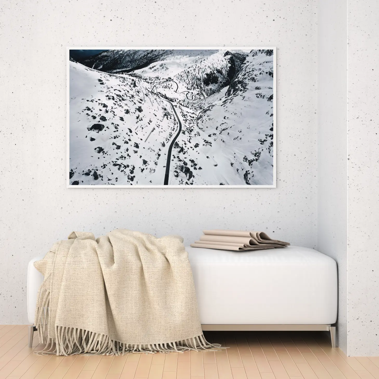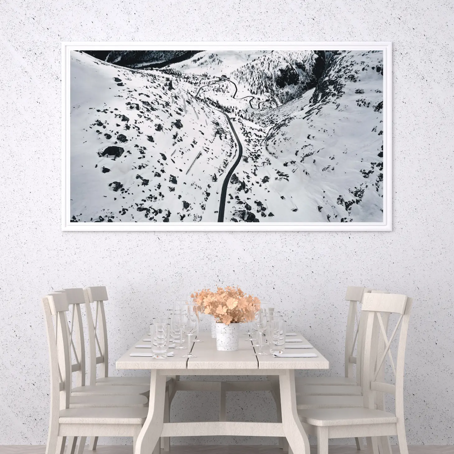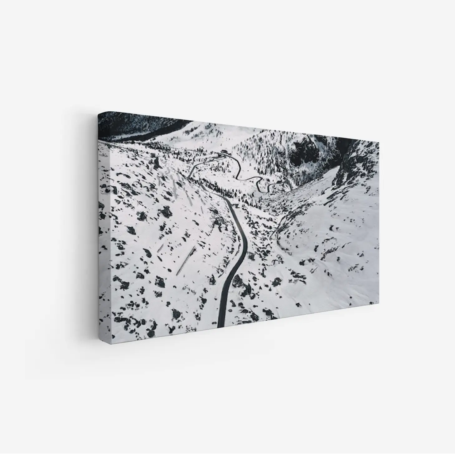 تتجلى في هذه اللوحة جماليات الطبيعة الخلابة، حيث تلتقي الجبال المغطاة بالثلوج مع الطرق المتعرجة التي تنساب بين المناظر الطبيعية. تعكس الألوان الأحادية تباينًا رائعًا، مما يضفي إحساسًا بالهدوء والسكون، ويخلق أجواءً مثالية تضفي لمسة من الرقي على أي مساحة. إن هذه القطعة الفنية ليست مجرد ديكور جداري، بل هي دعوة لاستكشاف جمال الطبيعة في أبهى صورها، مما يجعلها إضافة مثالية لأي منزل أو مكتب.