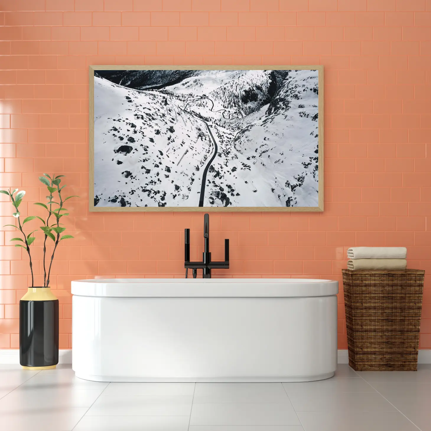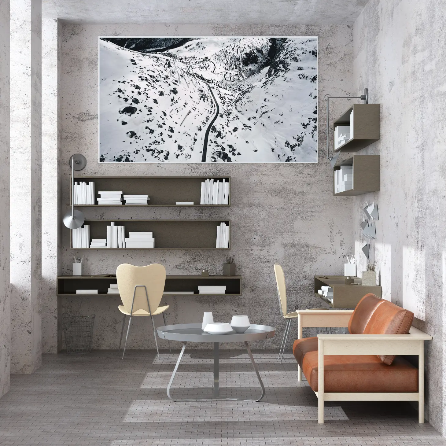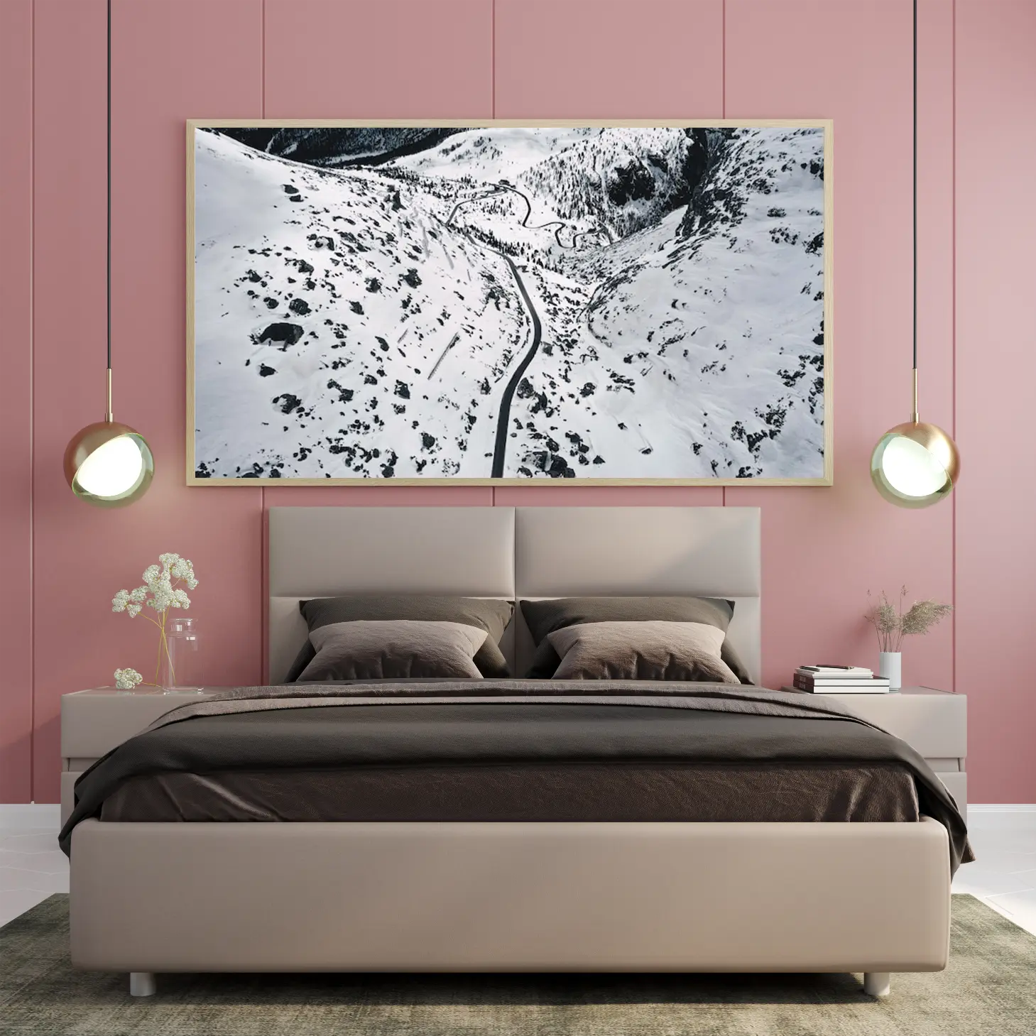 تتجلى في هذه اللوحة جماليات الطبيعة الخلابة، حيث تلتقي الجبال المغطاة بالثلوج مع الطرق المتعرجة التي تنساب بين المناظر الطبيعية. تعكس الألوان الأحادية تباينًا رائعًا، مما يضفي إحساسًا بالهدوء والسكون، ويخلق أجواءً مثالية تضفي لمسة من الرقي على أي مساحة. إن هذه القطعة الفنية ليست مجرد ديكور جداري، بل هي دعوة لاستكشاف جمال الطبيعة في أبهى صورها، مما يجعلها إضافة مثالية لأي منزل أو مكتب.