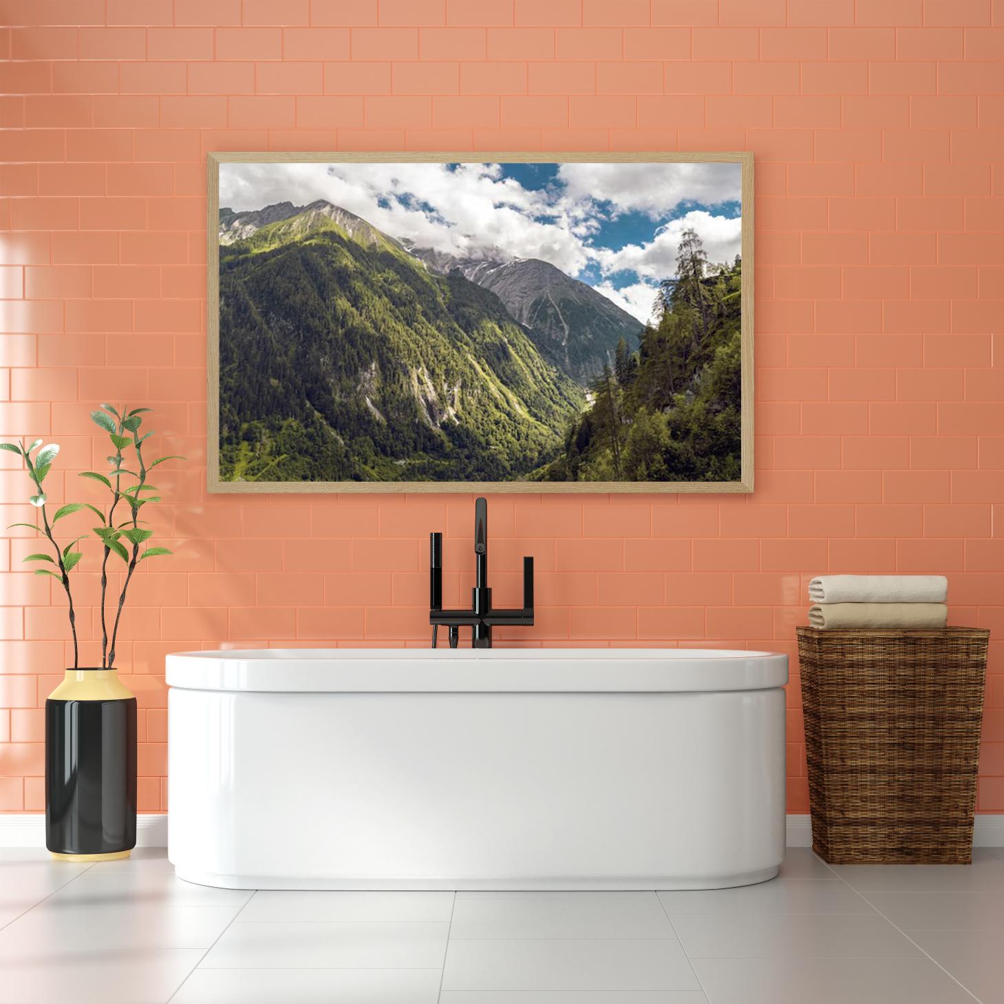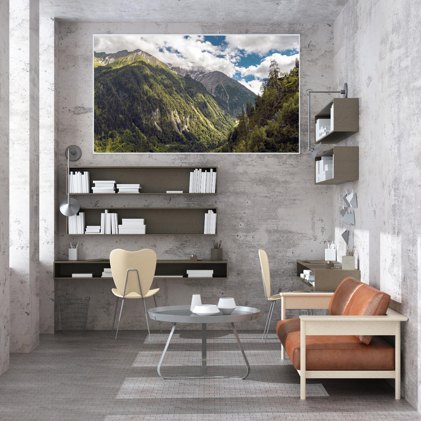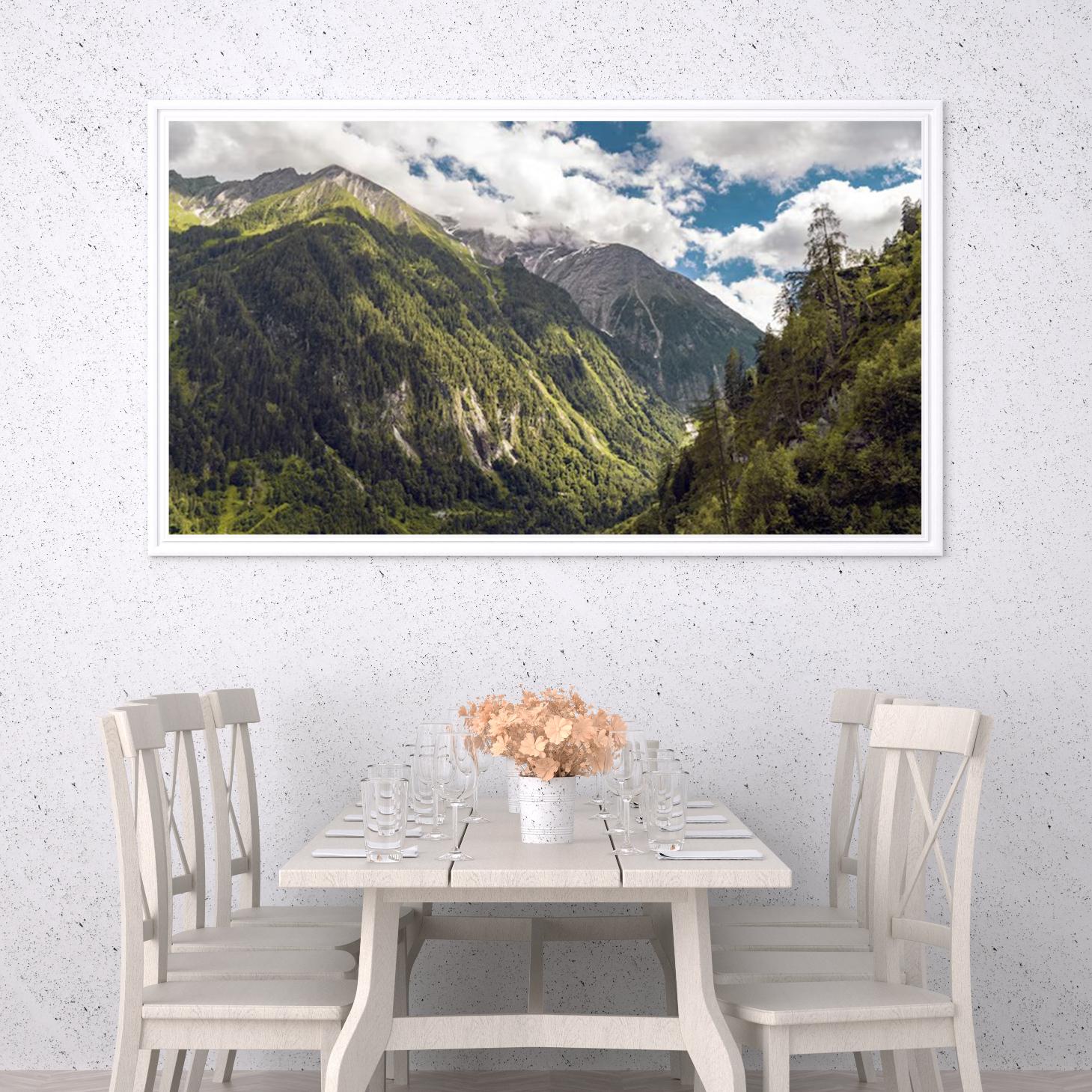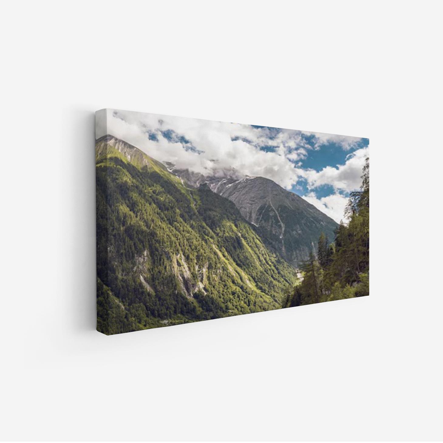 تتجلى في هذه اللوحة جماليات الطبيعة الخلابة، حيث تتناغم الجبال الشاهقة مع الغابات الكثيفة تحت سماء زرقاء مزدانة بالغيوم البيضاء. تعكس الألوان الزاهية والظلال العميقة إحساسًا بالهدوء والسكينة، مما يجعلها خيارًا مثاليًا لإضفاء لمسة من الأناقة على أي مساحة. إن هذا العمل الفني لا يقتصر فقط على كونه قطعة ديكور جداري، بل هو استثمار جمالي يضفي طابعًا عصريًا على نمط الحياة.