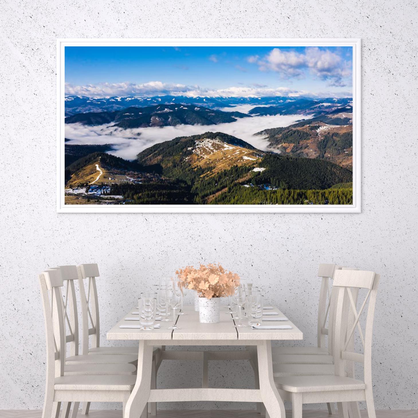 تتجلى في هذه اللوحة مشاهد طبيعية ساحرة تأخذ الأنفاس، حيث تتداخل الجبال الشاهقة مع السحب البيضاء التي تتدفق كالبحر فوق الوديان. الألوان الزاهية تعكس جمال الطبيعة، مما يضفي شعورًا بالهدوء والسكينة على أي مساحة تُعرض فيها. إن هذه القطعة الفنية ليست مجرد ديكور جداري، بل هي نافذة إلى عالم من الجمال الطبيعي، تضفي على المكان لمسة من الرقي والتميز.