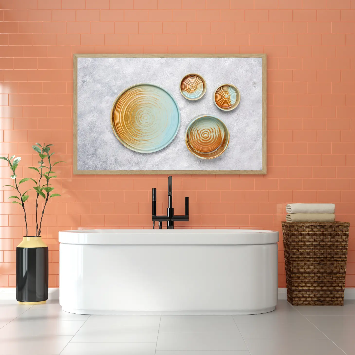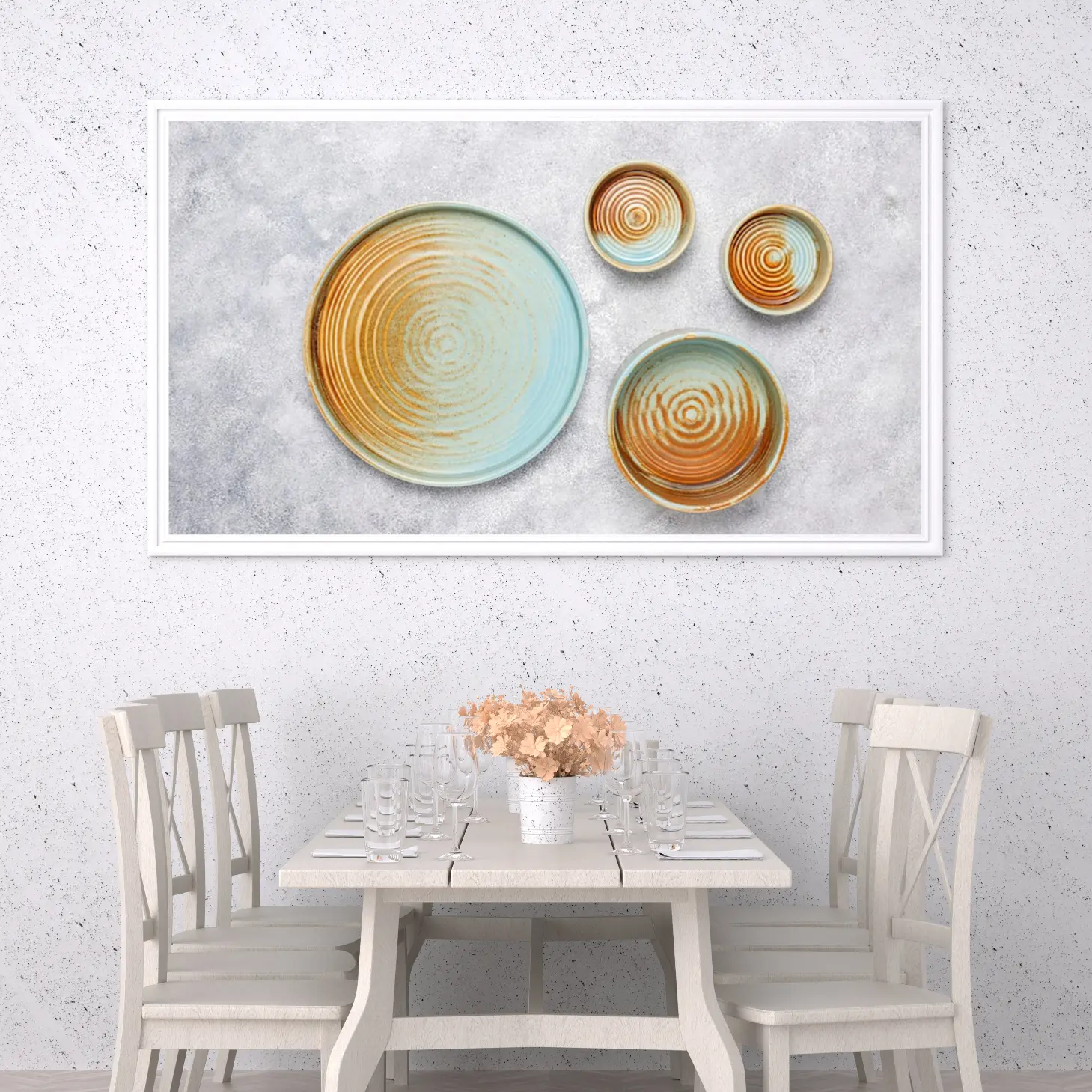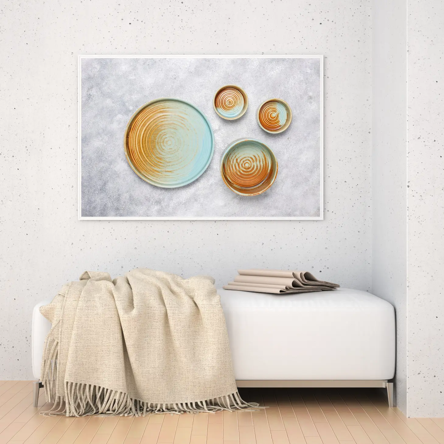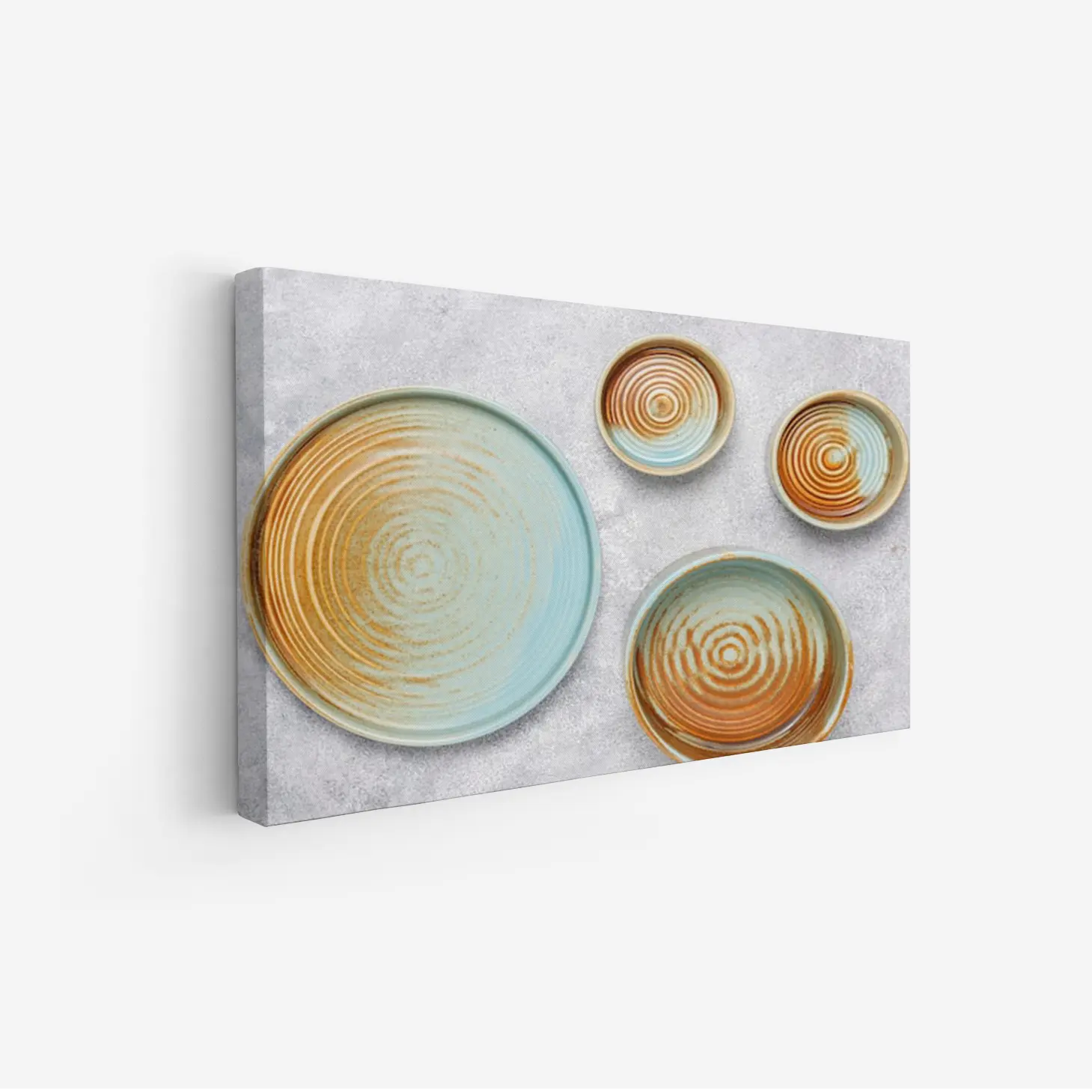 تتجلى في هذه اللوحة الفنية جماليات عصرية تتناغم مع الأجواء المنزلية، حيث تبرز الأطباق بألوانها المميزة وتفاصيلها الدقيقة. تعكس الألوان الزرقاء والبرونزية توازنًا فنيًا يضفي لمسة من الأناقة والهدوء على أي مساحة، مما يجعلها خيارًا مثاليًا لمن يسعى لإضفاء لمسة فنية على ديكوره. إن هذه القطعة ليست مجرد عنصر زينة، بل هي تعبير عن أسلوب حياة راقٍ يقدّر الجمال في التفاصيل.