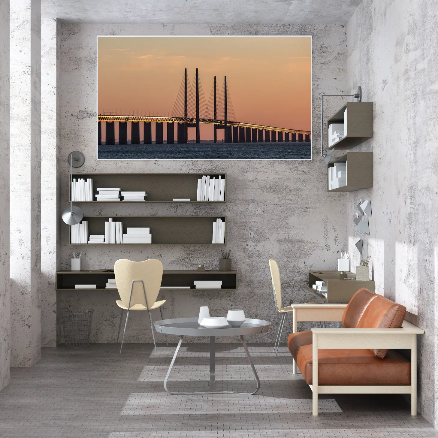 تجسد هذه اللوحة الفنية مشهدًا ساحرًا لجسر يمتد عبر الأفق، حيث تتداخل ألوان الغروب الهادئة مع تفاصيل الجسر المعمارية. يضفي هذا العمل لمسة من السحر على أي مساحة، مما يعكس أسلوب حياة عصري يتسم بالأناقة والذوق الرفيع. إن تأثير اللوحة على الأجواء المحيطة بها يخلق شعورًا بالهدوء والسكينة، مما يجعلها خيارًا مثاليًا لتزيين الجدران في المنازل أو المكاتب.