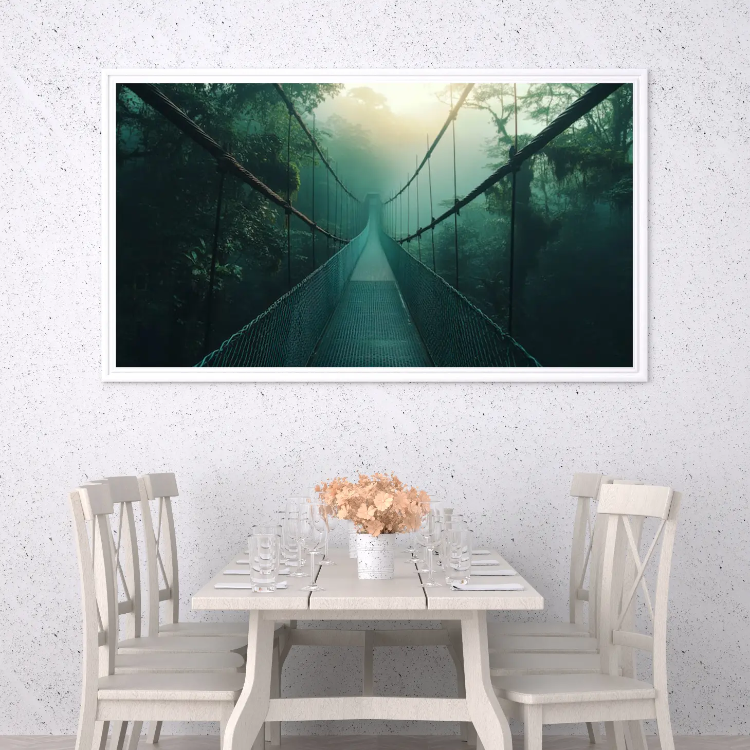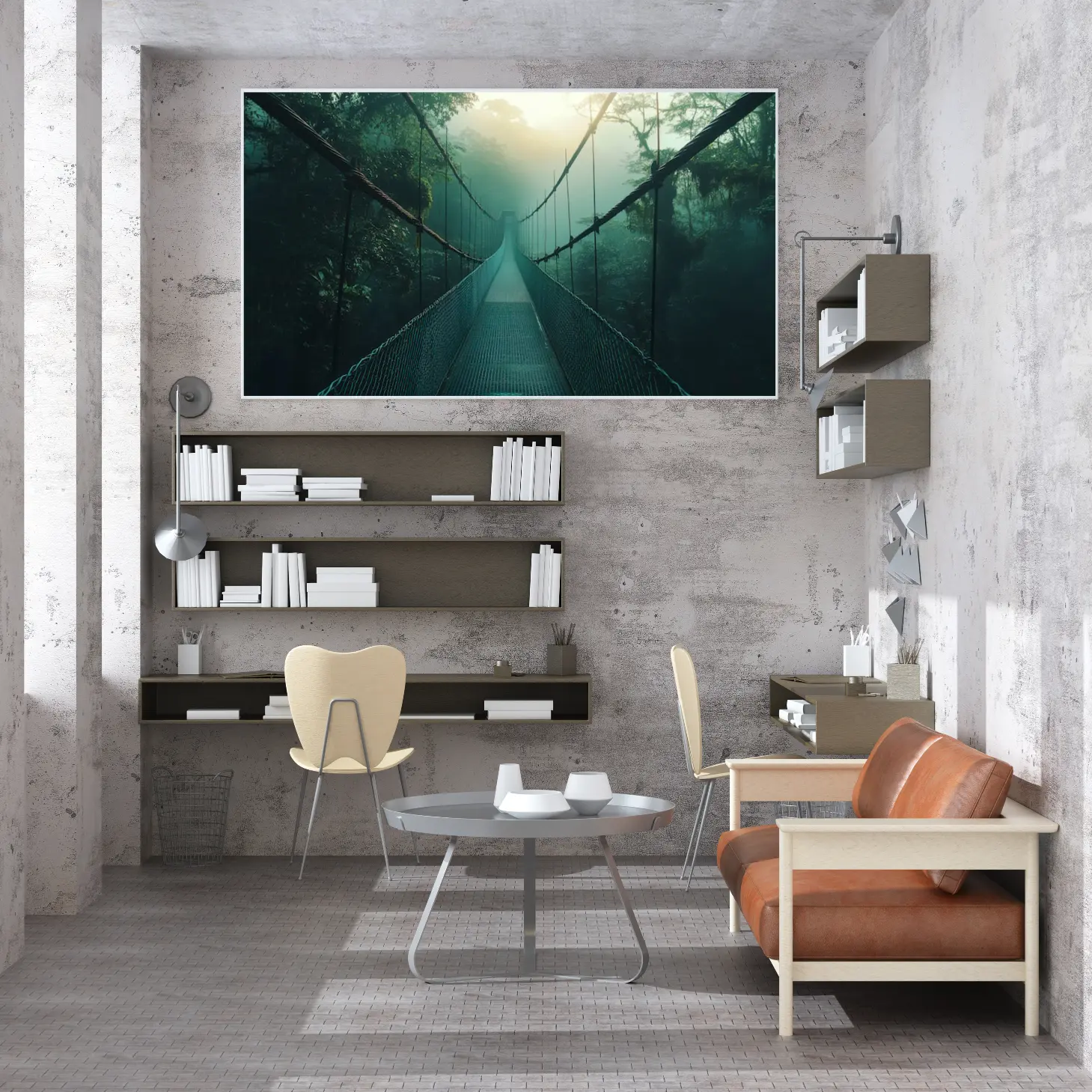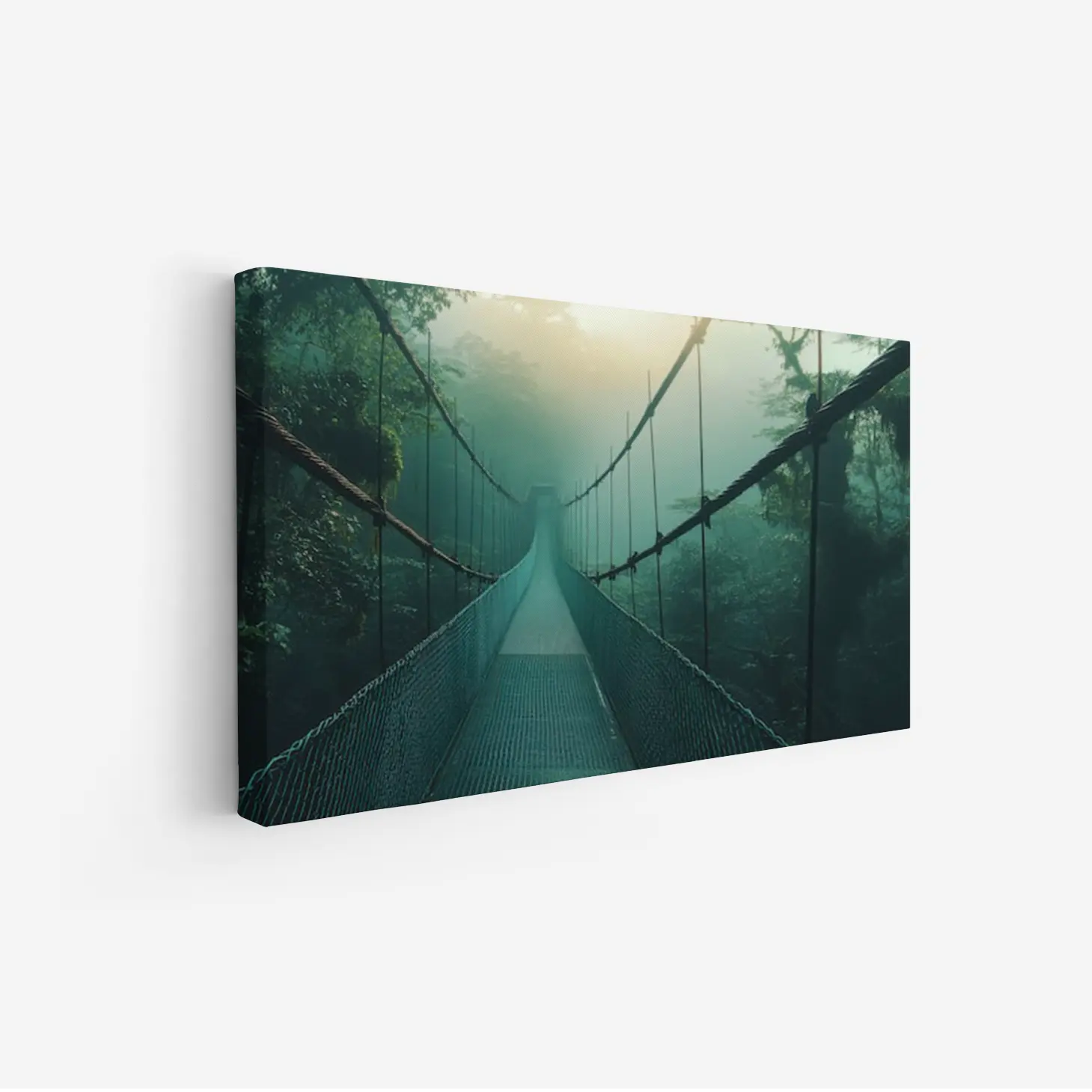 تتجلى في هذه اللوحة الفنية مشهدٌ ساحر لجسر معلق يربط بين ضفتين من الغابة الكثيفة، حيث تتسلل أشعة الشمس عبر الضباب لتضفي لمسة سحرية على الأجواء. يخلق هذا المشهد إحساسًا بالهدوء والتأمل، مما يجعله خيارًا مثاليًا لإضفاء لمسة من الجمال الطبيعي على أي مساحة. إن هذا العمل الفني لا يقتصر على كونه مجرد ديكور جداري، بل هو استثمار جمالي يعكس نمط حياة متوازن وأنيق.