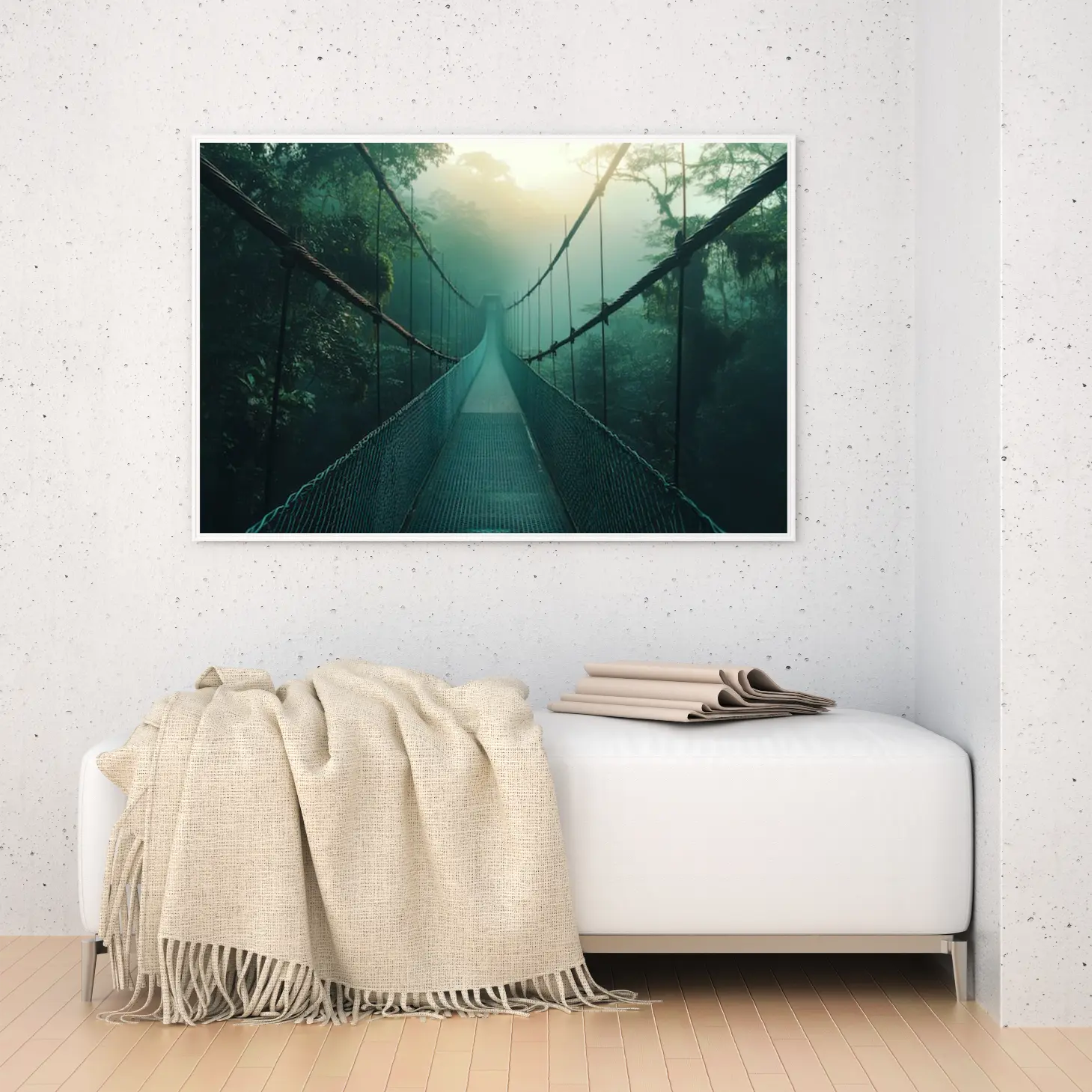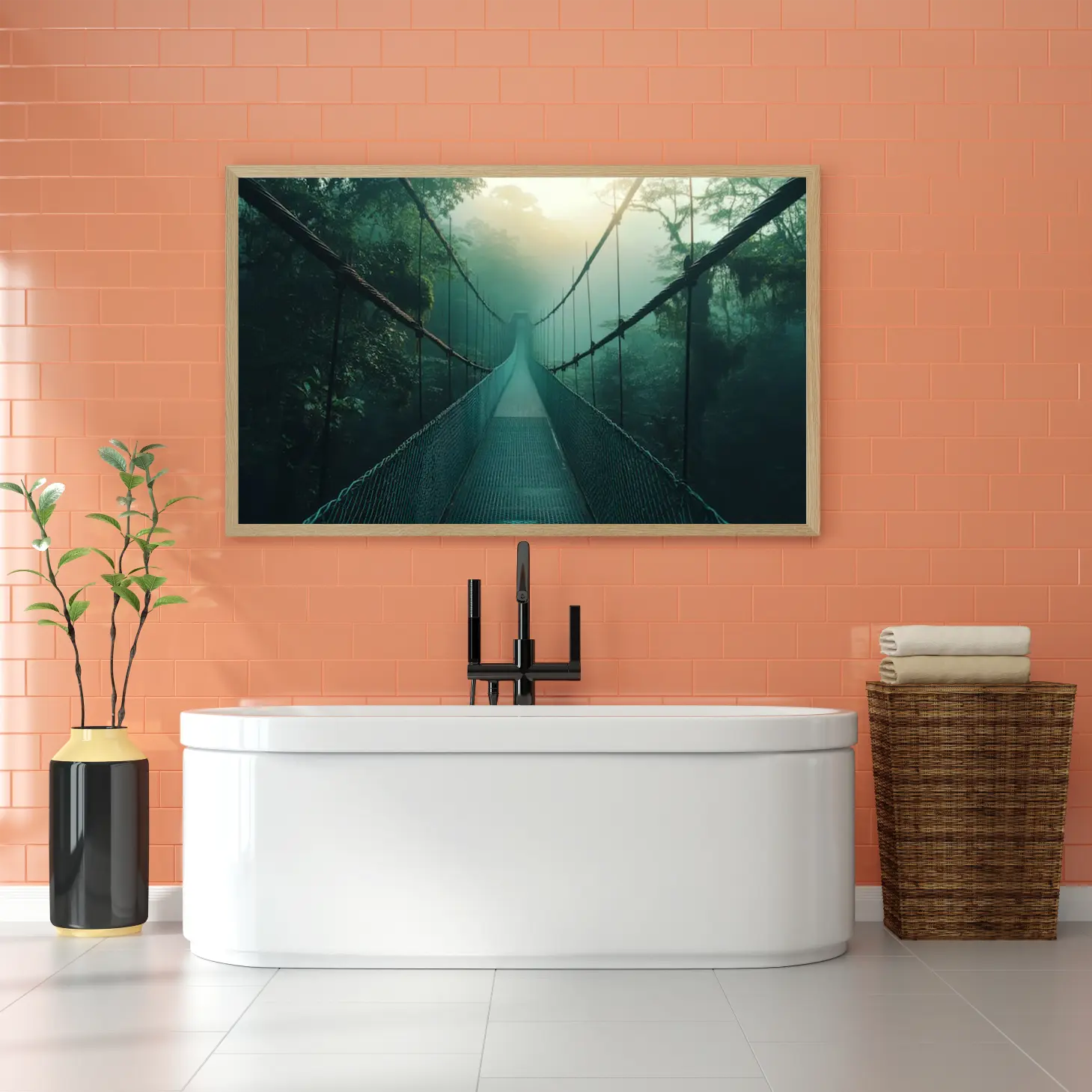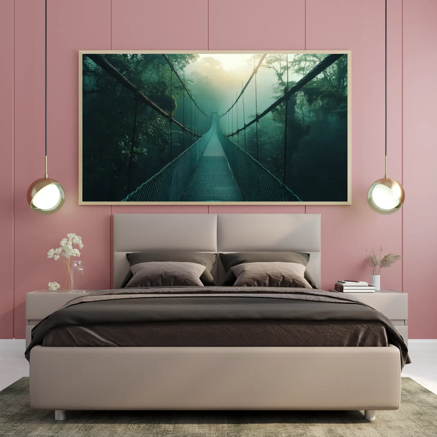 تتجلى في هذه اللوحة الفنية مشهدٌ ساحر لجسر معلق يربط بين ضفتين من الغابة الكثيفة، حيث تتسلل أشعة الشمس عبر الضباب لتضفي لمسة سحرية على الأجواء. يخلق هذا المشهد إحساسًا بالهدوء والتأمل، مما يجعله خيارًا مثاليًا لإضفاء لمسة من الجمال الطبيعي على أي مساحة. إن هذا العمل الفني لا يقتصر على كونه مجرد ديكور جداري، بل هو استثمار جمالي يعكس نمط حياة متوازن وأنيق.