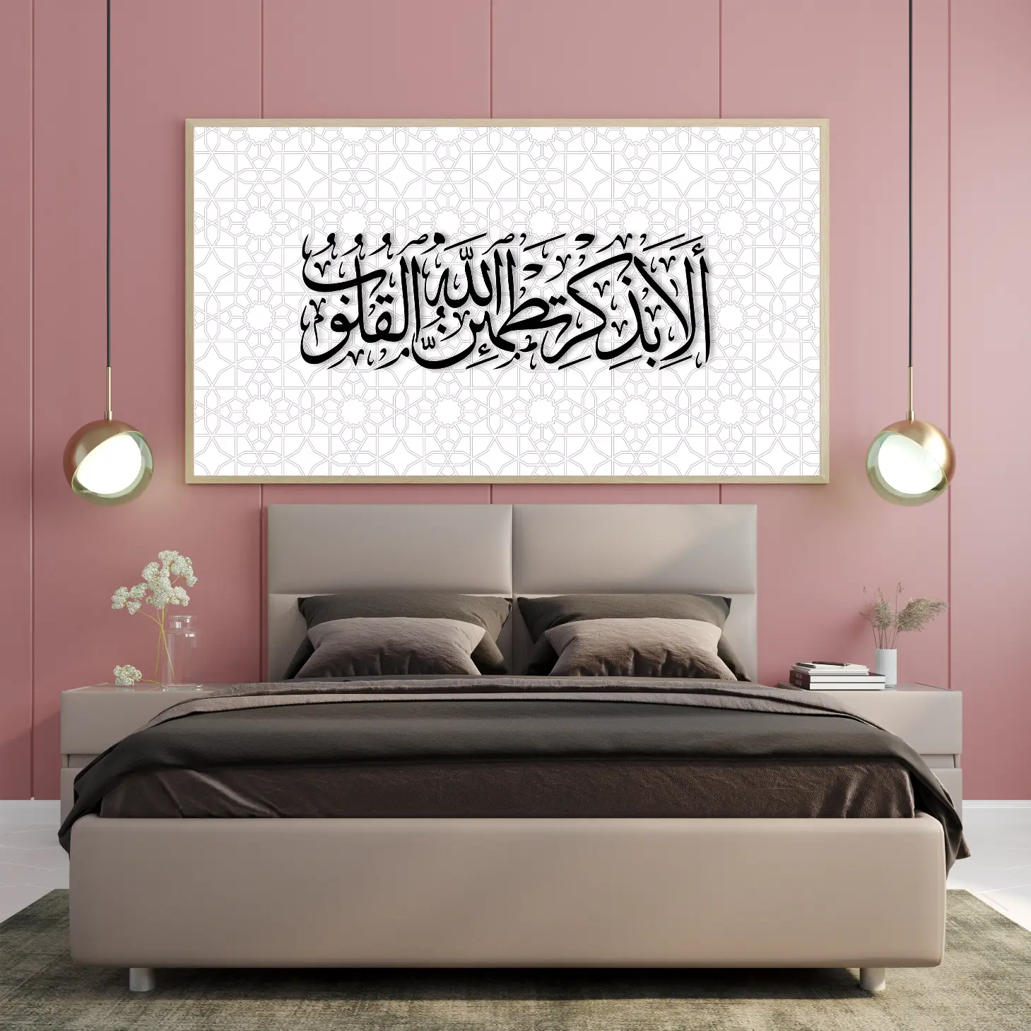 تتجلى في هذه القطعة الفنية عبارة “ألا بذكر الله تطمئن القلوب” بأسلوب يجمع بين الأصالة والحداثة، حيث تتناغم الخطوط العربية الجميلة مع الخلفية المزخرفة التي تضفي شعورًا بالسكينة والطمأنينة. إن هذه اللوحة ليست مجرد عنصر ديكور، بل هي تعبير عن الإيمان والروحانية، مما يجعلها إضافة مثالية لأي مساحة ترغب في تعزيز أجواءها بالهدوء والجمال.