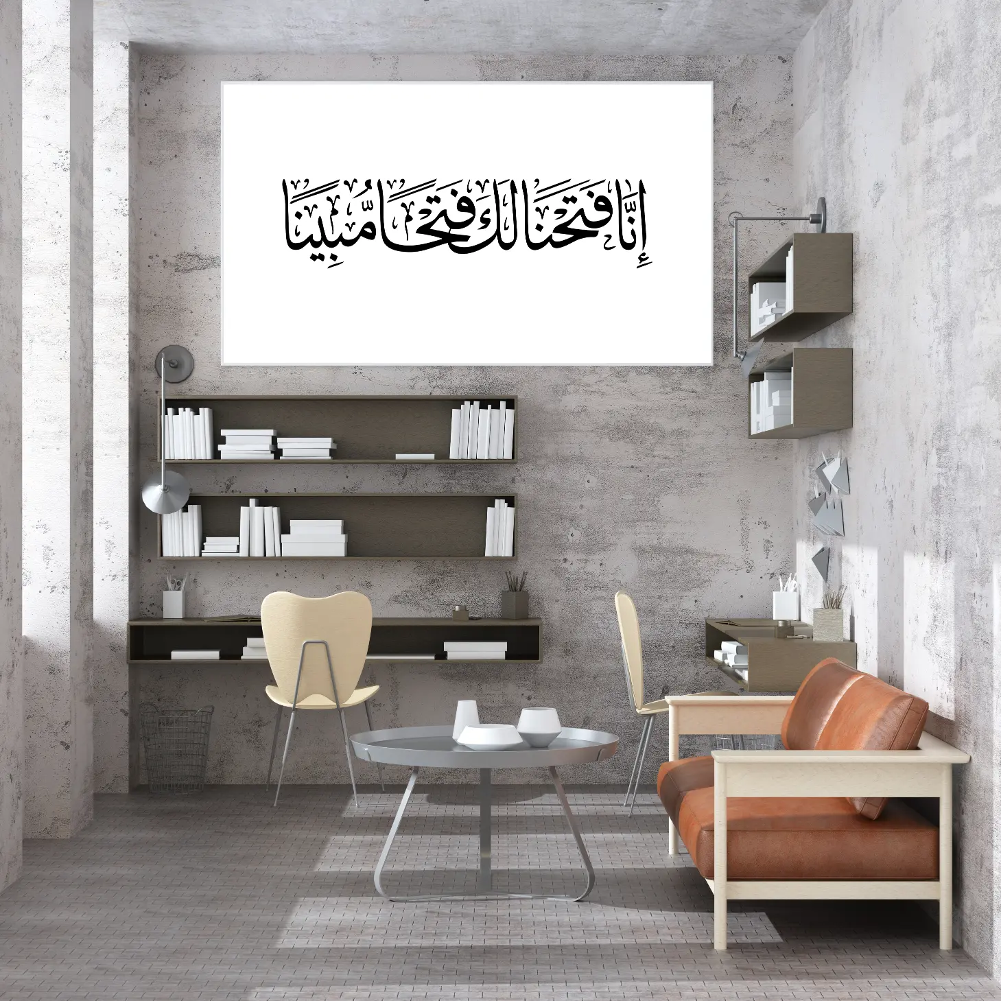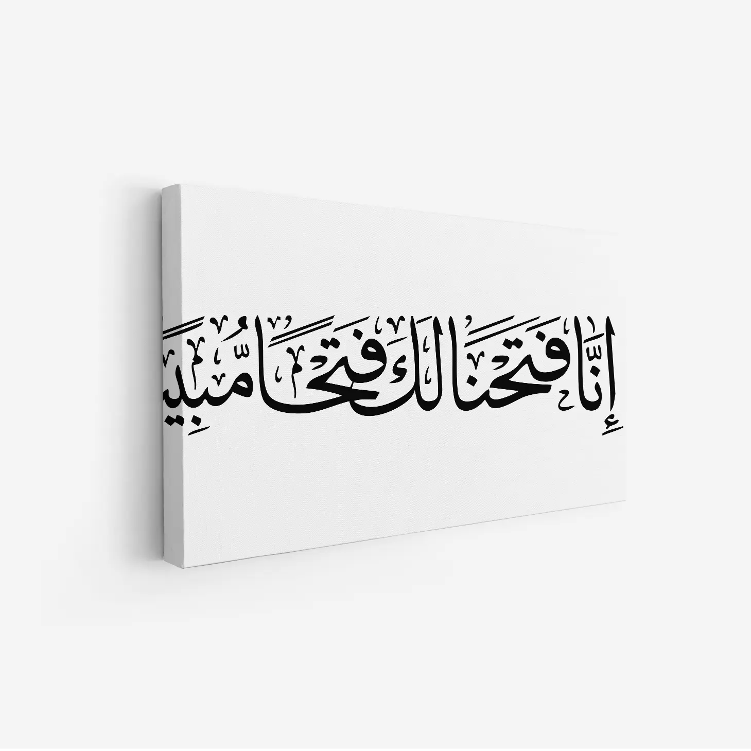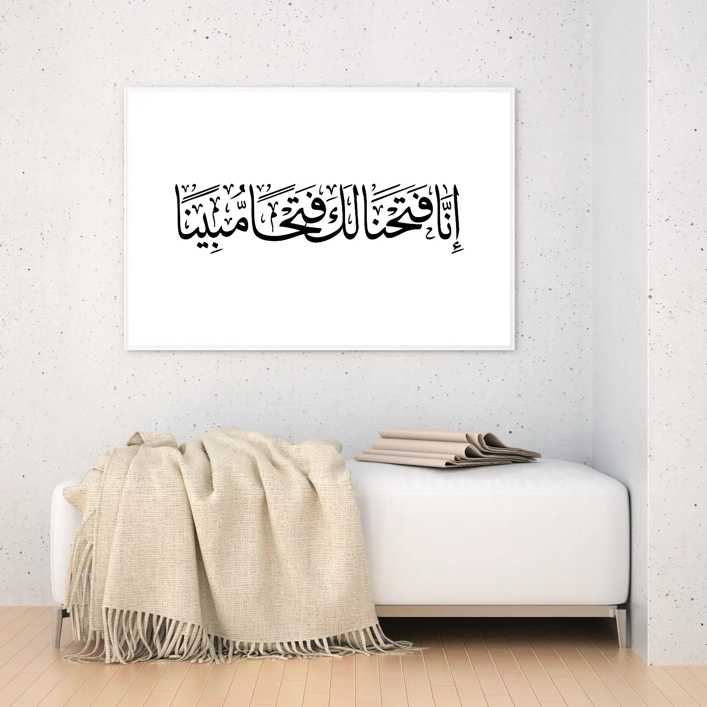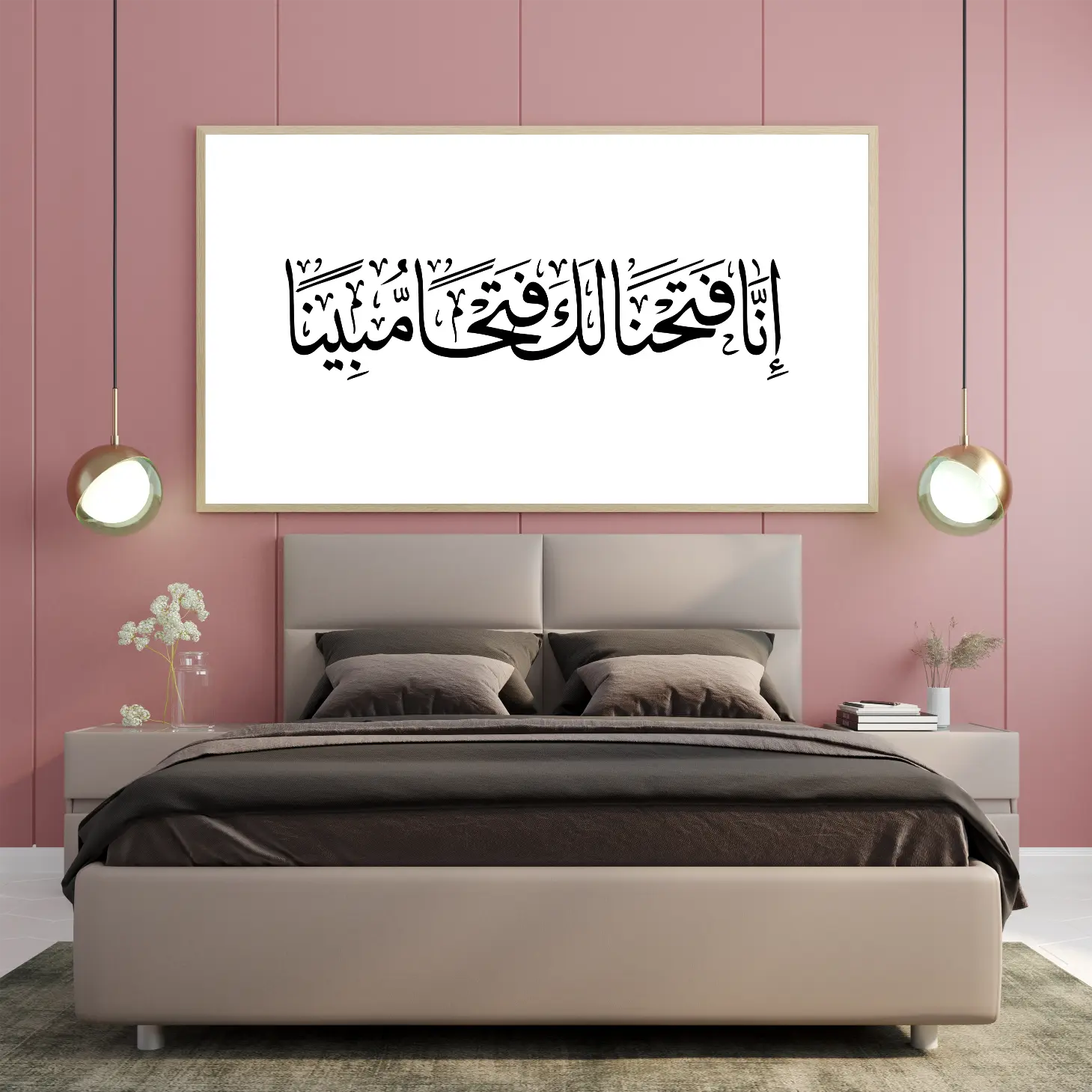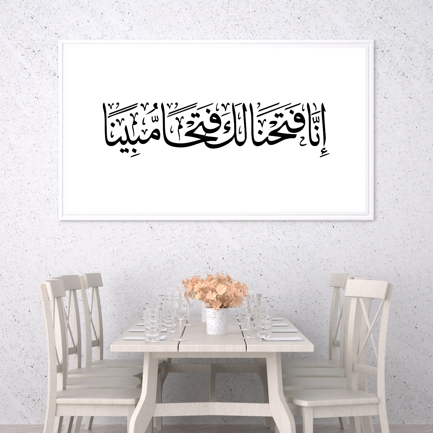 تتجلى في هذه اللوحة الفنية عبارة “إنّا فتحنا لك فتحًا مبينًا” بأسلوب خطي أنيق، مما يضفي على المكان أجواءً من السكينة والروحانية. تعكس هذه القطعة الفنية جماليات الفن الإسلامي، حيث تتناغم الأشكال والألوان لتخلق تأثيرًا بصريًا مميزًا. إن وجودها في أي مساحة يضيف لمسة من الرقي والعمق، مما يجعلها خيارًا مثاليًا لمن يسعى لإثراء ديكوره المنزلي أو المكتبي.