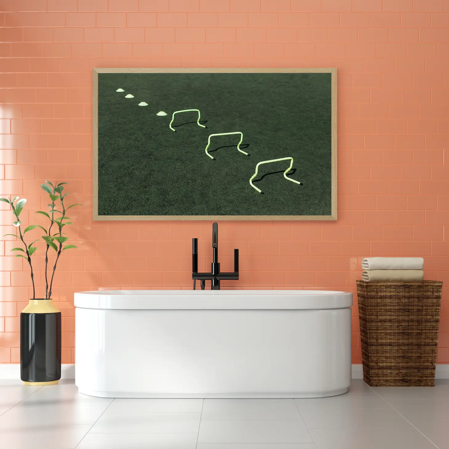 استمتع بجمال الحركة والرياضة مع هذه اللوحة الفريدة التي تبرز حواجز التدريب في تناغم مثير على أرضية خضراء. تتوفر بمقاسات متعددة وإطارات أنيقة، مما يجعلها خيارًا راقيًا يُقدَّم بثقة في المناسبات الخاصة، لتكون هدية تعبّر عن الذوق الرفيع. اجعل من جدران منزلك أو مكتبك لوحة تعكس شغفك بالحياة النشطة.