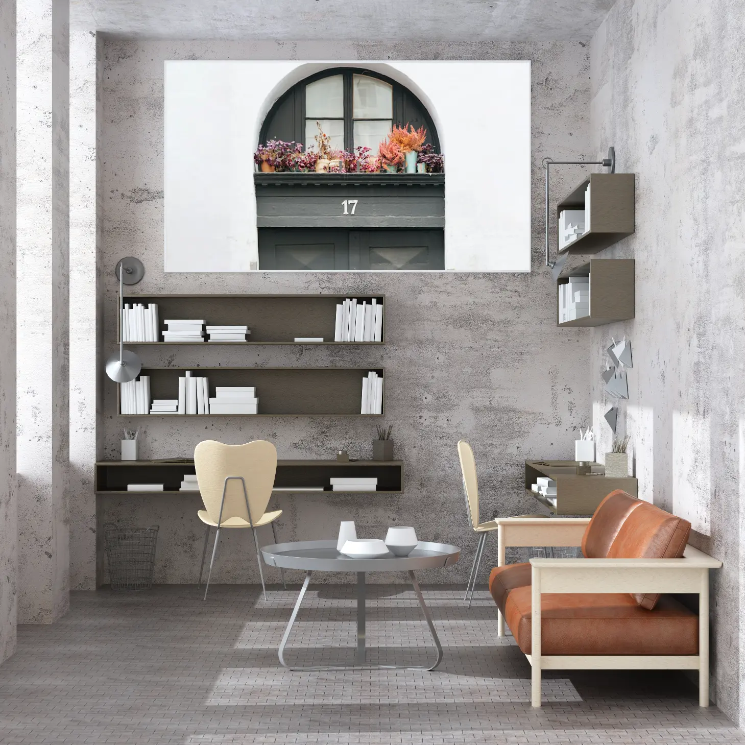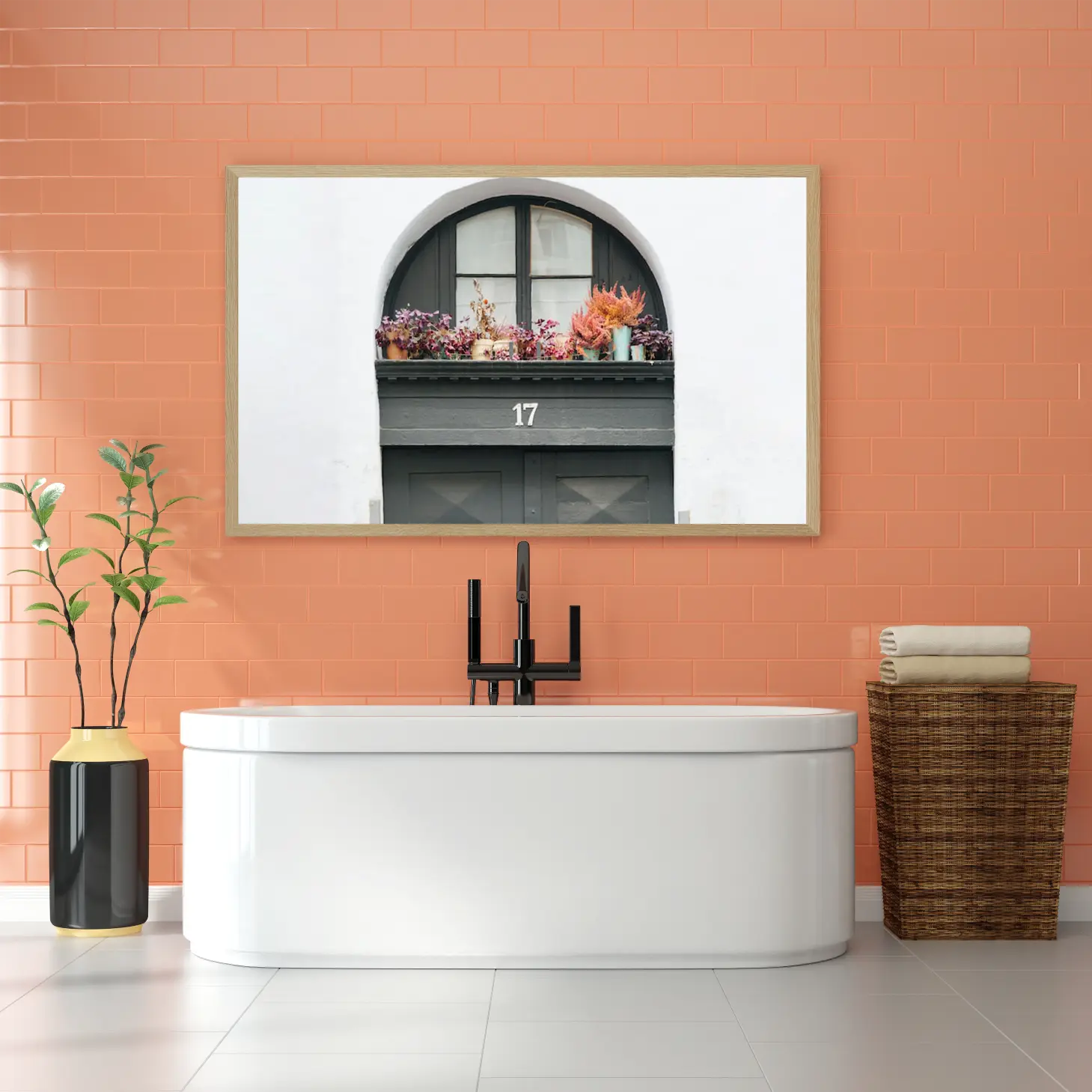 تتجلى في هذه اللوحة جماليات الحياة اليومية، حيث تبرز شرفة مزهرة تحمل الرقم 17، محاطة بألوان زاهية من الأزهار والنباتات. تعكس هذه المشهد روح الطبيعة في تناغمها مع العمارة، مما يضفي شعورًا بالهدوء والسكينة على المكان. إن وجود هذه القطعة الفنية في أي مساحة يساهم في خلق أجواء دافئة ومريحة، مما يجعلها مثالية لإضفاء لمسة من الحيوية على الديكور المنزلي.