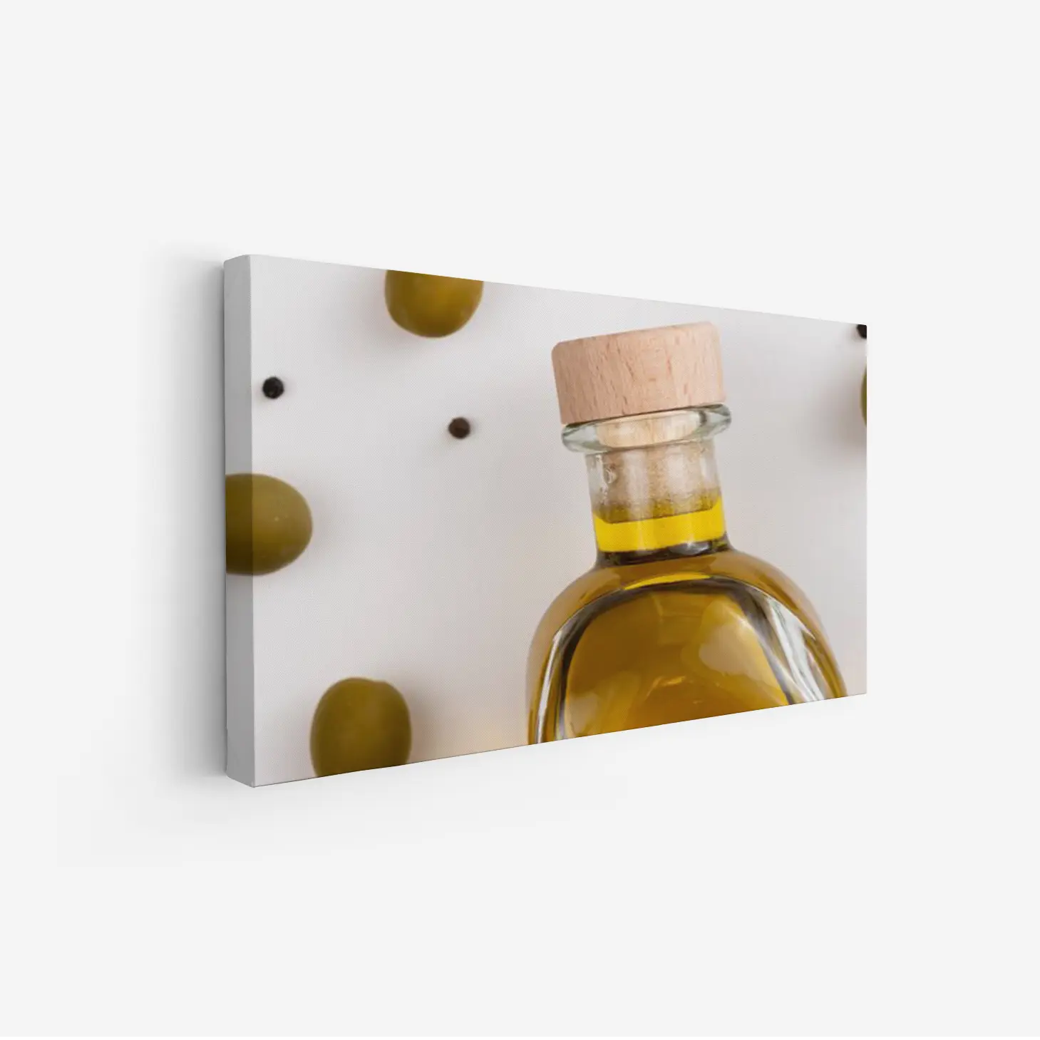 لوحة زيتون – زجاجة زيت – خلفية بيضاء – هادئ – لوحات حائط – لوحات كانفاس، لوحات جدارية