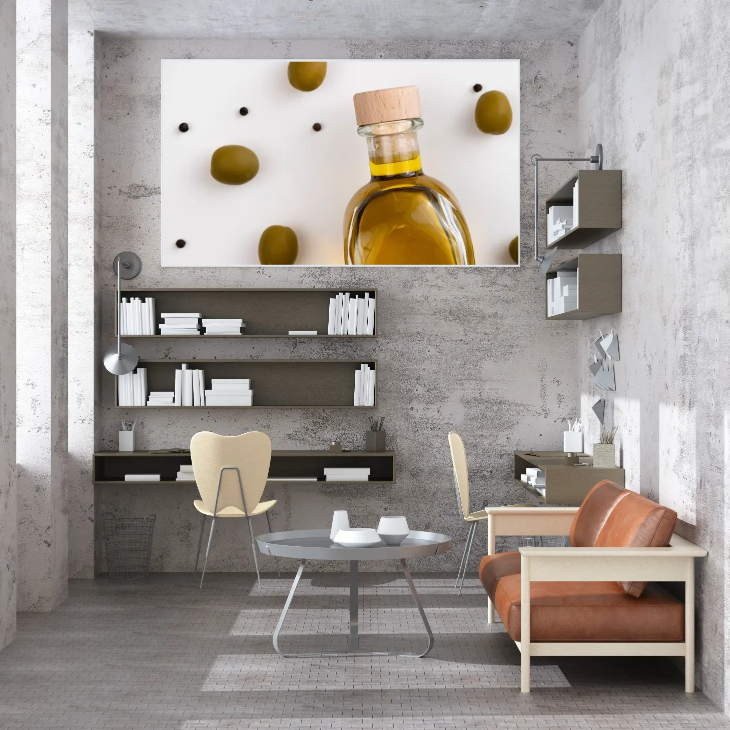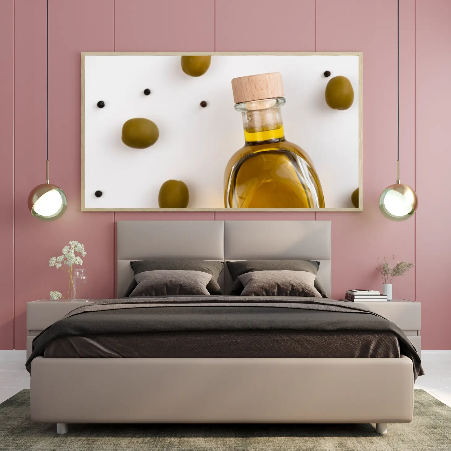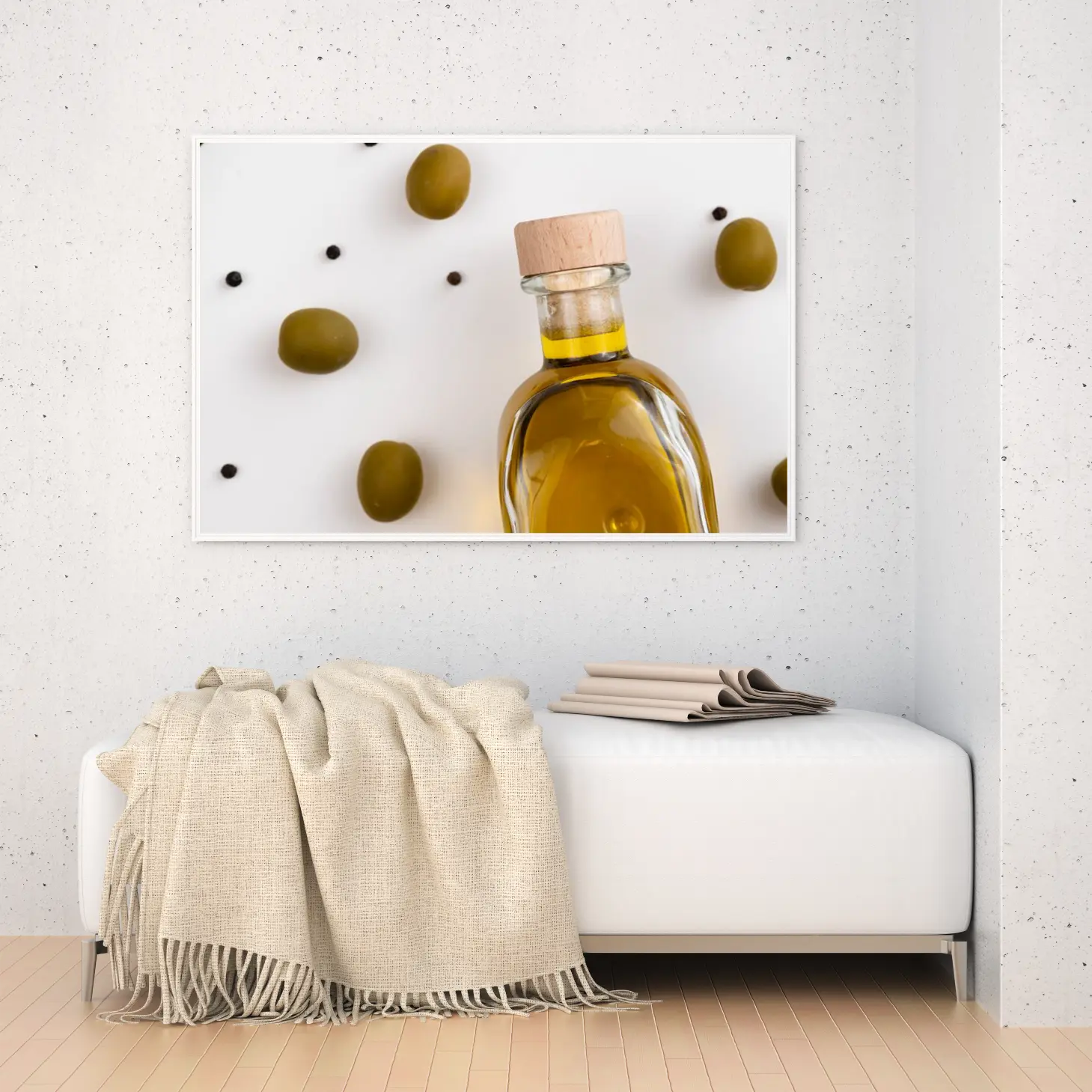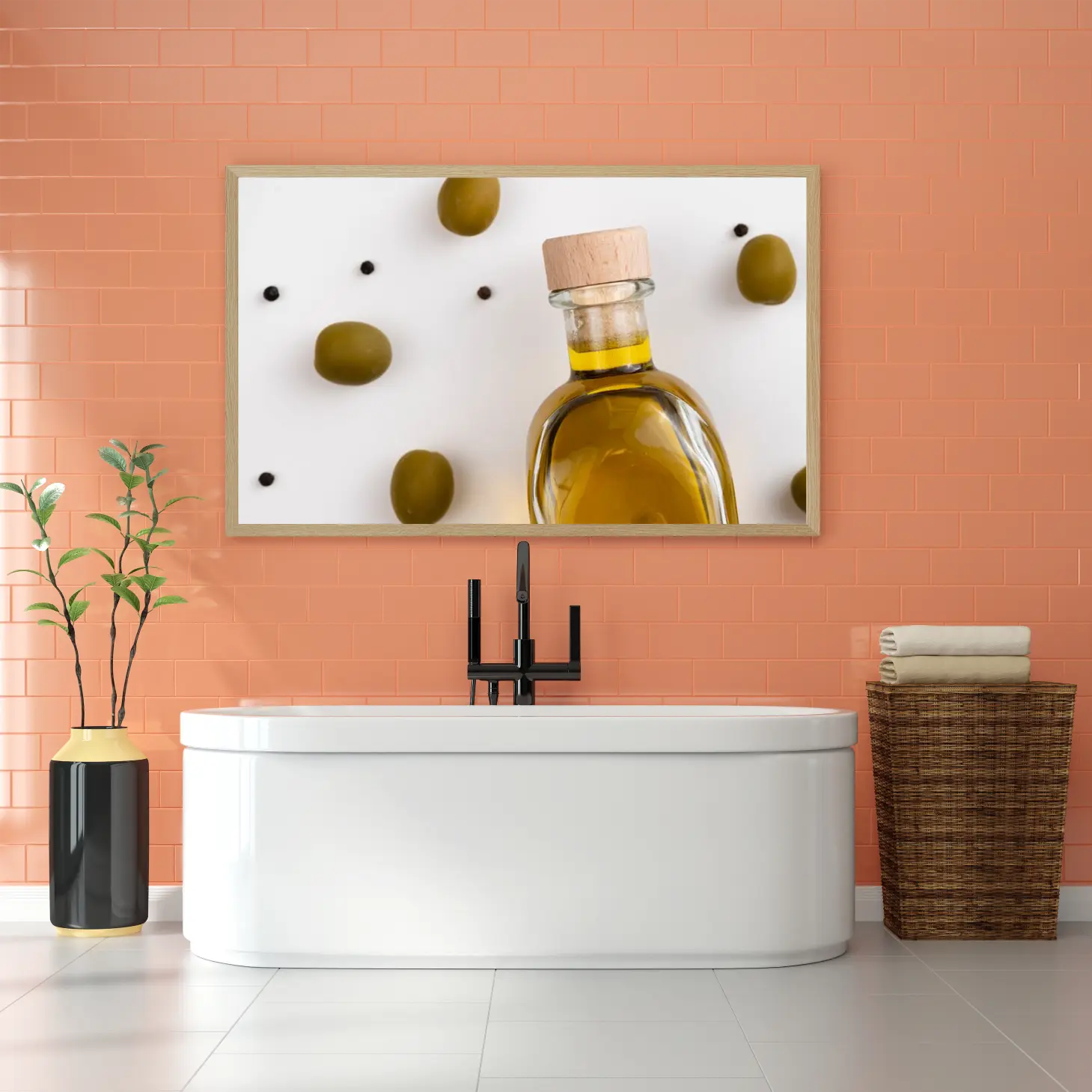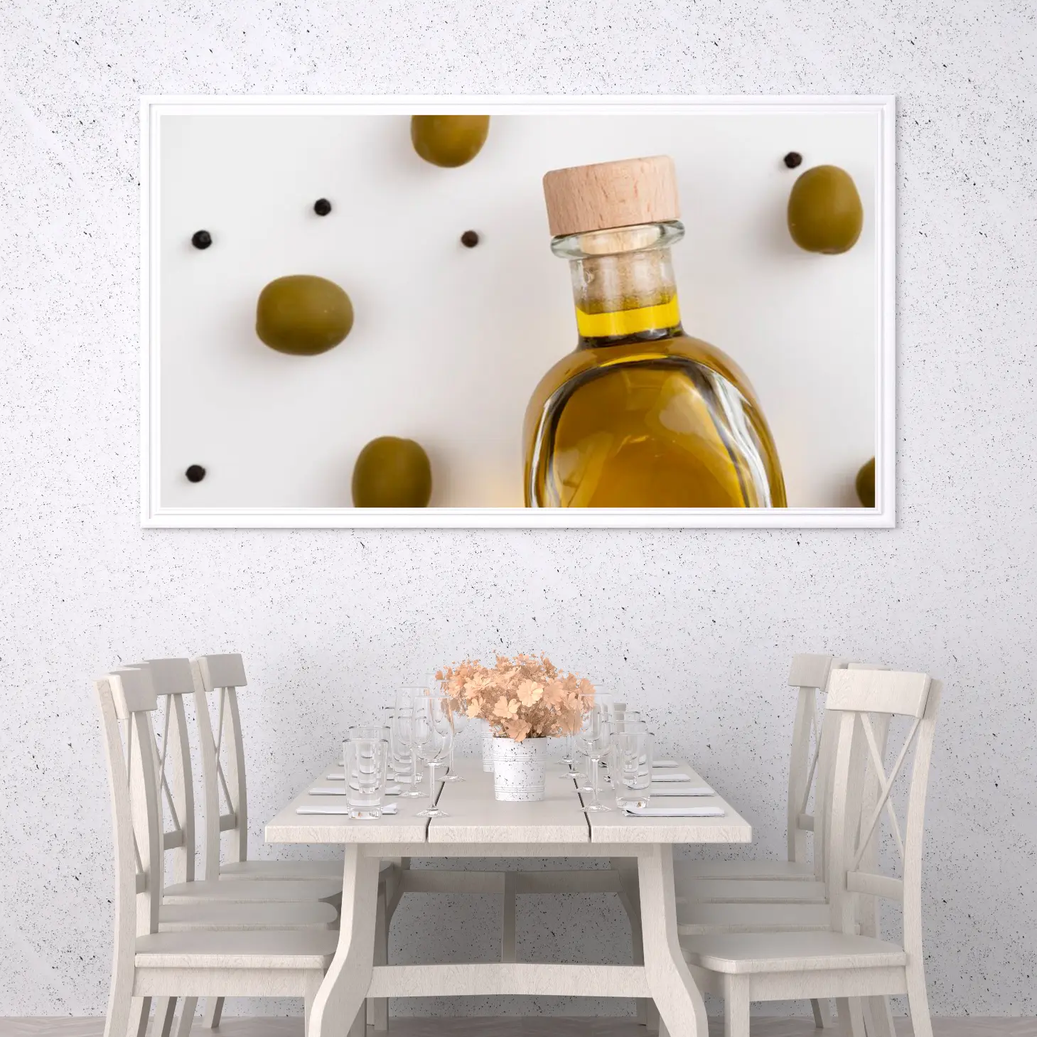 تتجلى في هذه اللوحة الفنية لمسة من الأناقة البسيطة، حيث تتوسط زجاجة زيت الزيتون الشفافة محاطة بحبات الزيتون الخضراء. تعكس الألوان الدافئة للزيت واللون الزاهي للزيتون شعورًا بالانتعاش والحيوية، مما يضفي على المكان أجواءً مريحة ومليئة بالحياة. هذه القطعة ليست مجرد ديكور جداري، بل هي تعبير عن نمط حياة صحي ومتناغم، مما يجعلها خيارًا مثاليًا لمن يسعى لإضفاء لمسة فنية على منزله.
