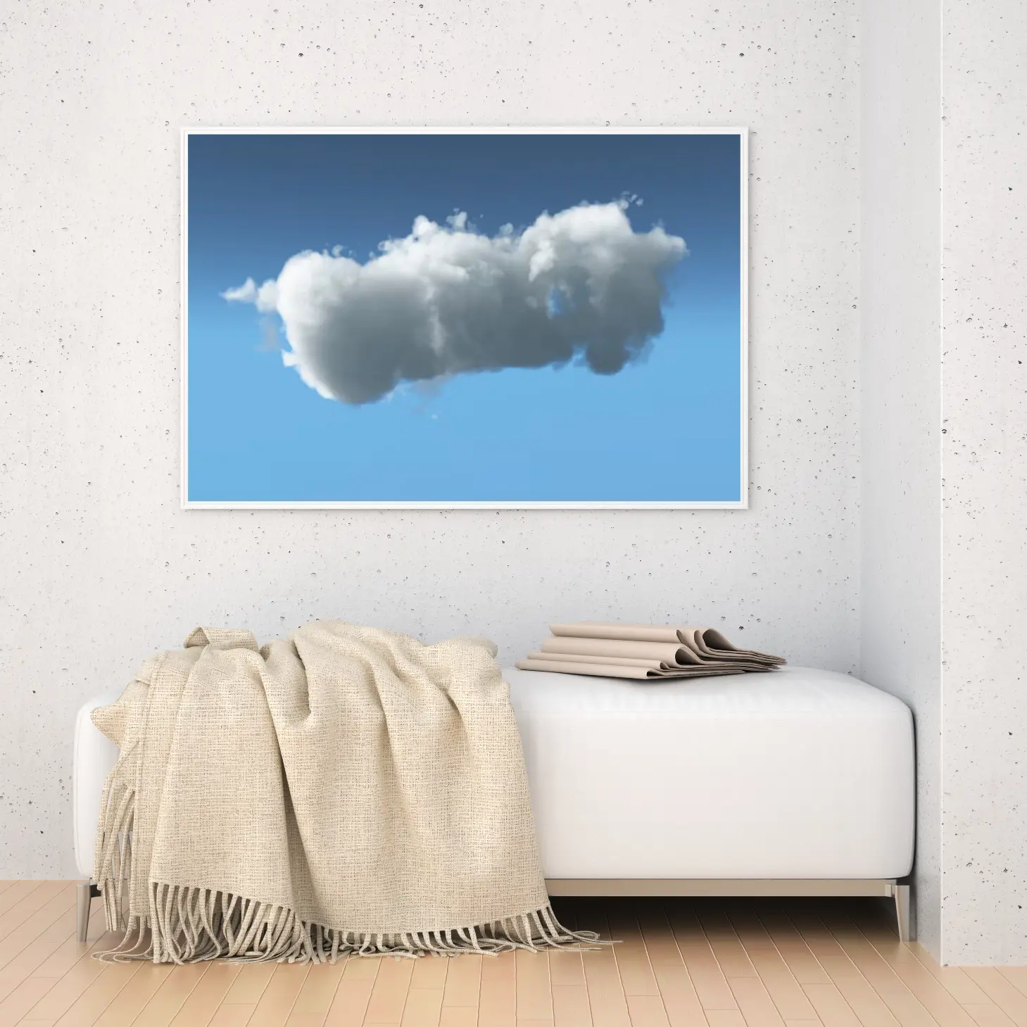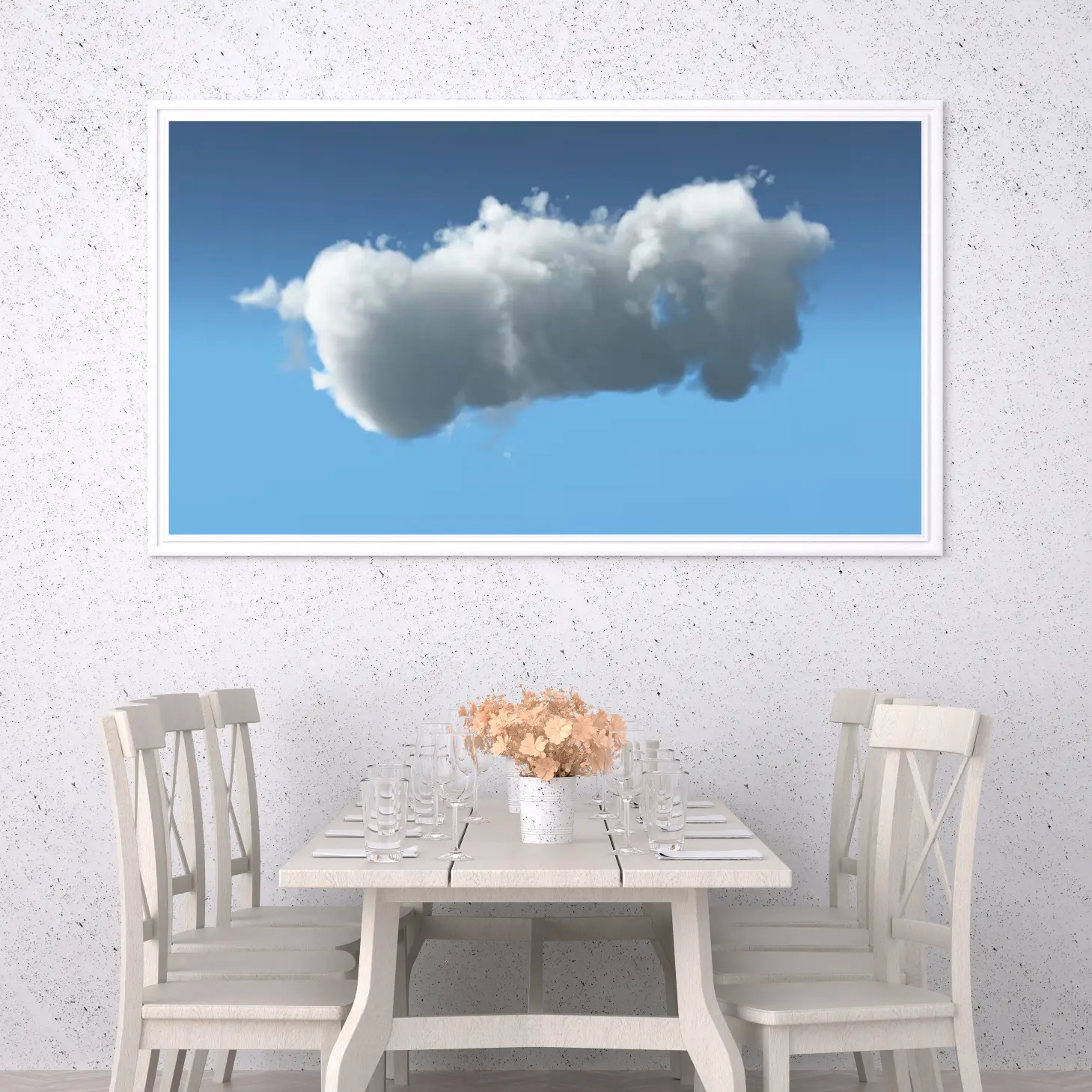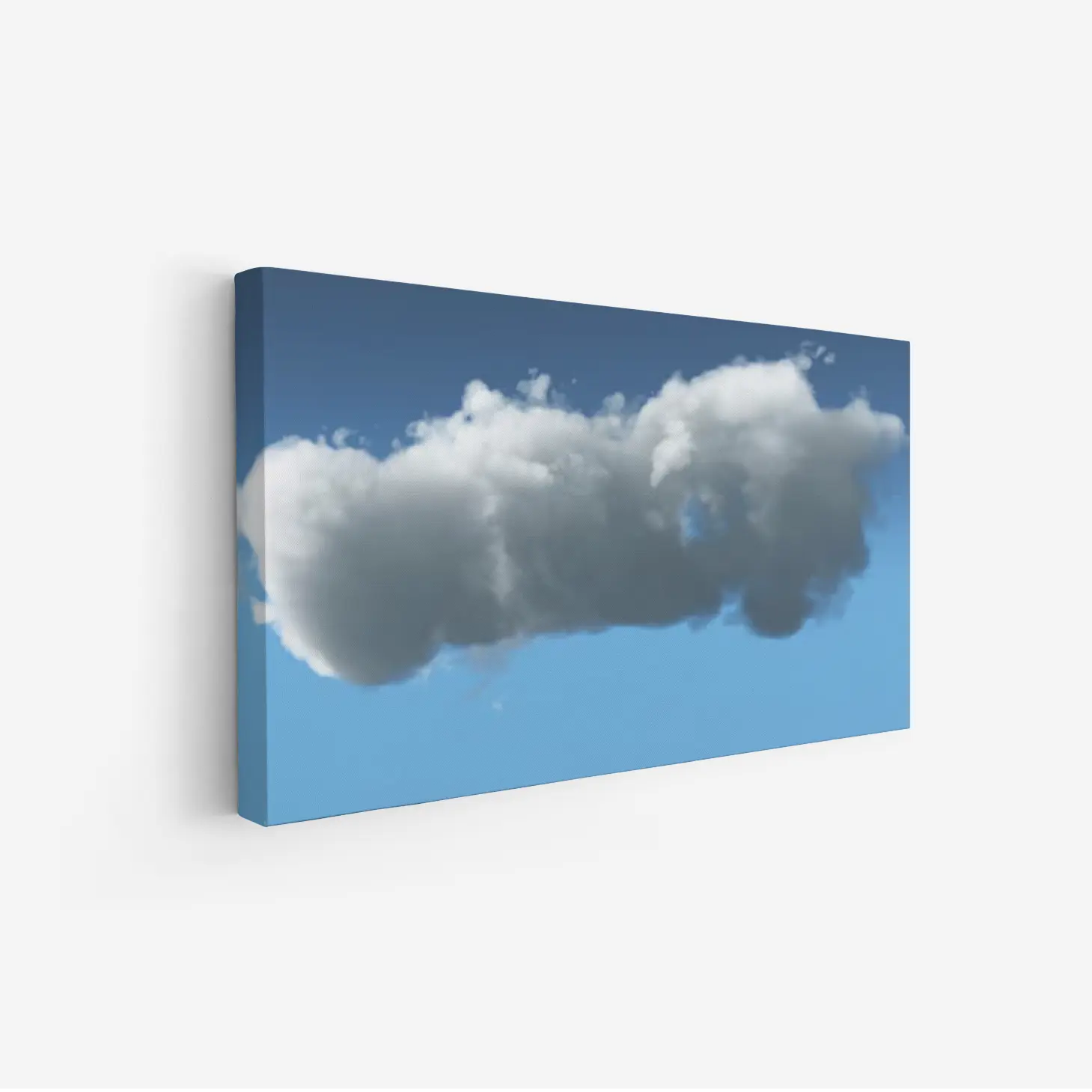 لوحة سحاب بيضاء تتدلى في سماء زرقاء صافية، تعكس شعور الهدوء والسكينة، لوحات طبيعة، لوحات كانفاس.