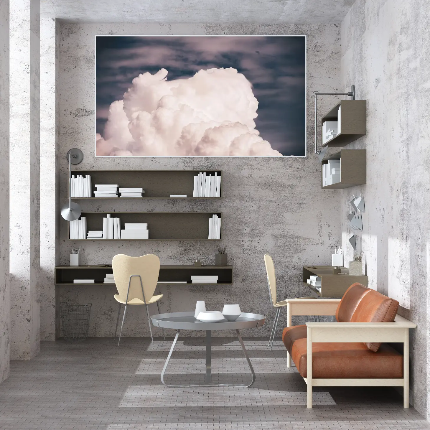 لوحة سحاب بيضاء تتناثر في سماء زرقاء مع لمسات من اللون الرمادي، جو هادئ ومريح، لوحات طبيعة، لوحات كانفاس أنيقة