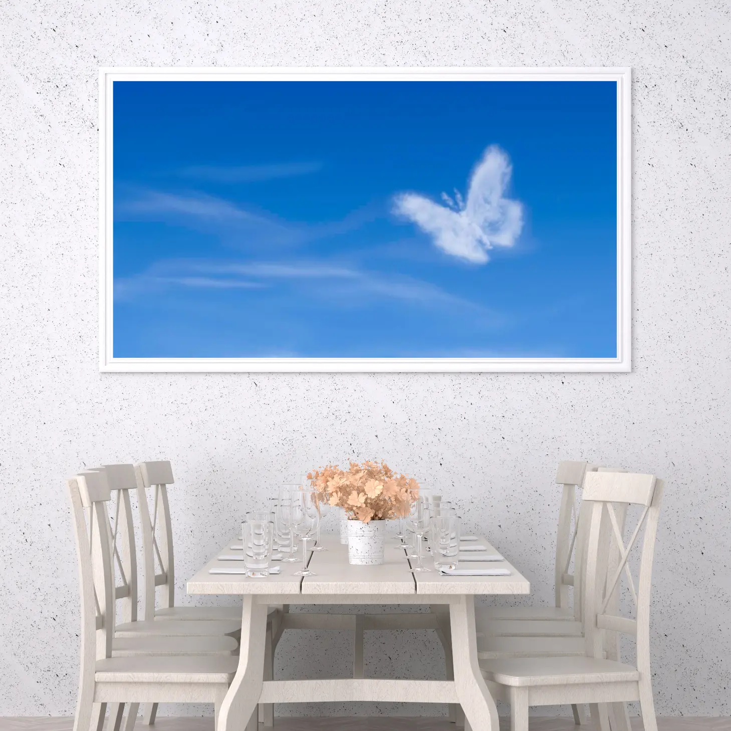 تتجلى في هذه اللوحة جماليات السماء الزرقاء الصافية، حيث تتناغم الألوان بشكل رائع لتخلق أجواء من السكينة والهدوء. يظهر في وسط المشهد شكل فراشة تتكون من السحب، مما يضفي لمسة من السحر والخيال. هذه اللوحة ليست مجرد عنصر ديكور، بل هي تعبير عن نمط حياة يركز على الجمال والراحة النفسية، مما يجعلها إضافة مثالية لأي مساحة.