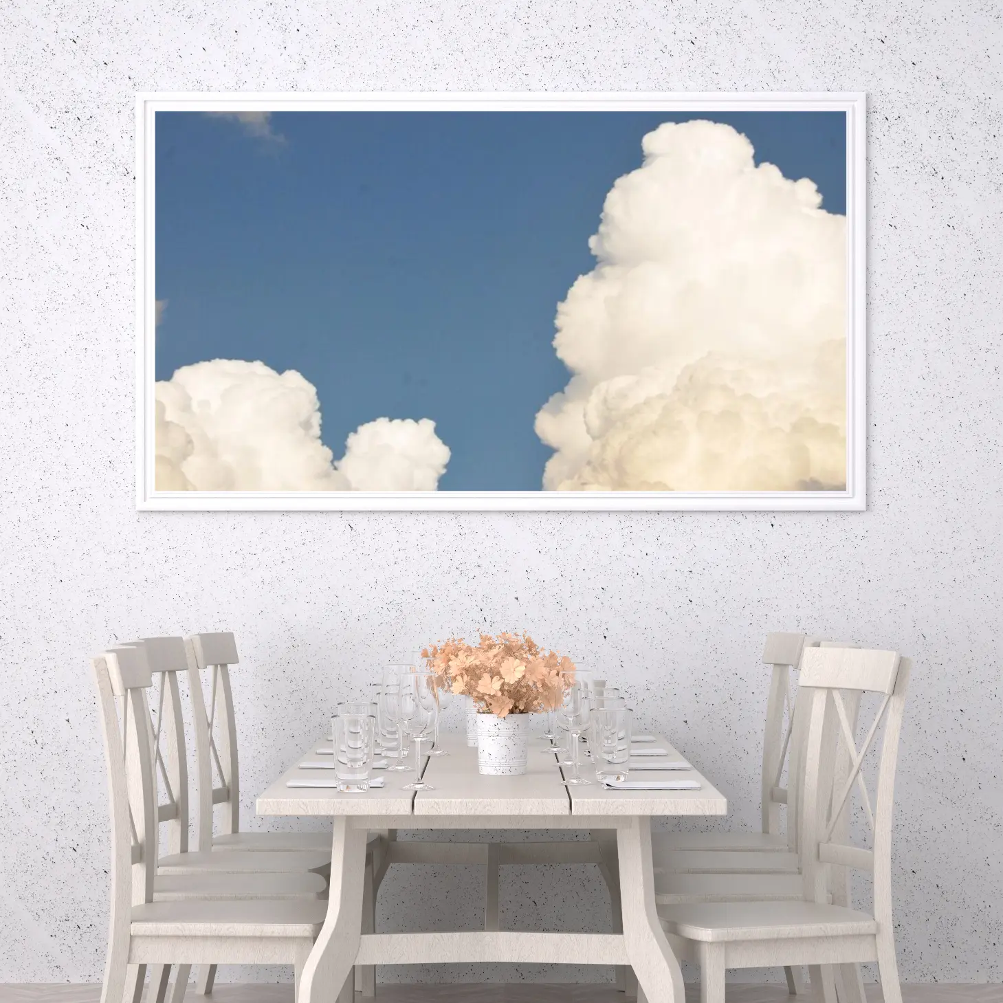 استمتع بجمال السماء الصافية والسحب البيضاء المبهجة مع هذه اللوحة الفاخرة، التي تضفي لمسة من الأناقة على أي مساحة. تتوفر بمقاسات متعددة وإطارات متنوعة، مما يجعلها خيارًا مثاليًا لتزيين منزلك أو مكتبك، أو كهدية تعبّر عن الذوق الرفيع في المناسبات الخاصة. اجعل كل لحظة مميزة مع هذا العمل الفني الرائع الذي يجسد صفاء السماء وجمالها.