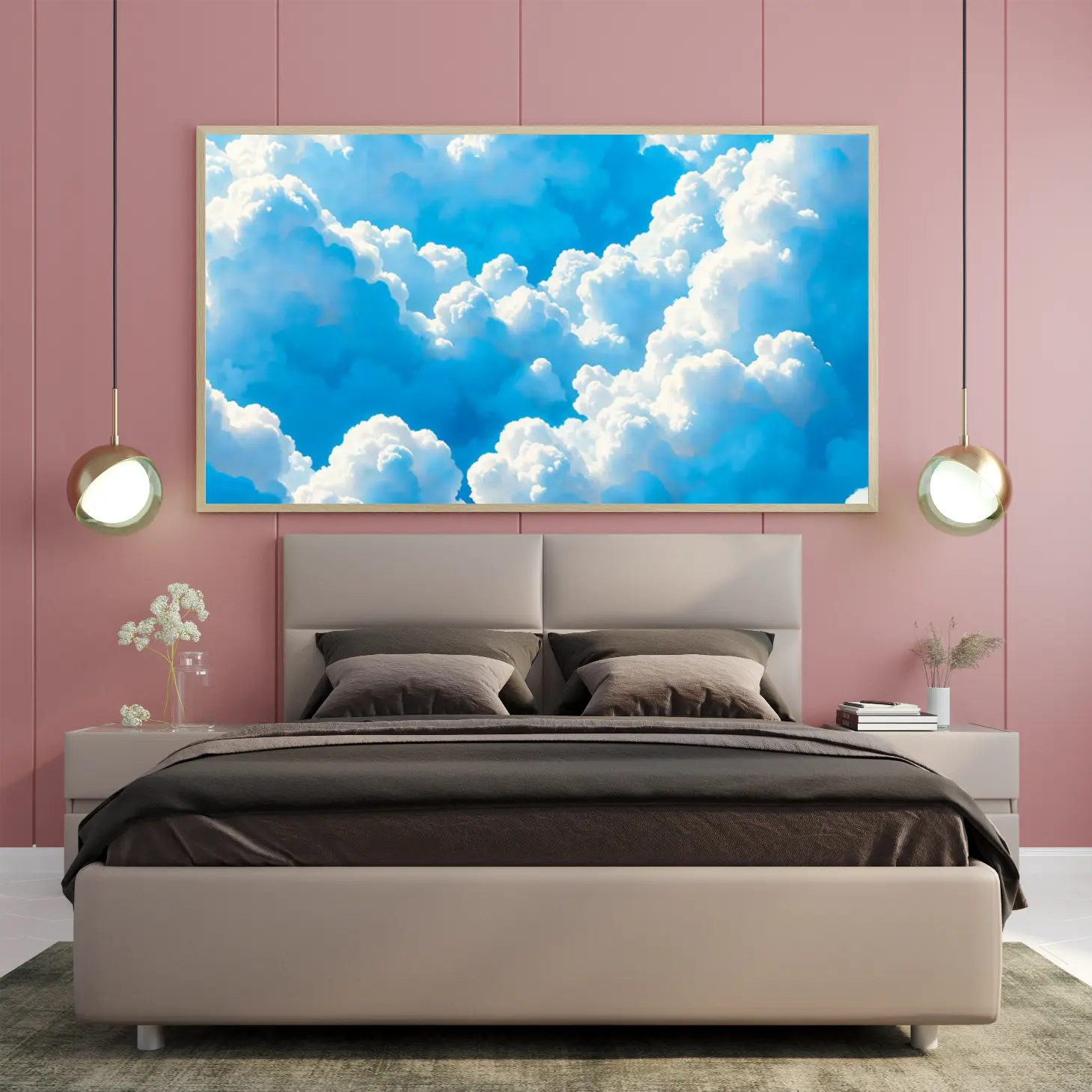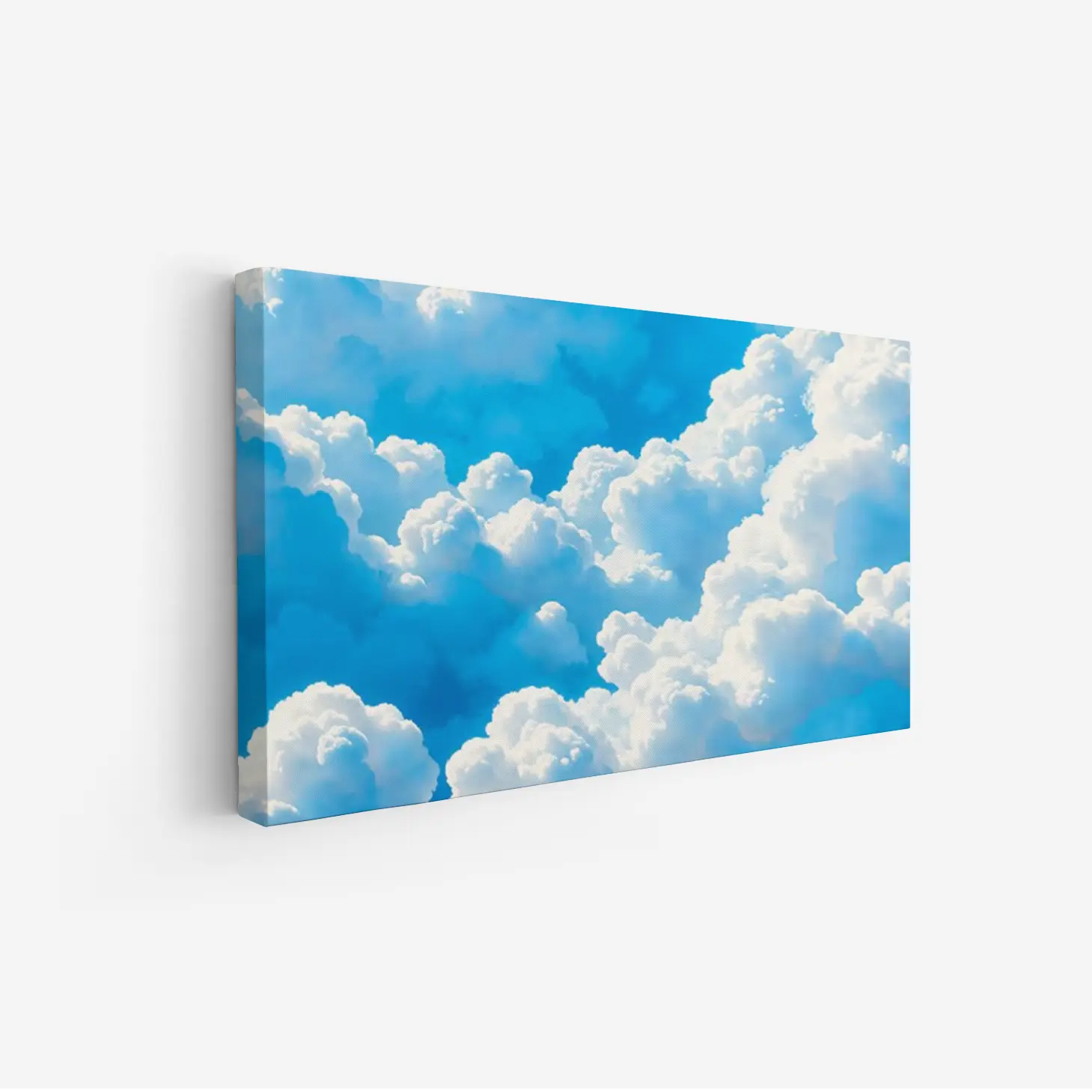 لوحة سماء زرقاء مليئة بالسحب البيضاء الناعمة تعكس شعور الهدوء والسلام، لوحات طبيعة، لوحات كانفاس.
