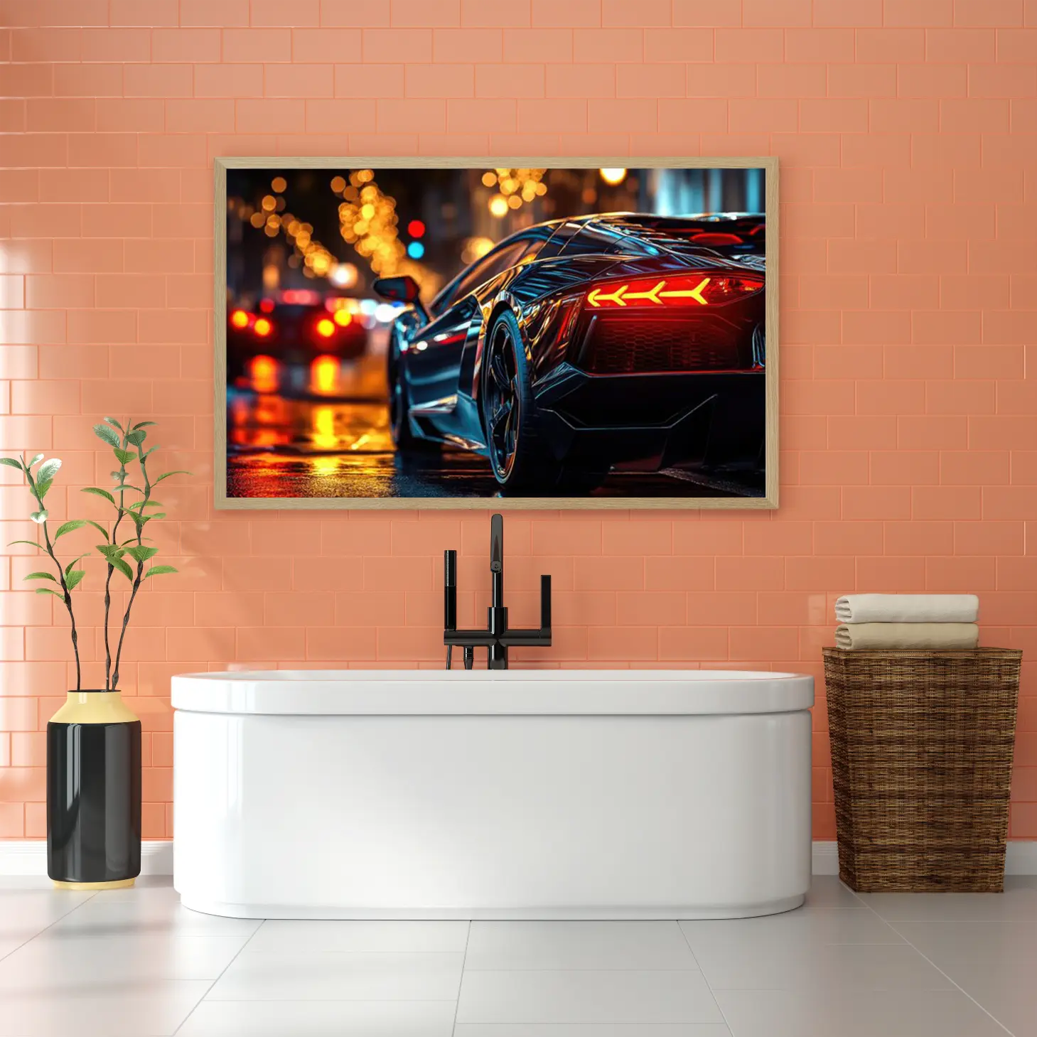 تتجلى في هذه اللوحة الفنية الرائعة صورة لسيارة لامبورغيني أنيقة، تتألق بألوانها الداكنة اللامعة وسط أجواء حضرية نابضة بالحياة. تعكس الأضواء المتلألئة في الخلفية روح المدينة الحديثة، مما يضفي إحساسًا بالحركة والديناميكية. إن هذه القطعة الفنية ليست مجرد إضافة جمالية، بل هي تجسيد لأسلوب حياة متطور يعكس الذوق الرفيع والطموح.