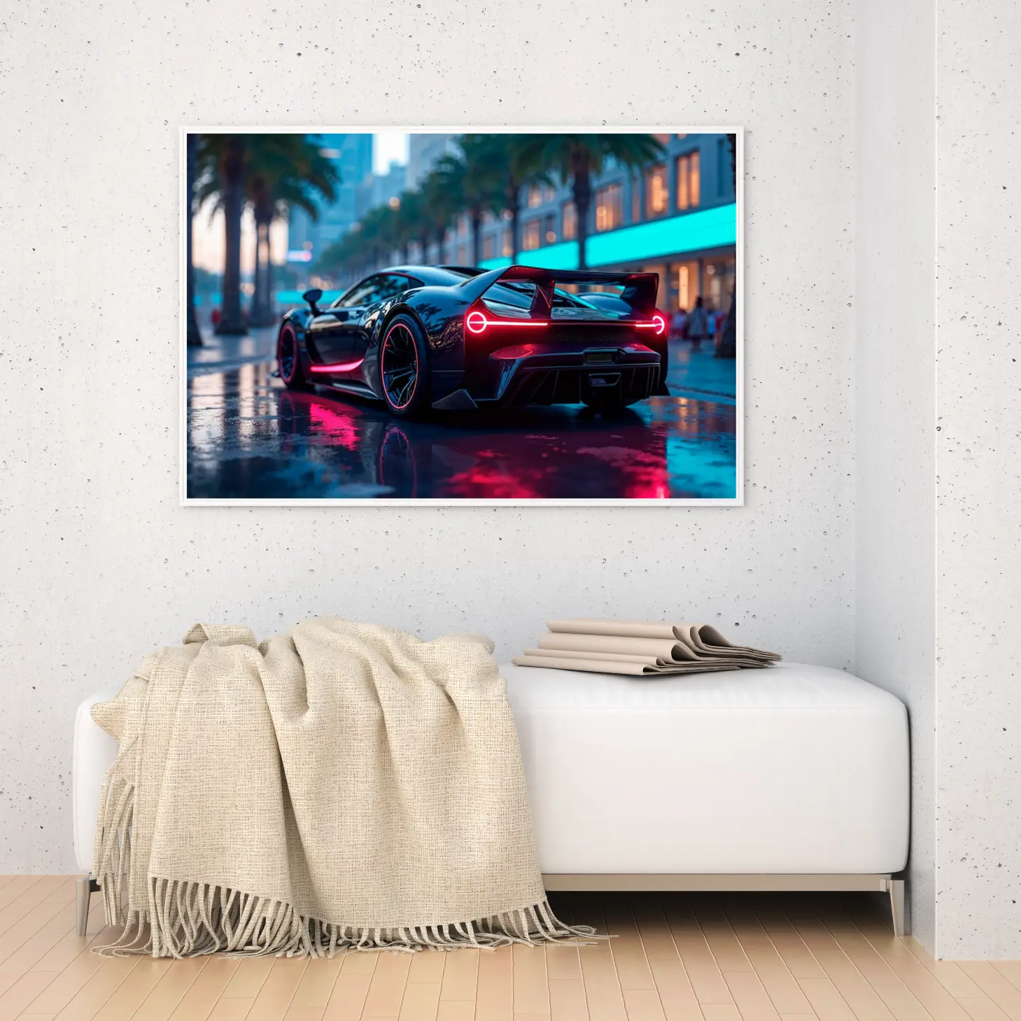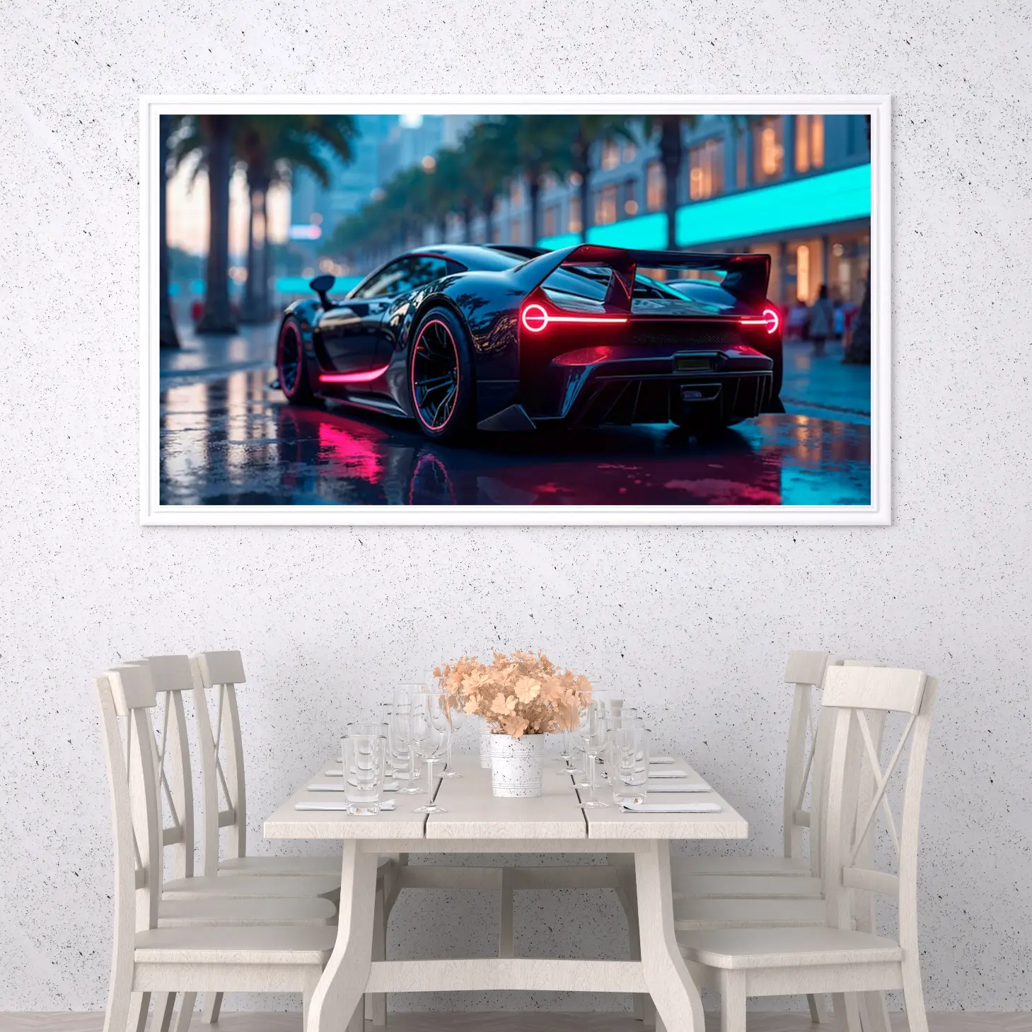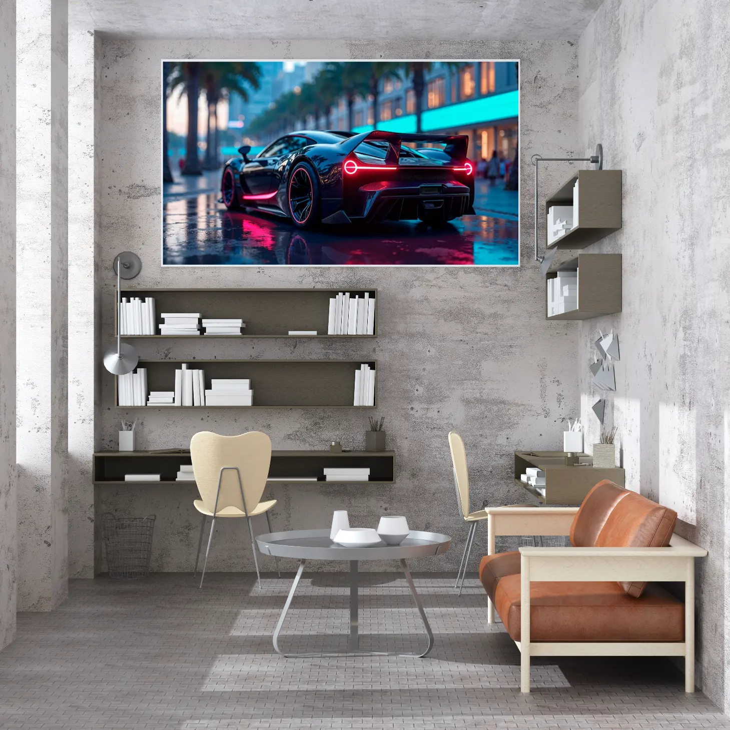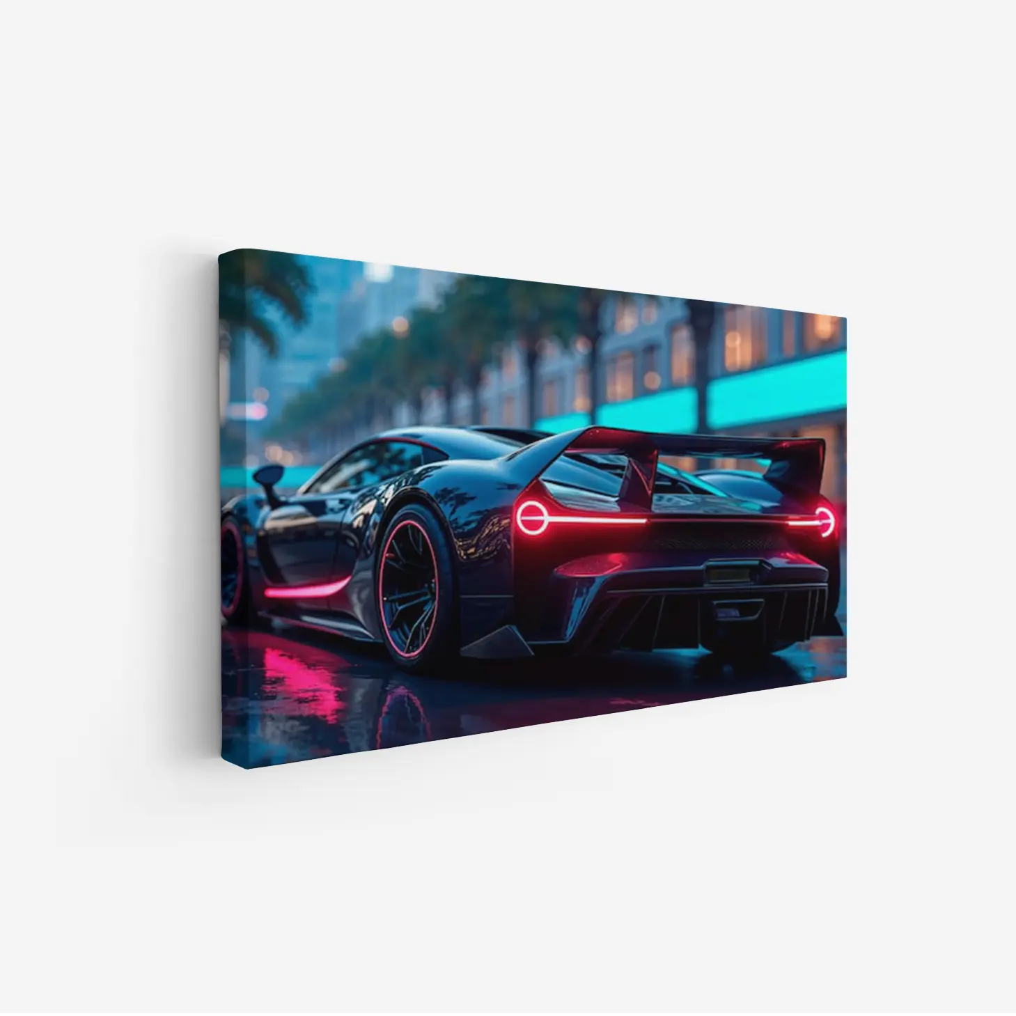 تتجلى في هذه اللوحة الفنية مشهدٌ عصري يجسد جماليات السرعة والتكنولوجيا، حيث تتألق السيارة السوداء اللامعة في أجواء المدينة المتلألئة. تعكس الأضواء الملونة على الأسطح اللامعة، مما يضفي إحساسًا بالحيوية والديناميكية. تنقل اللوحة إحساسًا بالتحرر والطموح، مما يجعلها إضافة مثالية لأي مساحة ترغب في تعزيز أجوائها بالطاقة والإلهام.