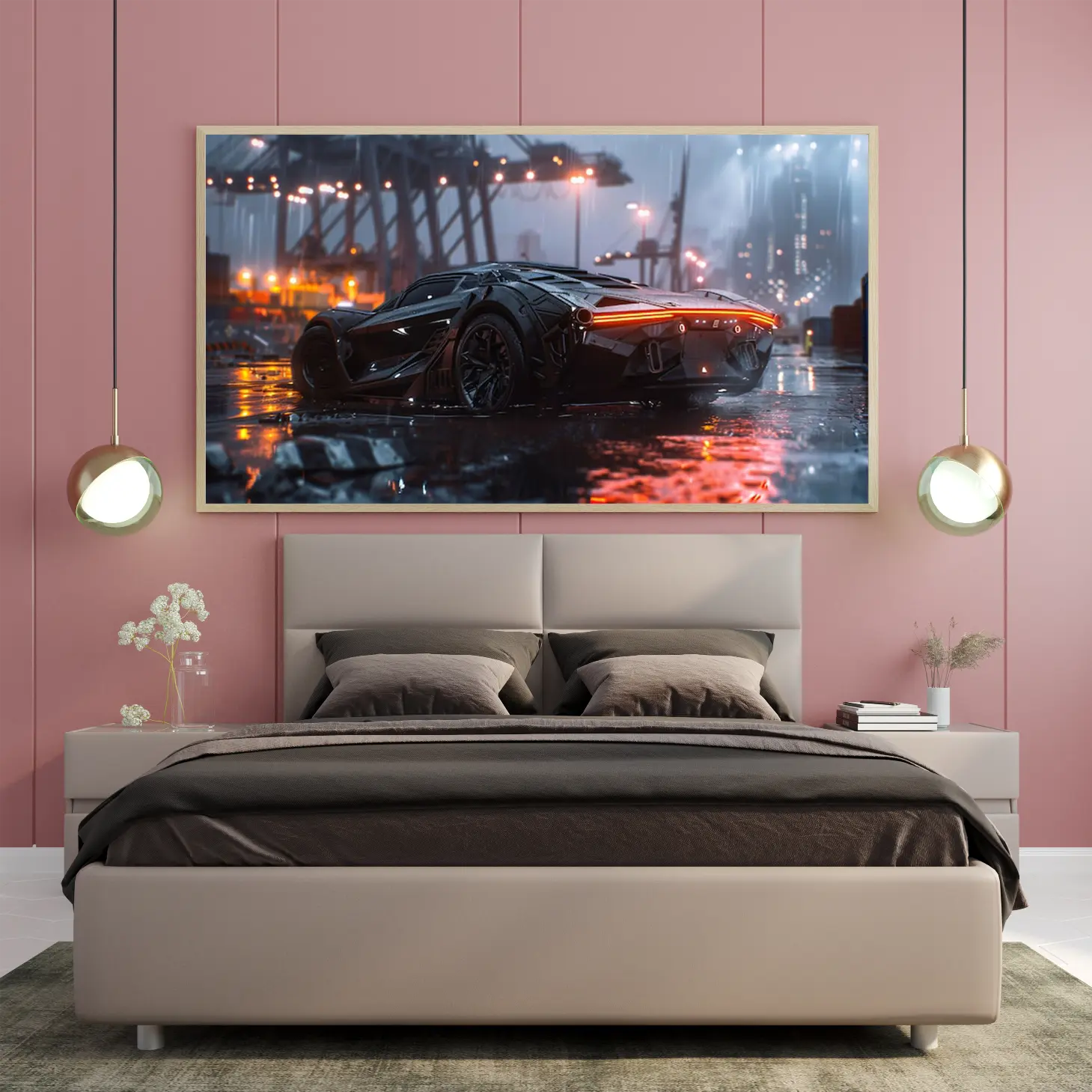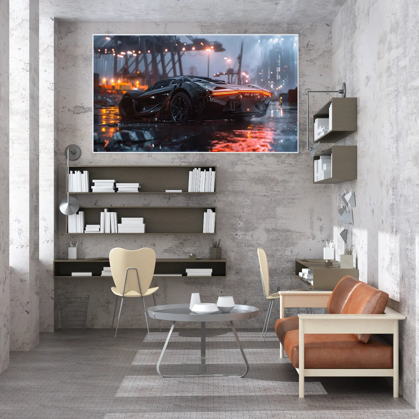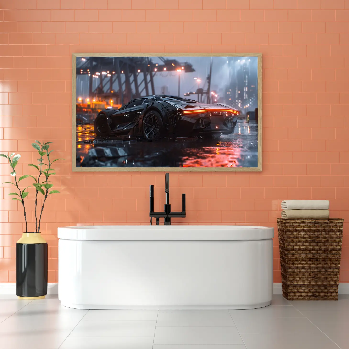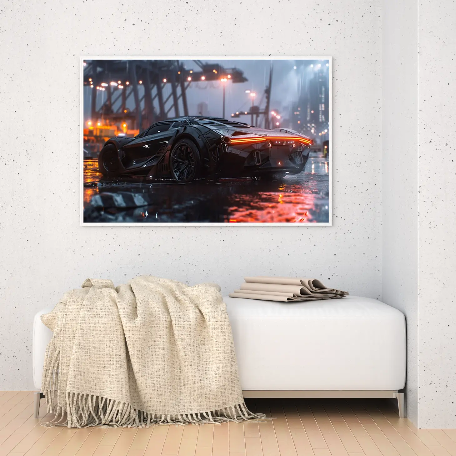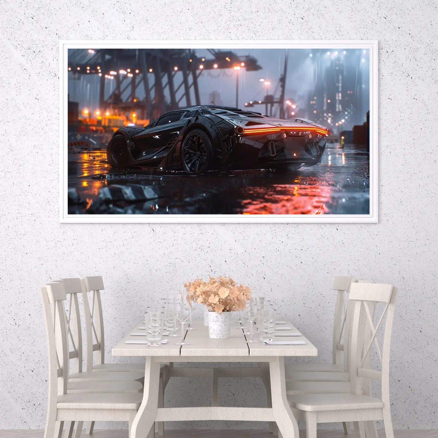 تجسد هذه اللوحة الفنية مشهدًا عصريًا يجمع بين القوة والجمال، حيث تتألق سيارة فاخرة بتصميمها الديناميكي في أجواء مدينة حديثة تحت زخات المطر. تعكس الأضواء المتلألئة من حولها لمسات من الأناقة والتكنولوجيا المتقدمة، مما يضفي على المكان إحساسًا بالحداثة والحيوية. إن هذا العمل الفني ليس مجرد قطعة ديكور، بل هو تعبير عن أسلوب حياة متفرد يلفت الأنظار ويثير الإعجاب.
